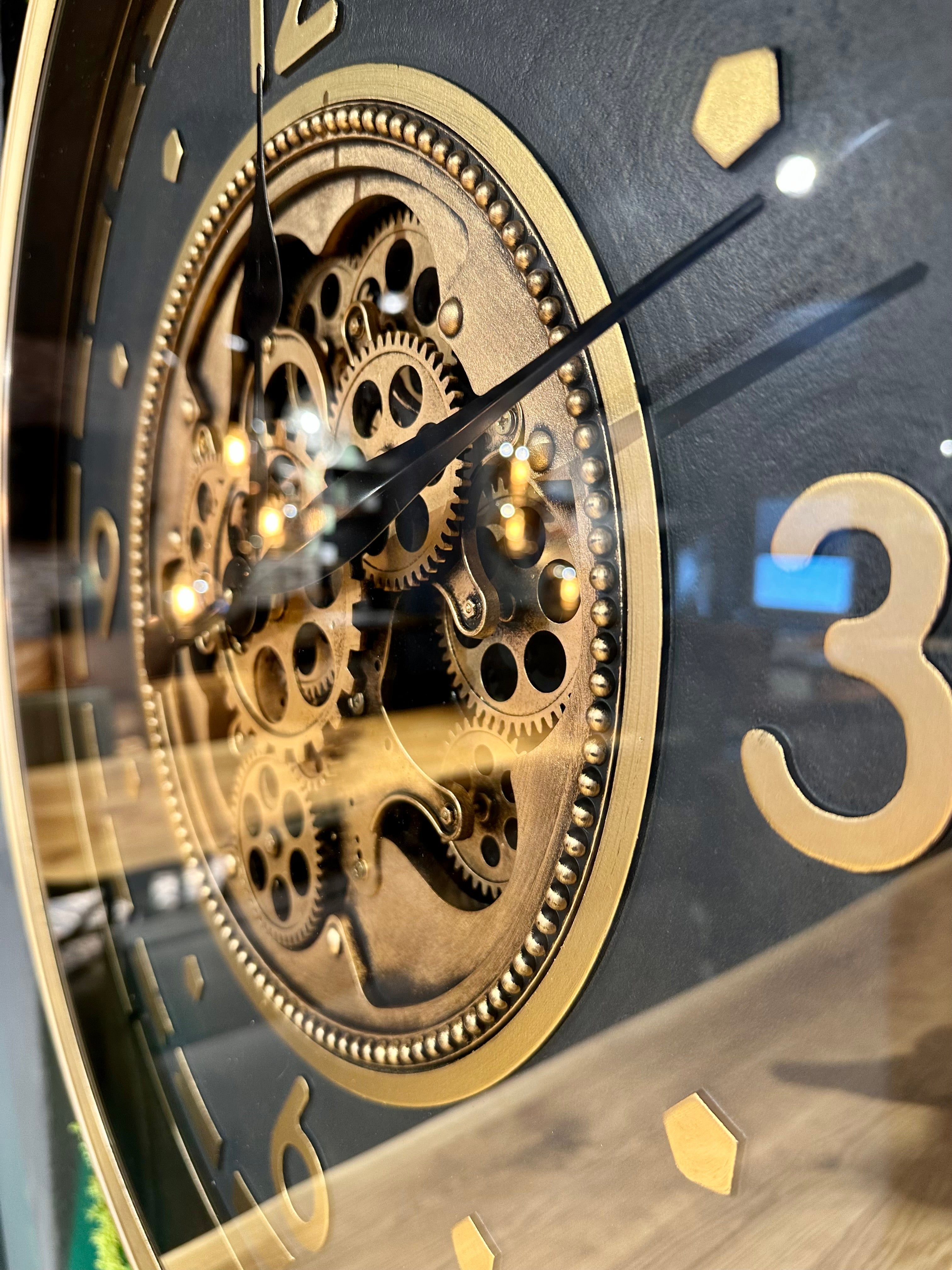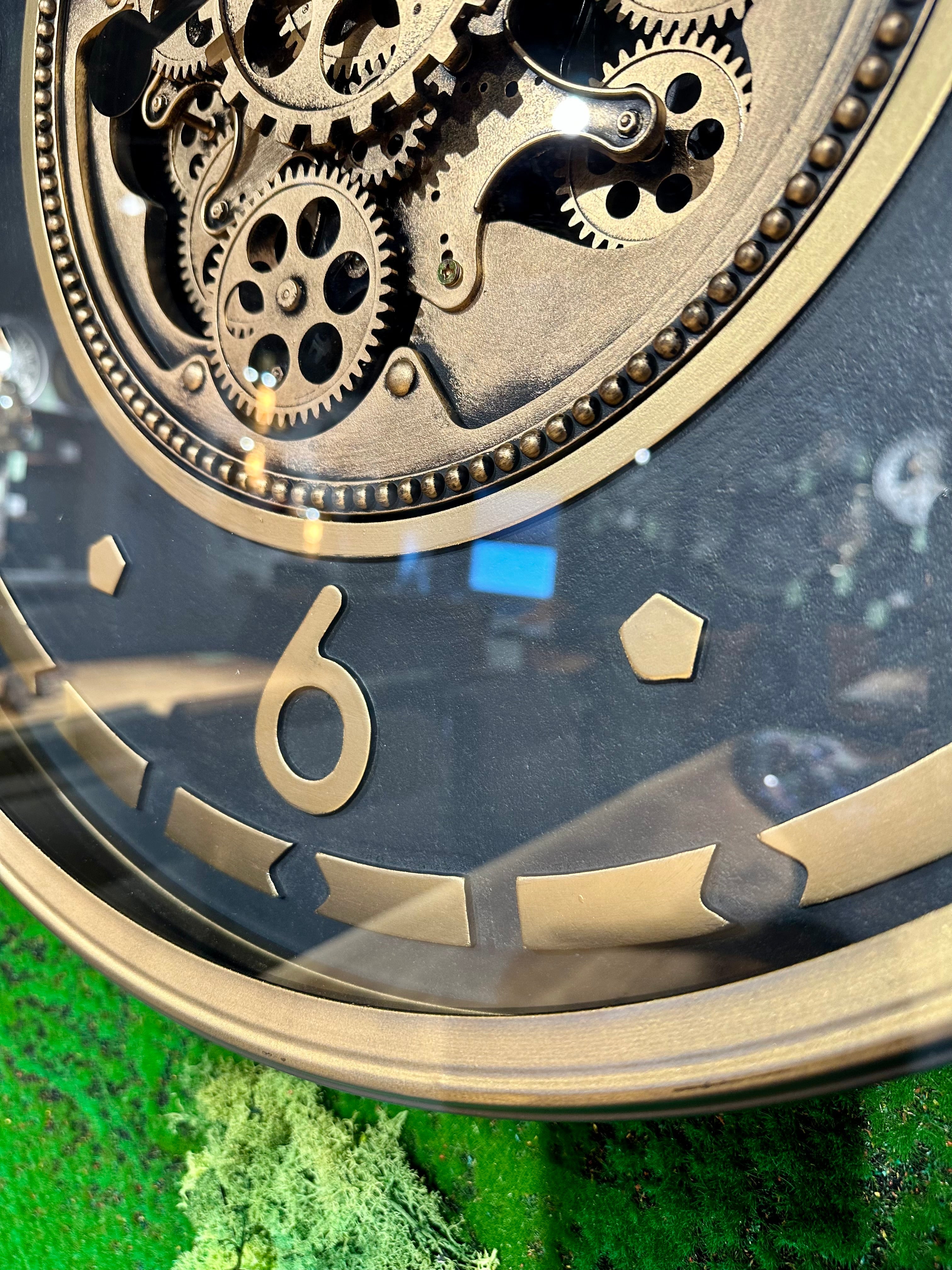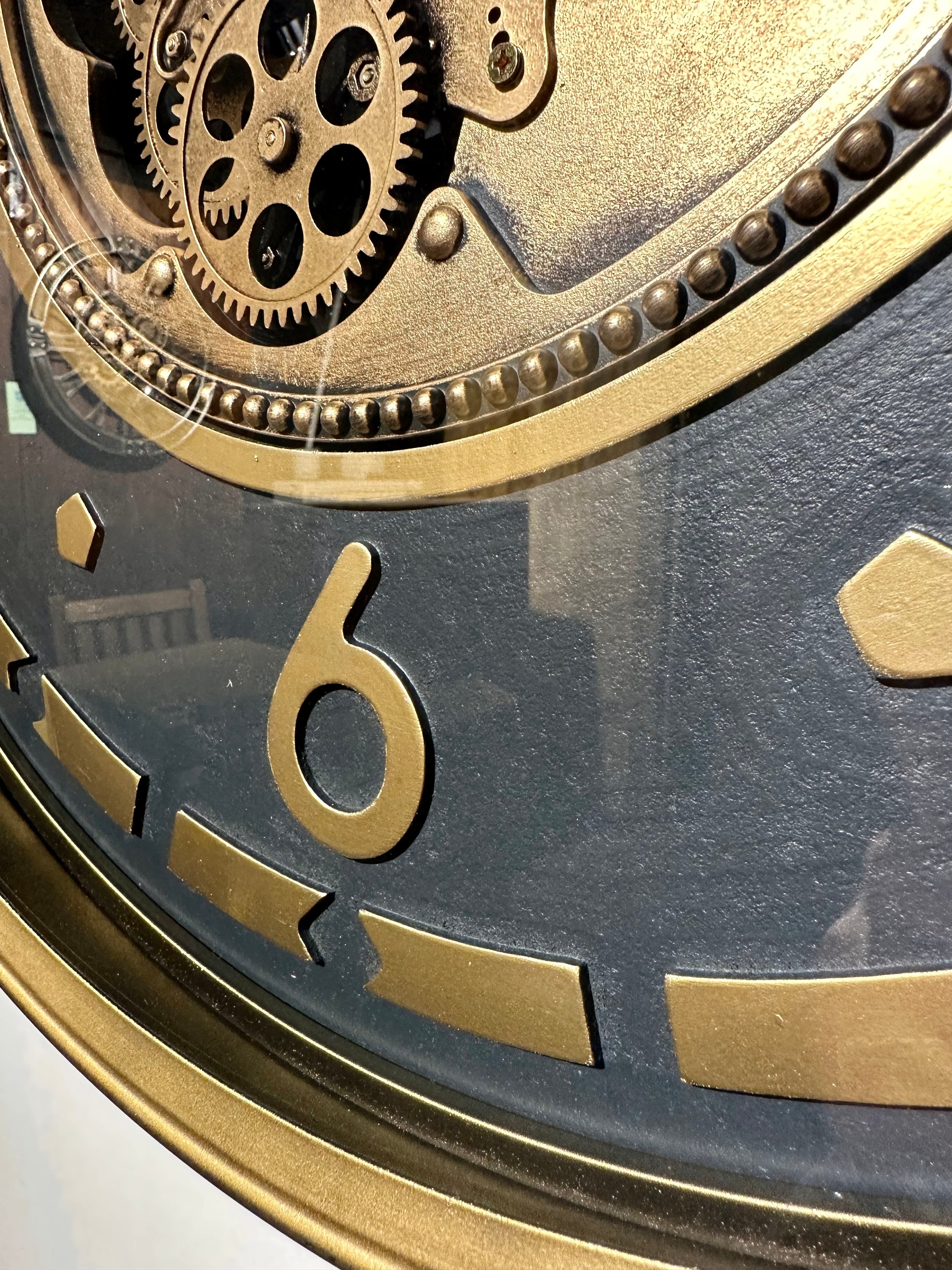 Die Annimationsuhr mit Zahnrädern hat eine Glasscheibe und ein Zifferblatt mit arabischen Zahlen in goldener Farbe Sie ist sehr schön und passt in Wohnräume, die entweder modernen oder mit naturfarbigen Holzmöbeln bestückt ist.