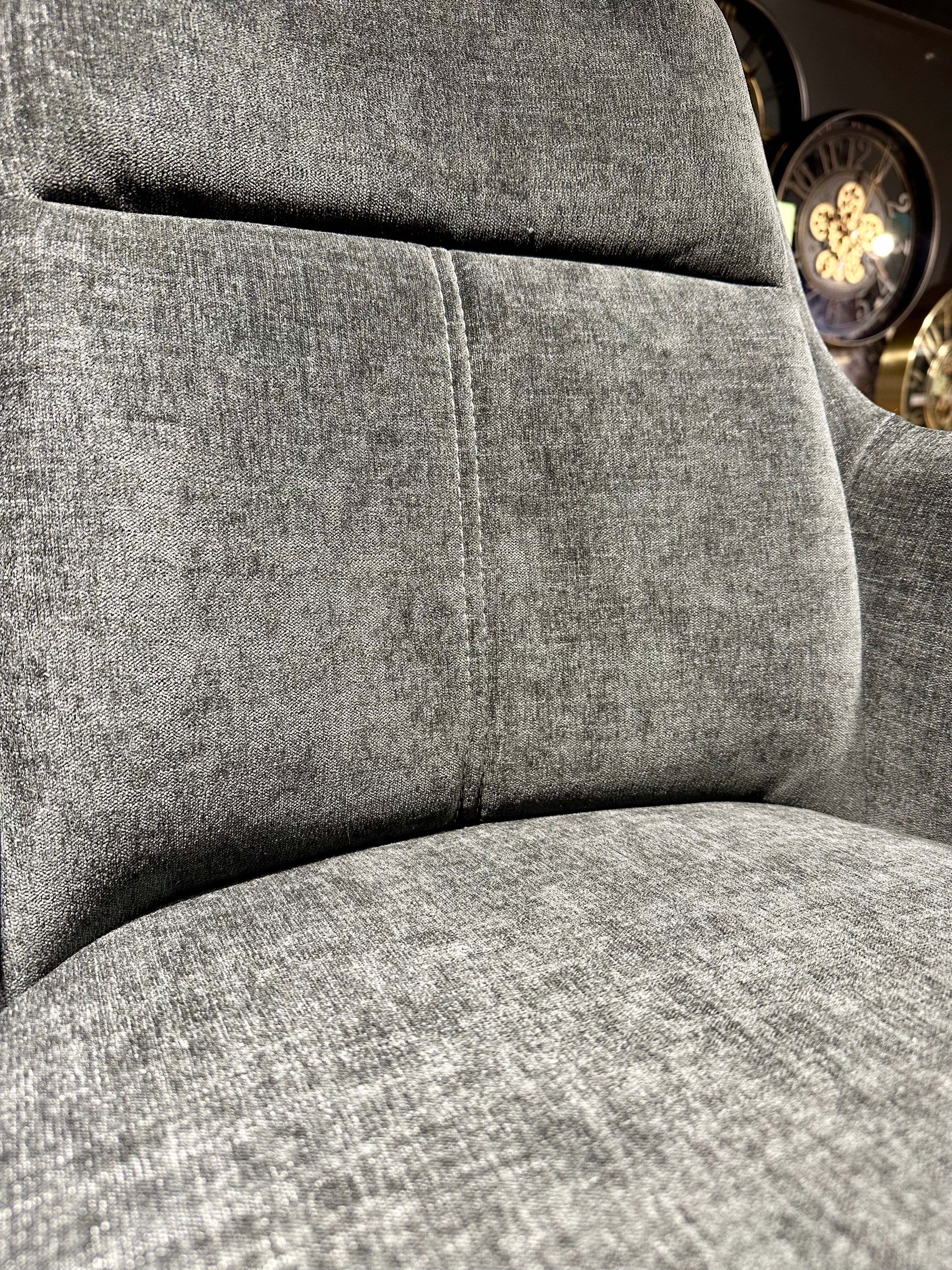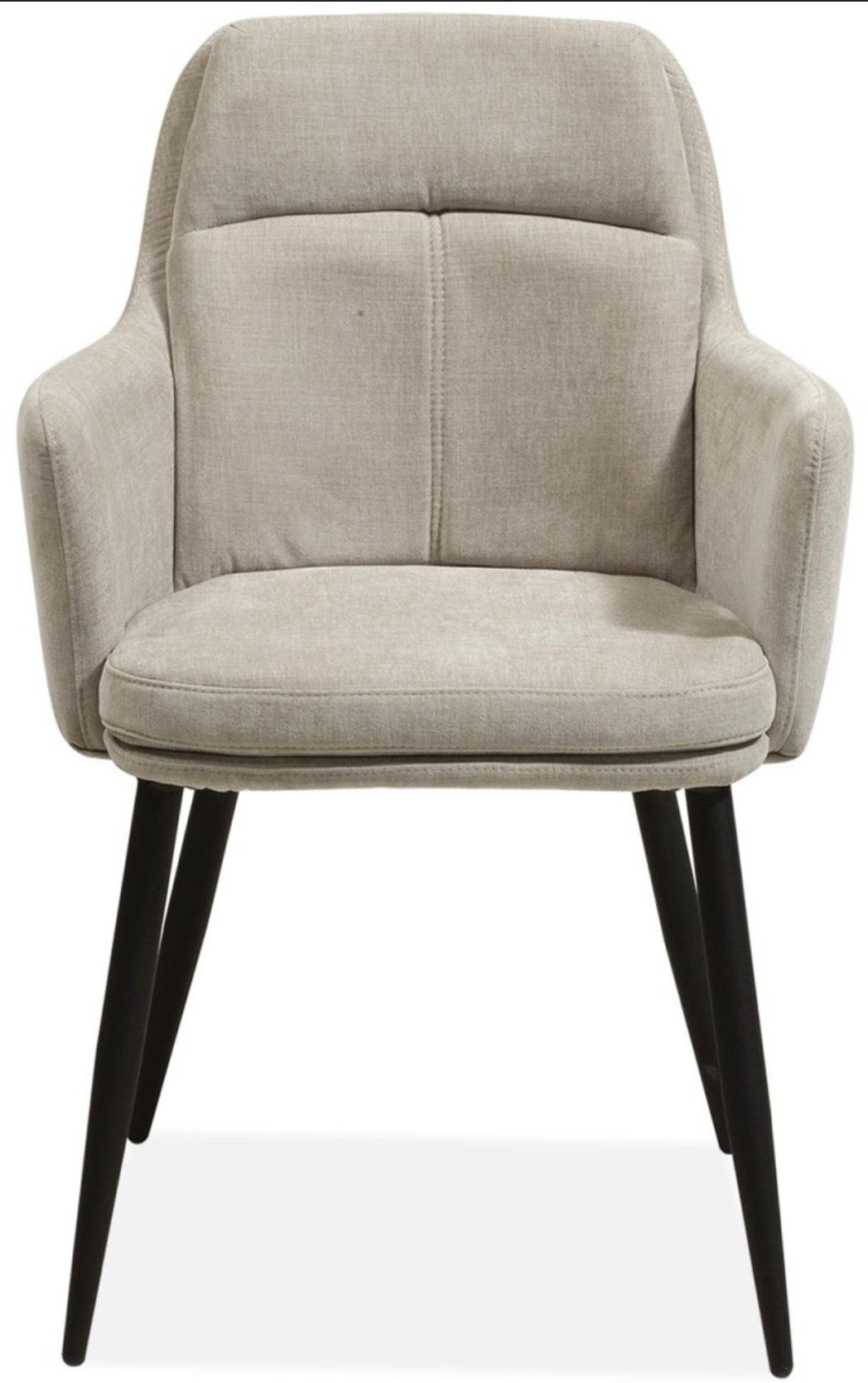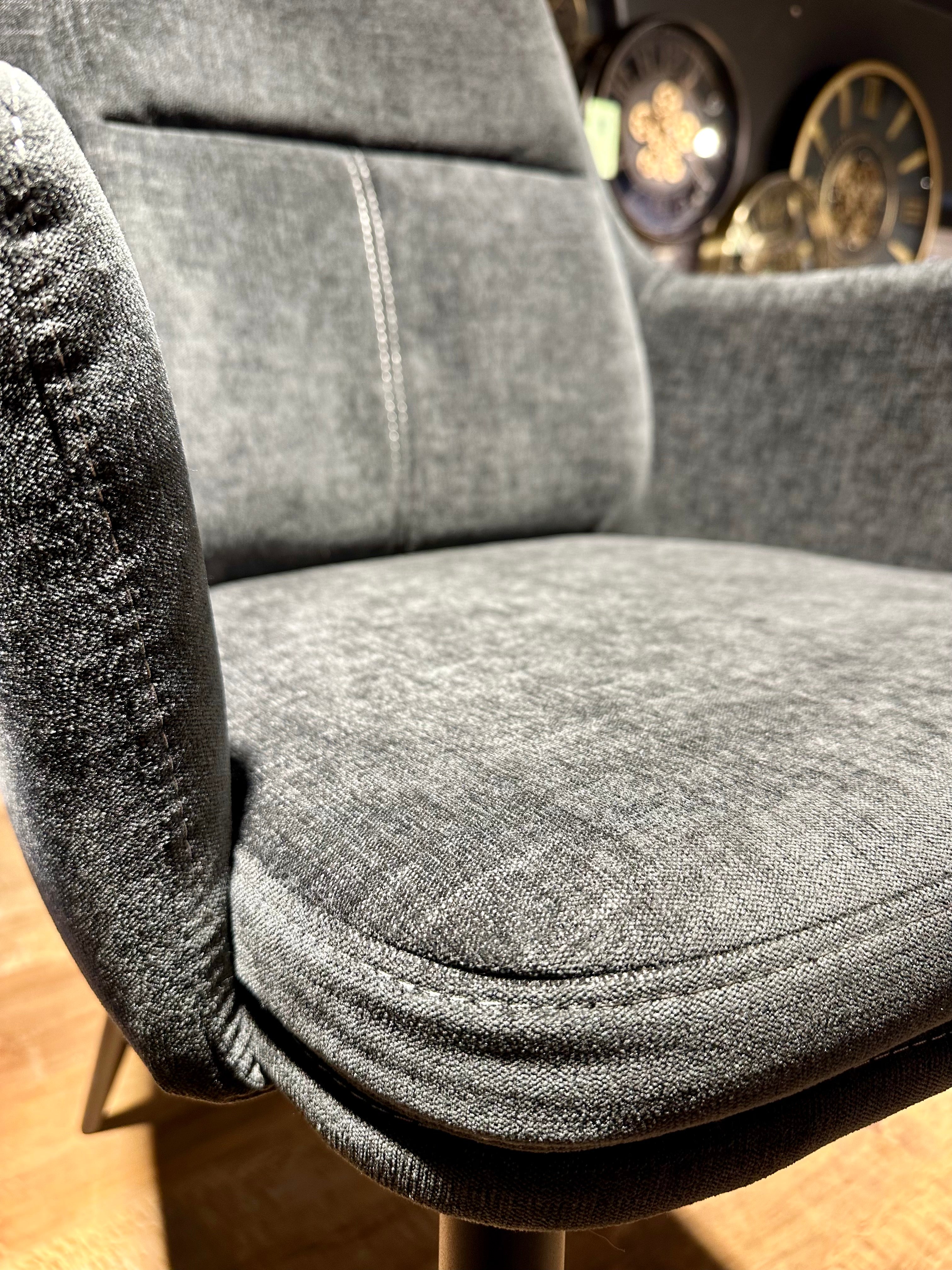 Der Armlehnen-Stuhl ist aus angenehmen und bequemen Möbel-Stoff, atmungsaktiv und super pflegeleicht. Er hat pulverbeschichtete Metallfüße in schwarz und ein Stepp-Muster, ist sehr bequem und einfach angenehm im Sitzgefühl.