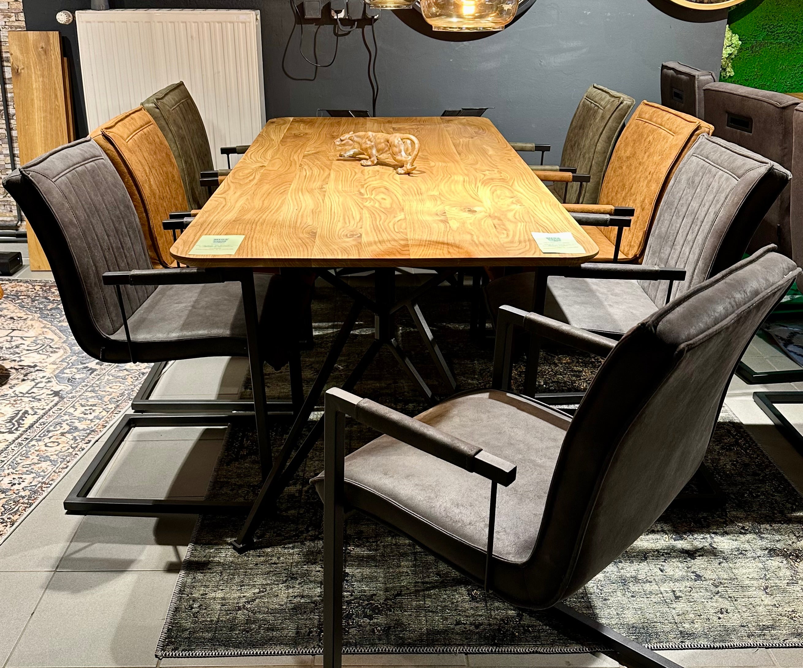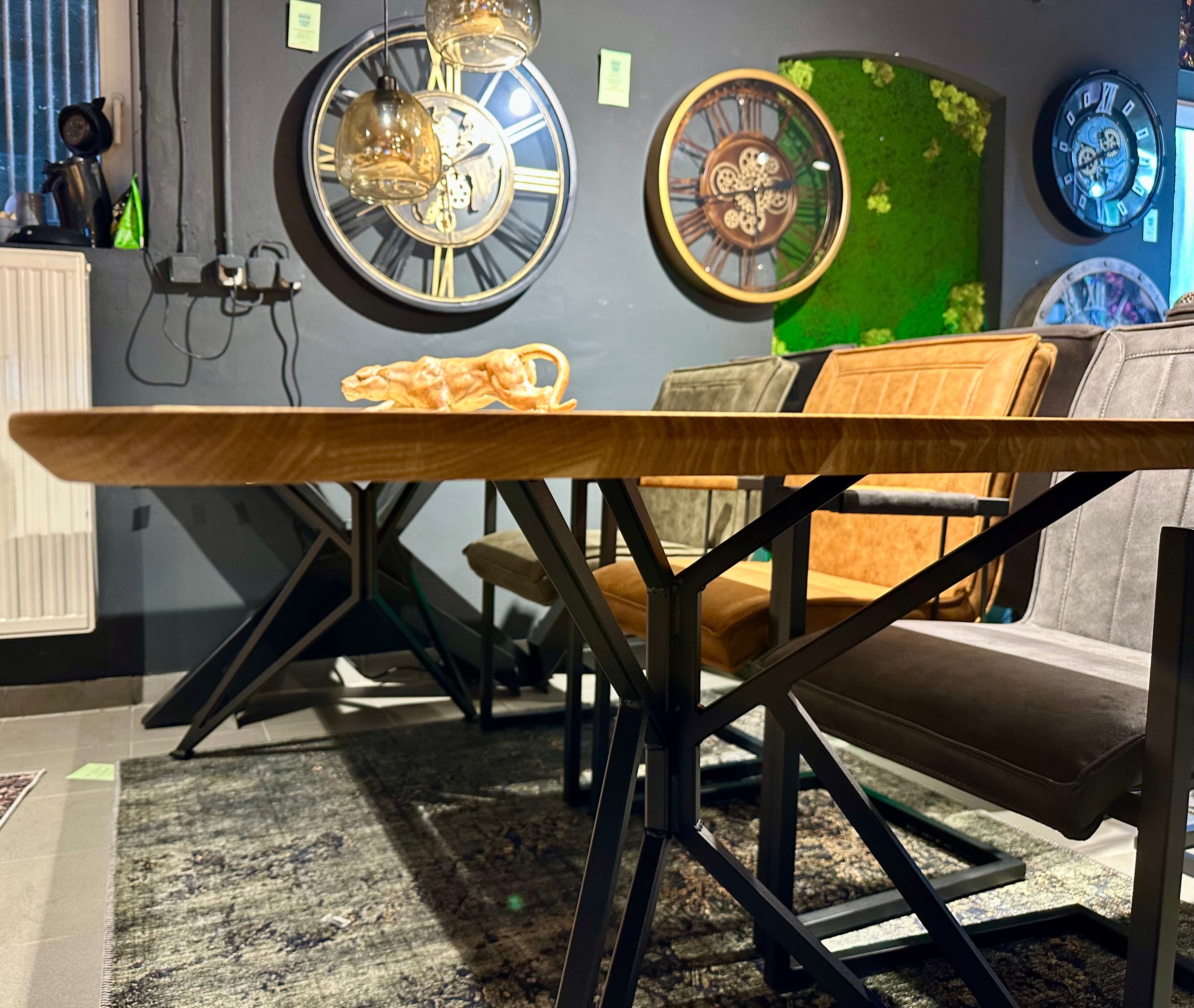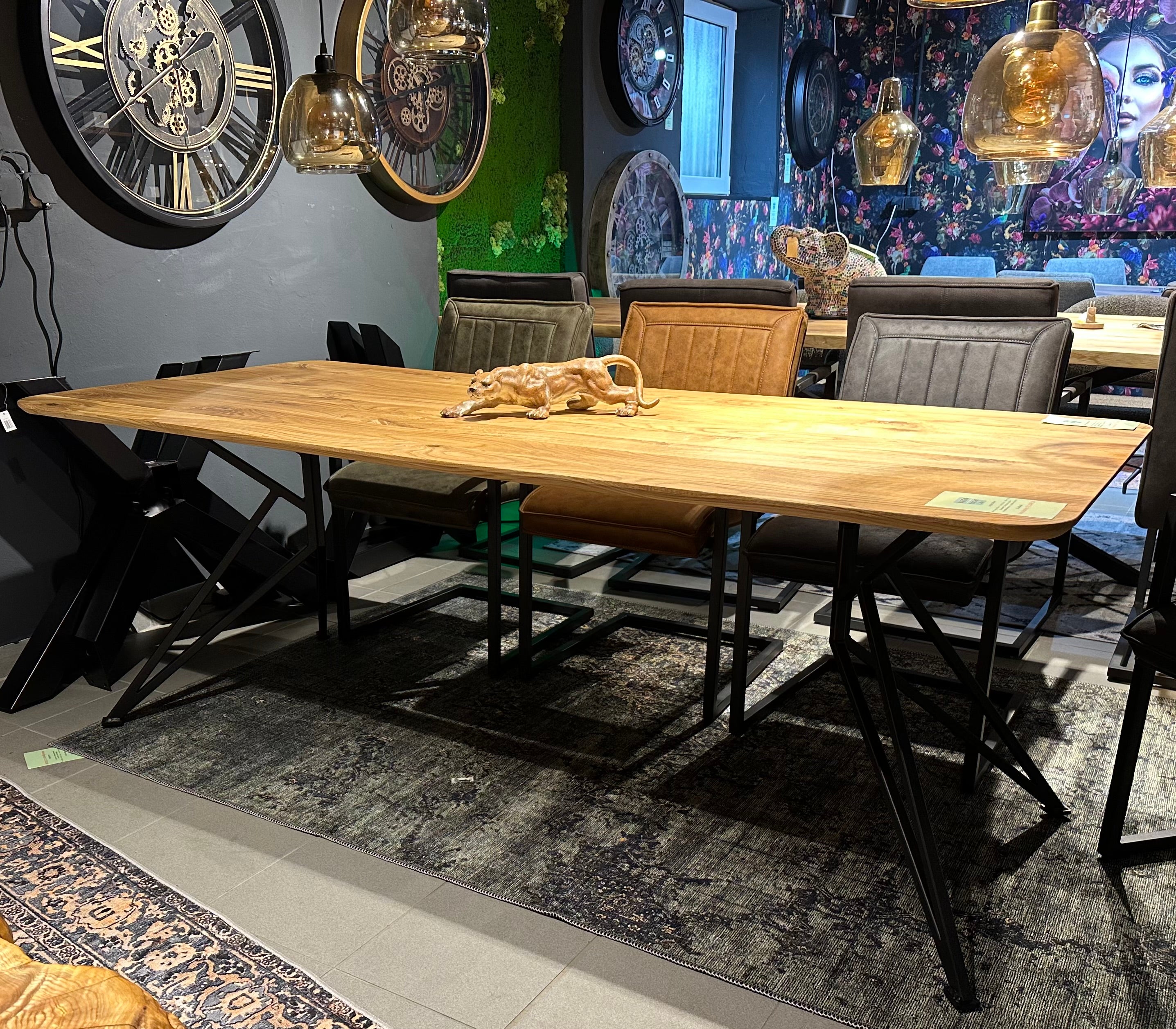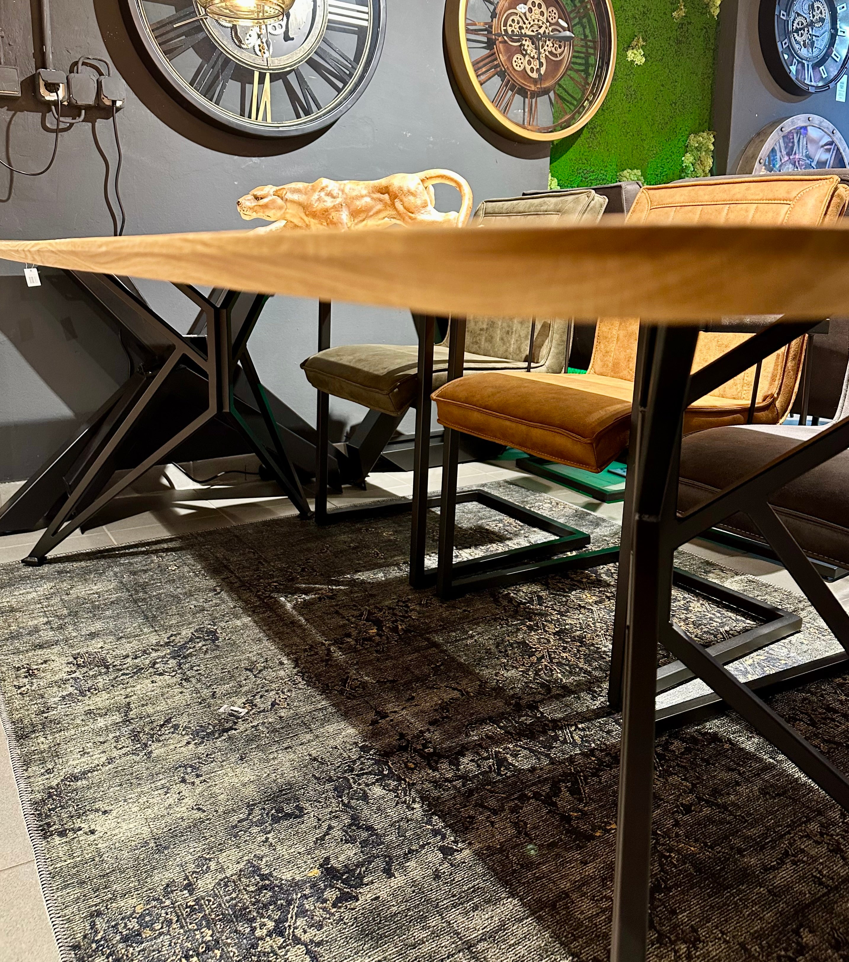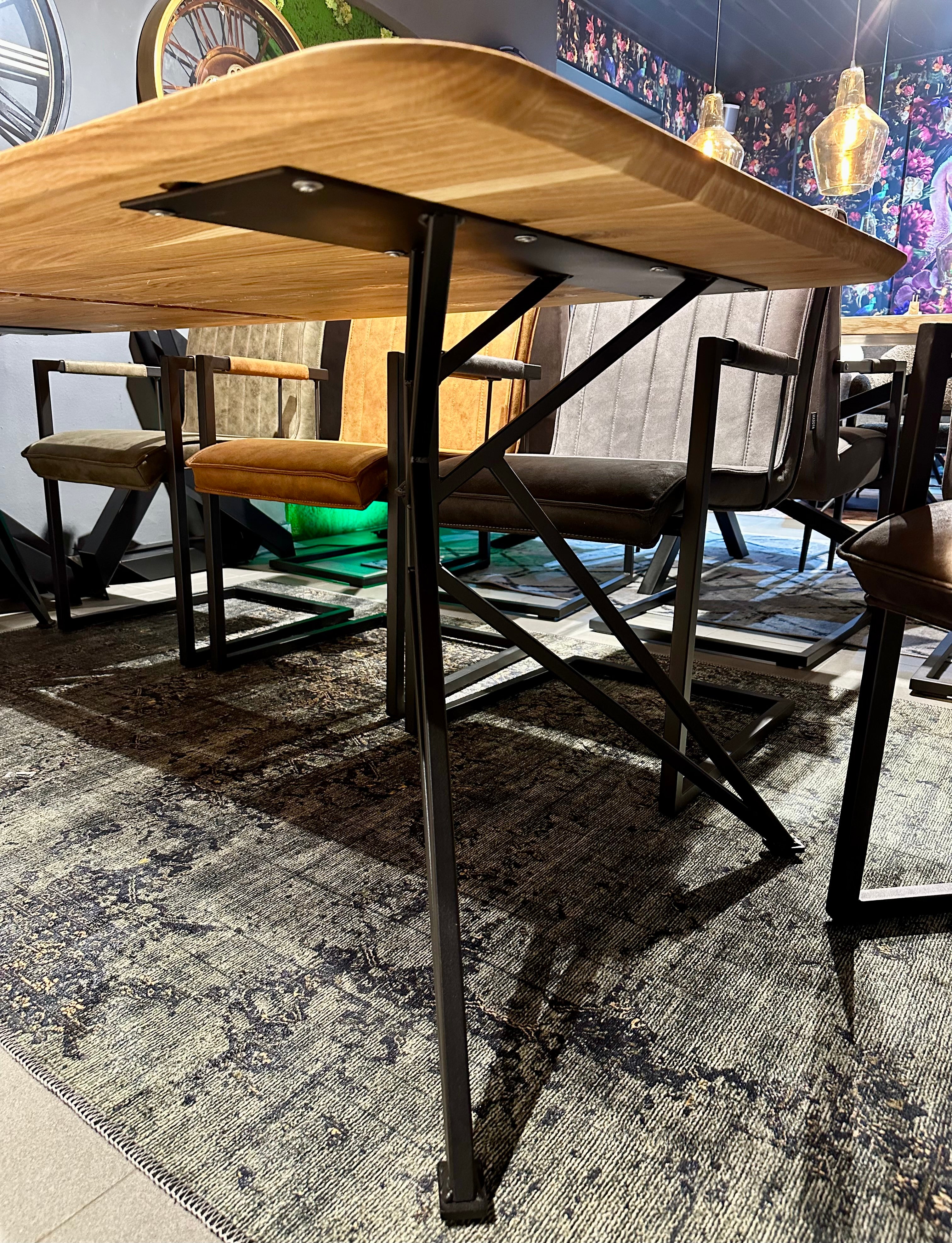 Der Holztisch hat ein schwarzes Butterfly Gestell Set (schwarz pulverbeschichtet).