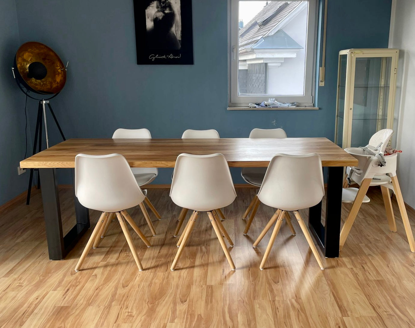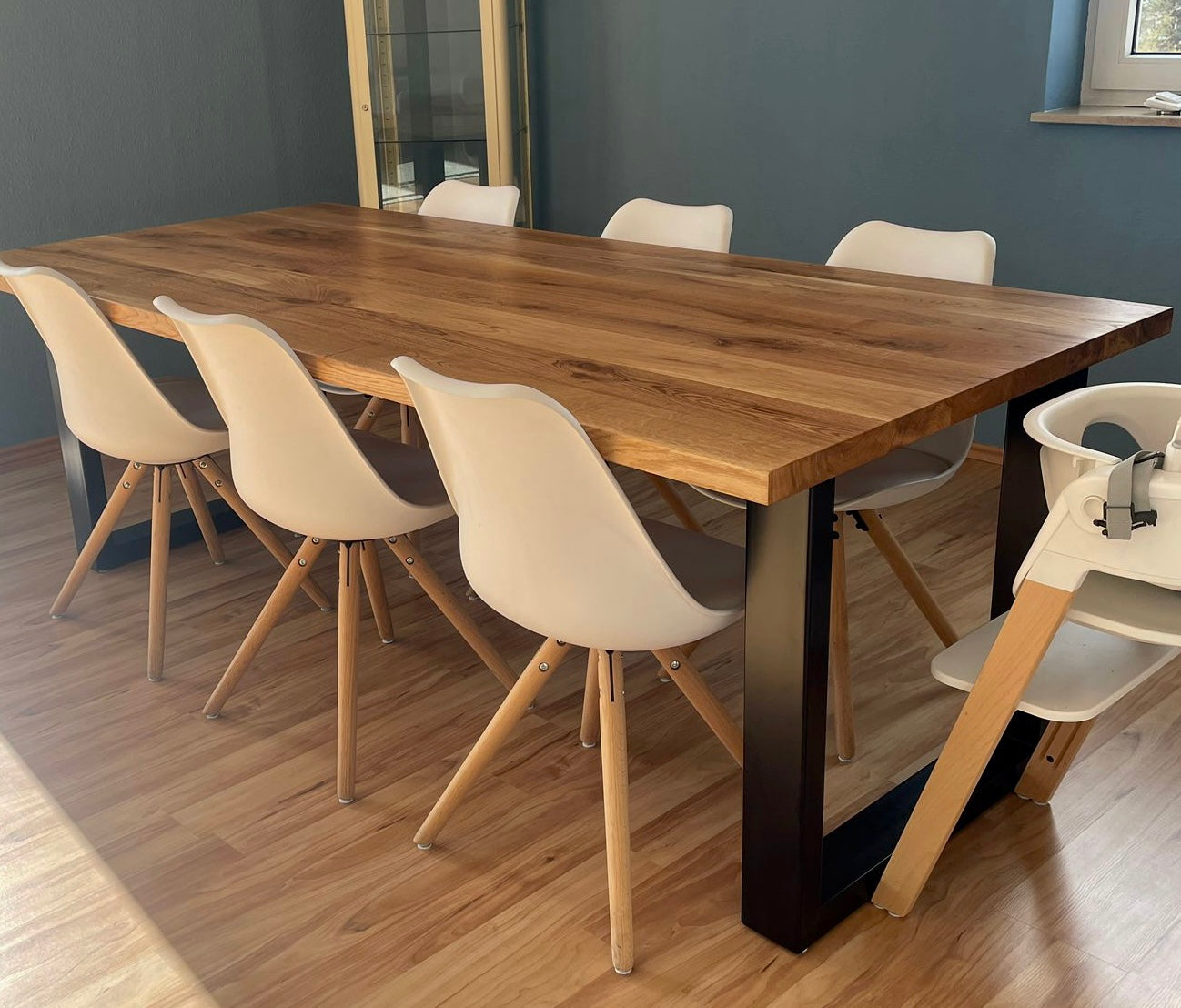 Esstisch Danzig Eiche massiv 200 bis 320 in 4 cm Dicke Holz geölt mit U Metall Gestell schwarz 6 Größen