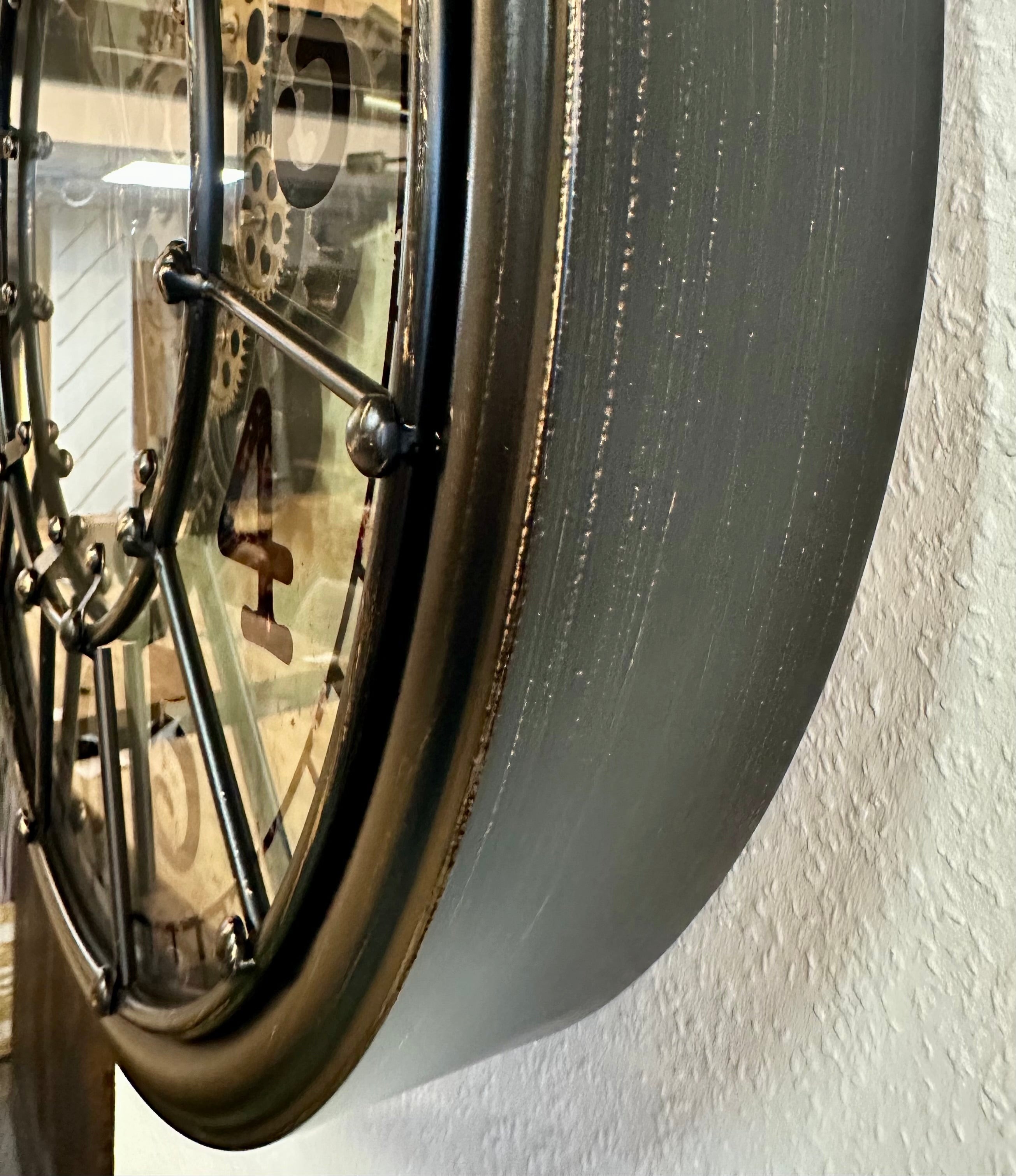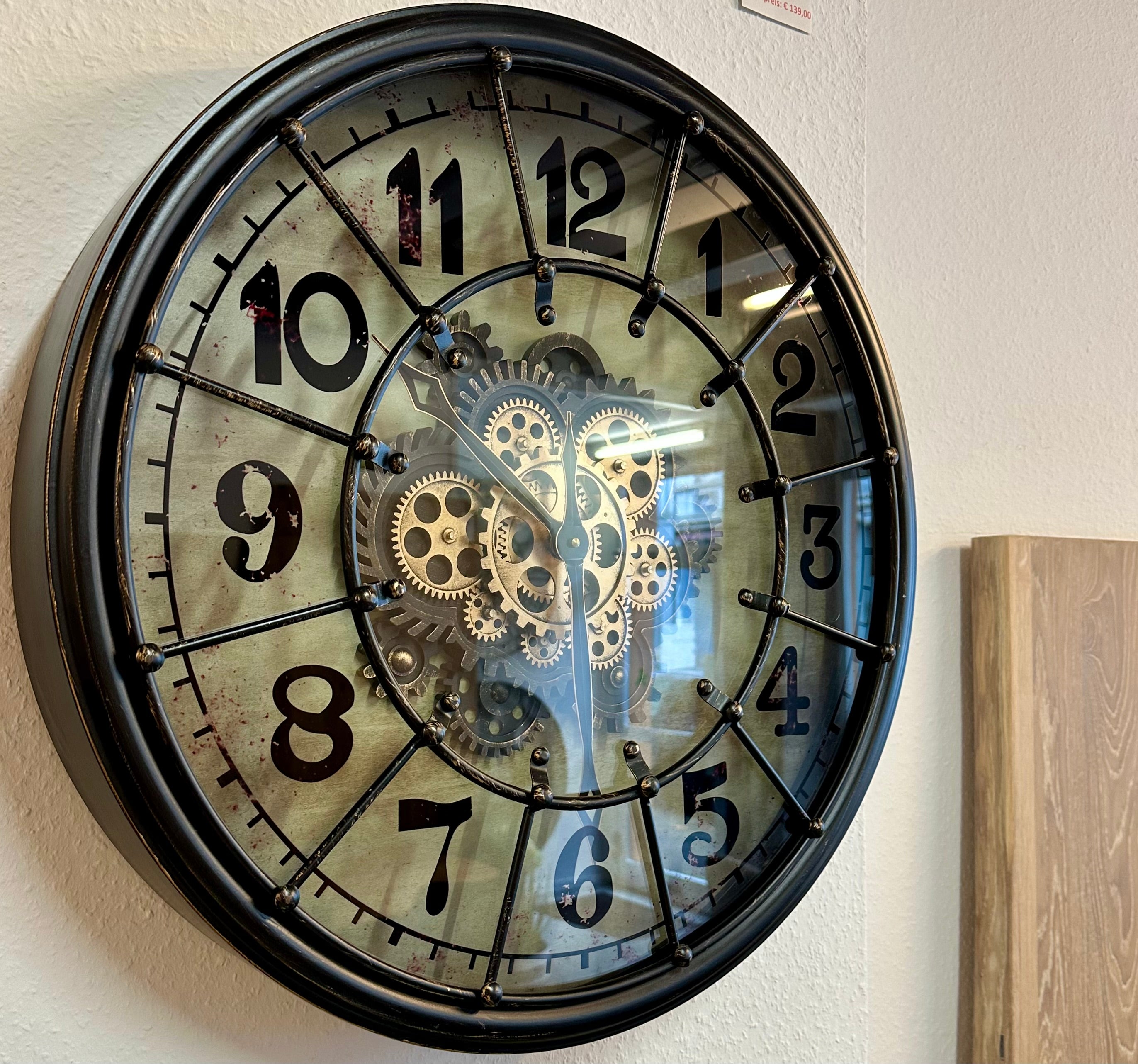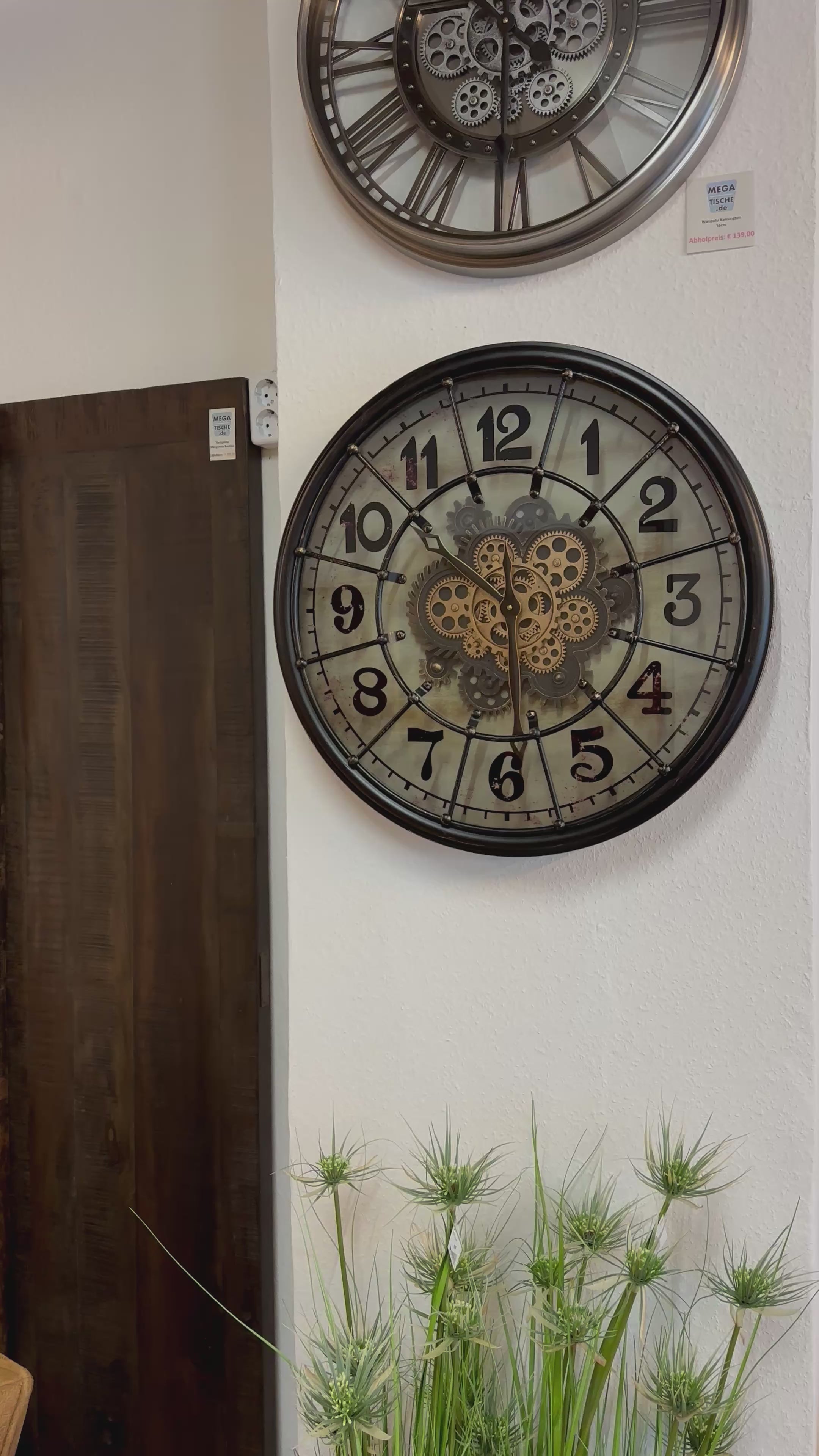 Diese Vintage-Design Wanduhr in 60 cm ist mit einer Animation versehen (Zählwerk dreht sich) und mit einer schwarzer Metallfassung.