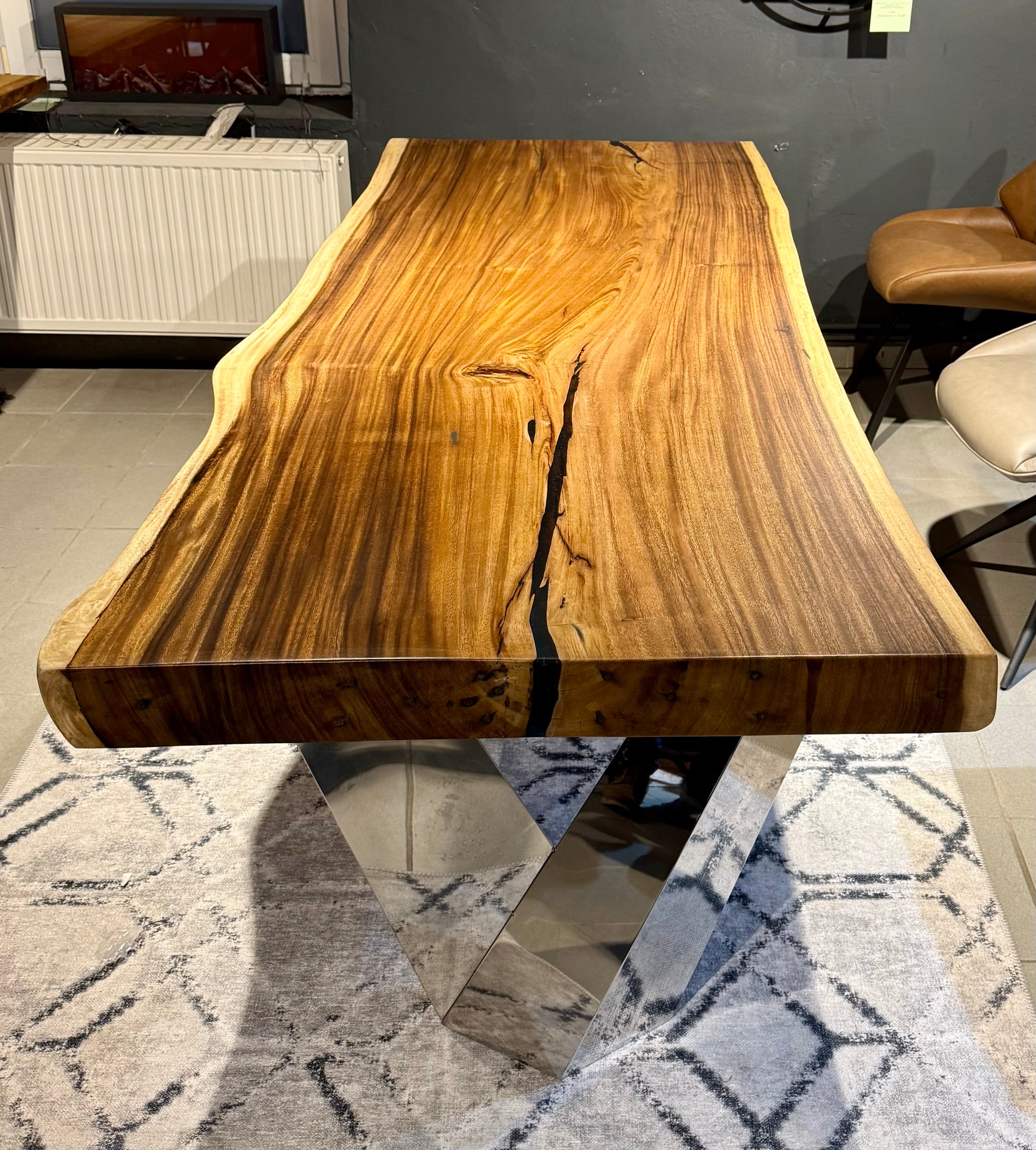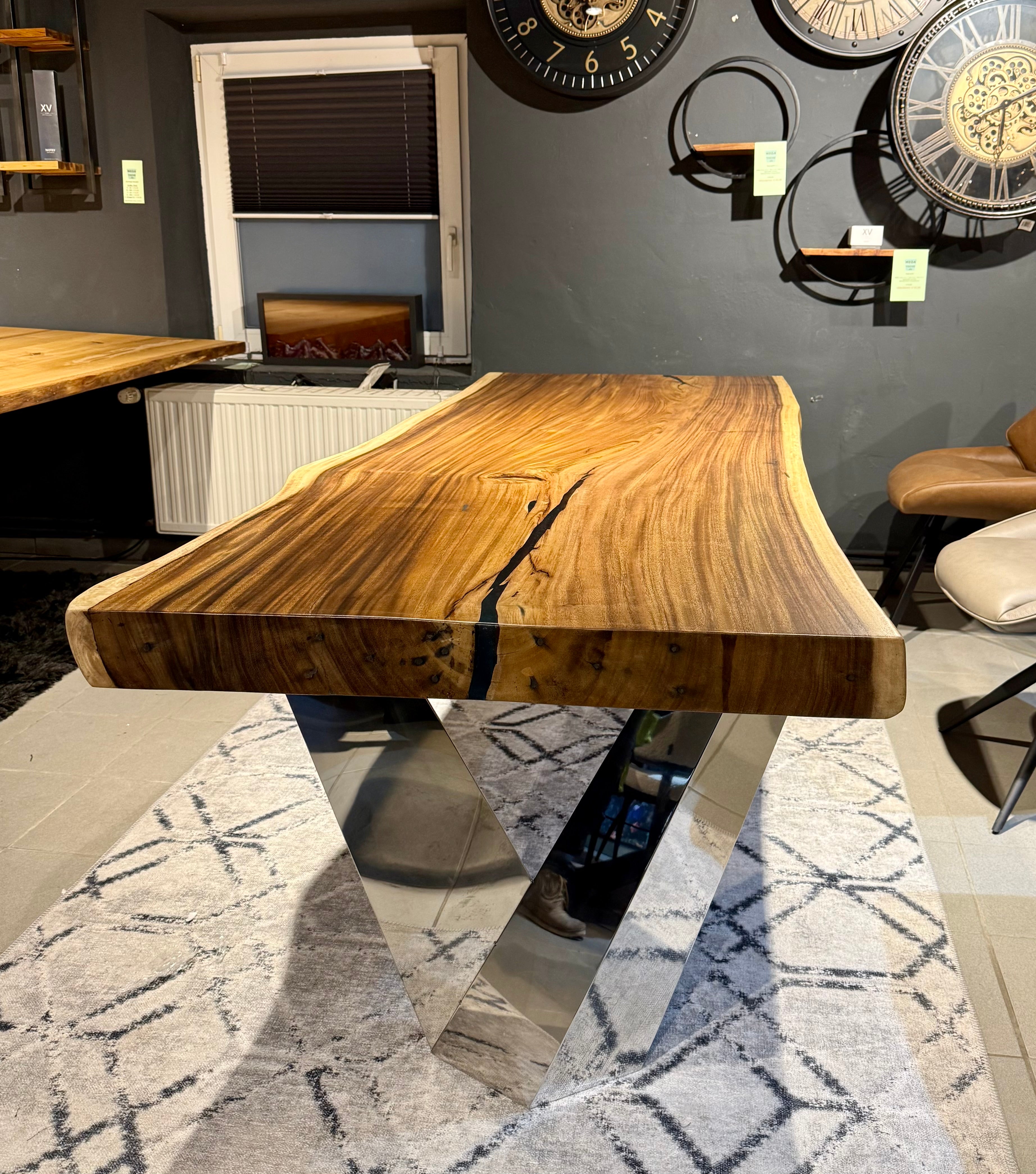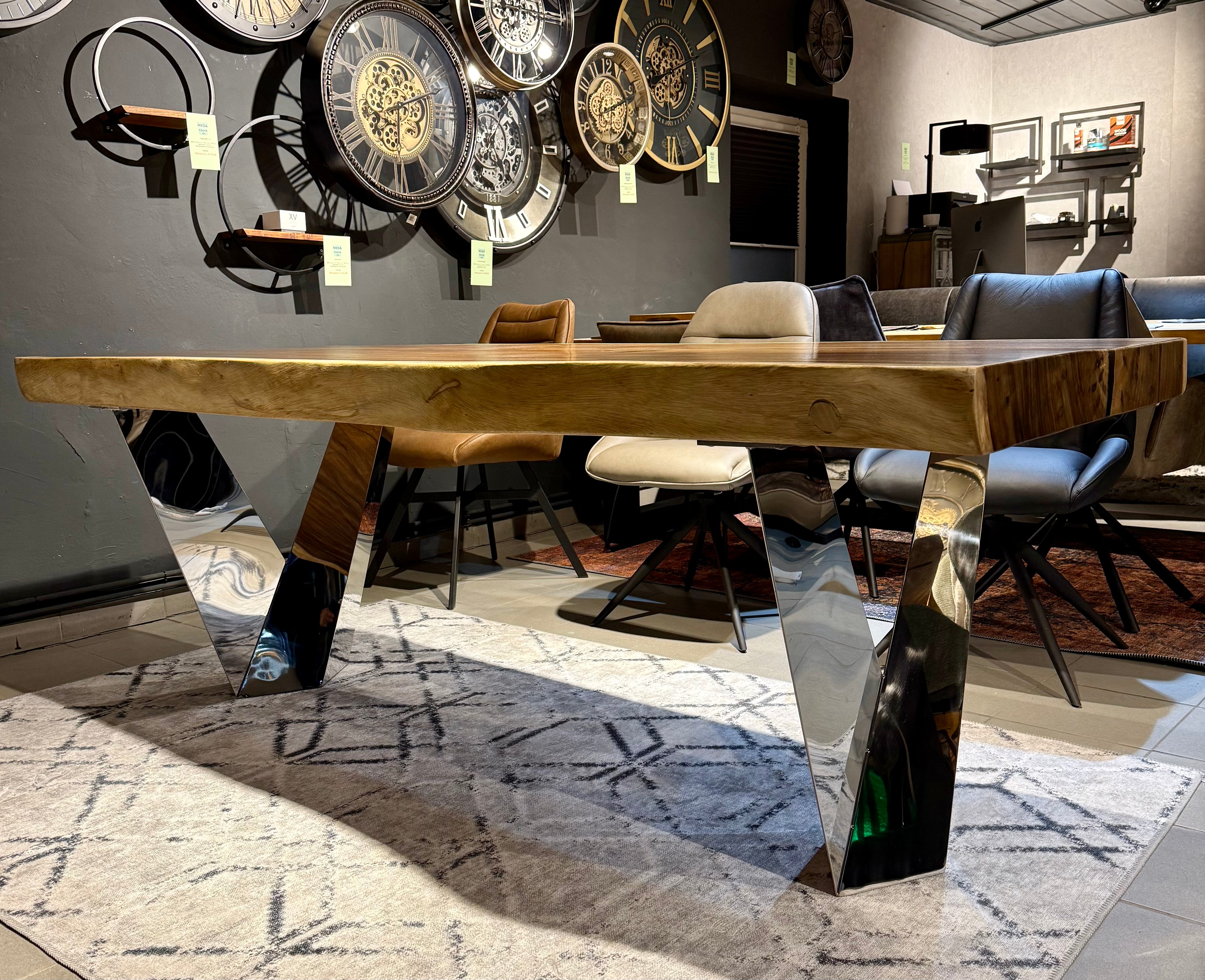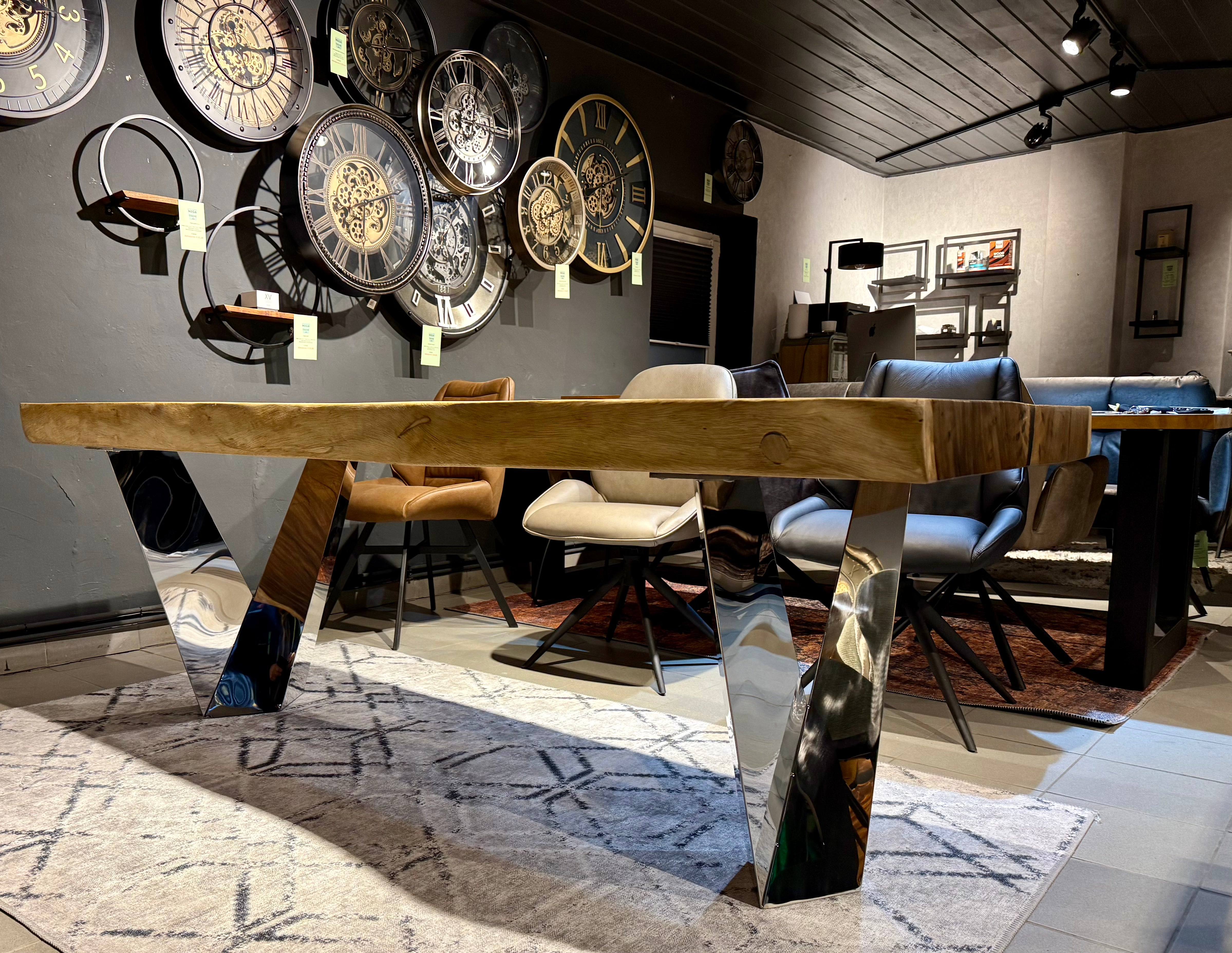 Mammut Baumstamm Esstisch Suar Mungur 210 lang und 9 cm massiv mit V-Gestell Set Chrom