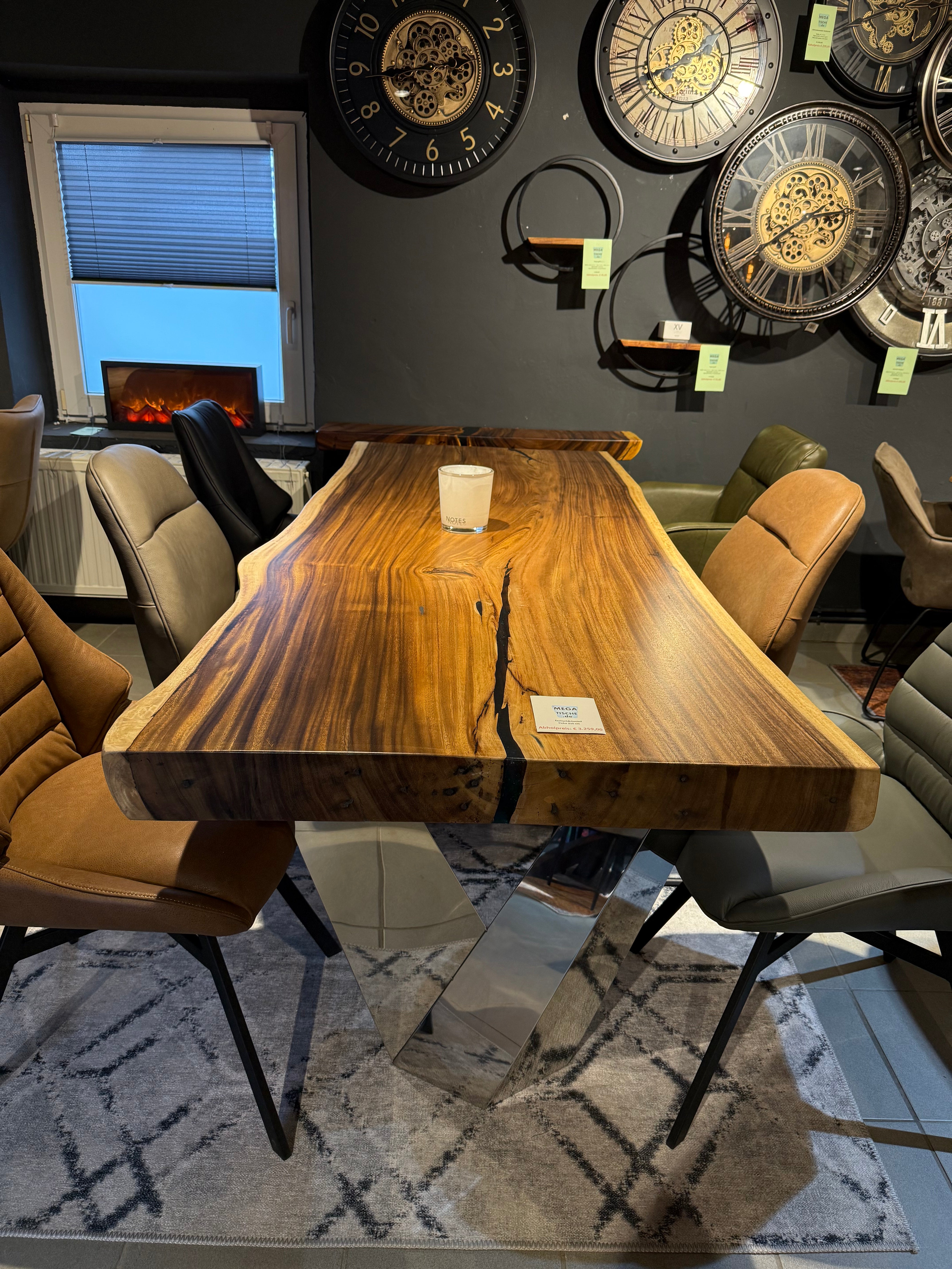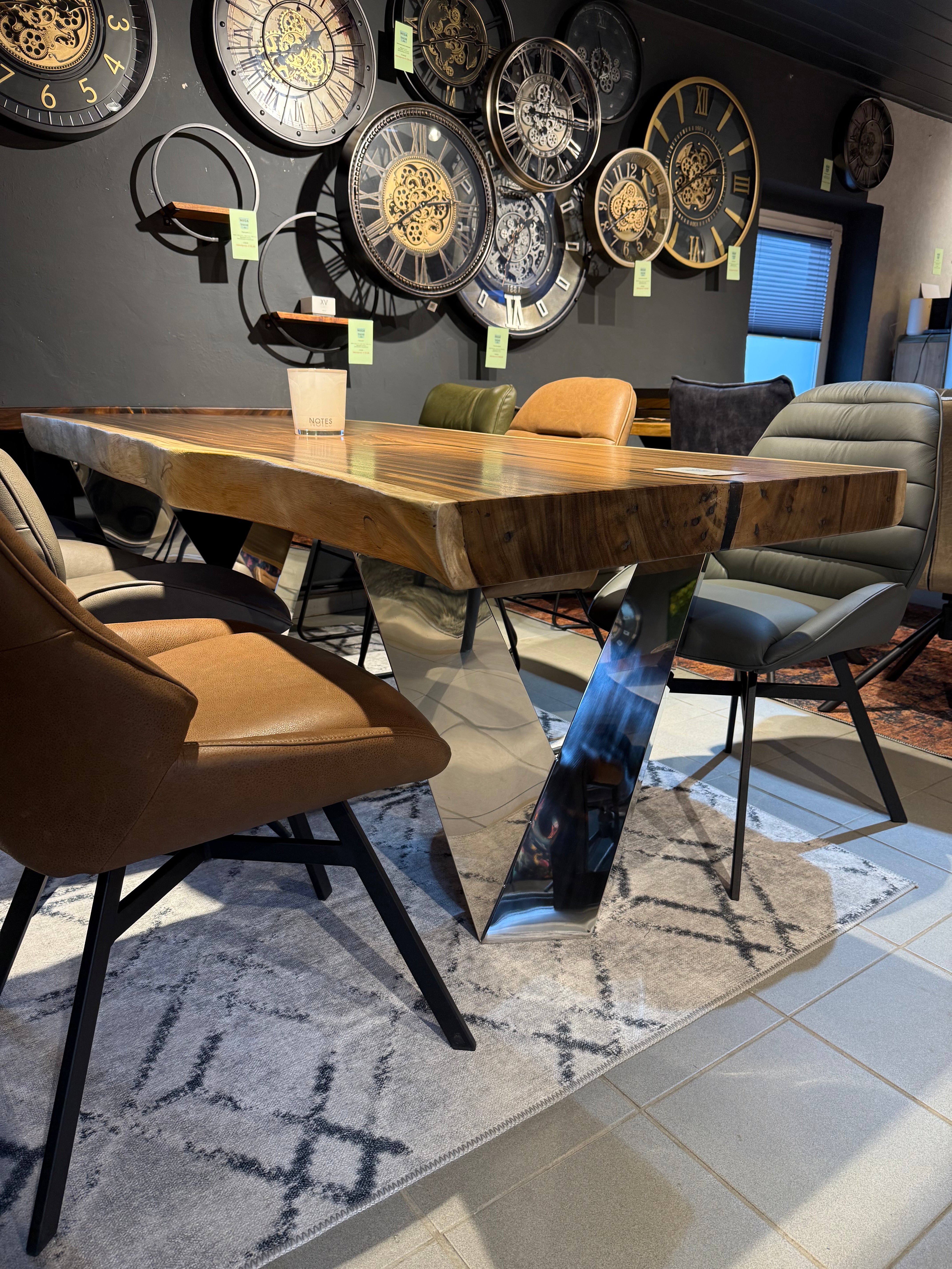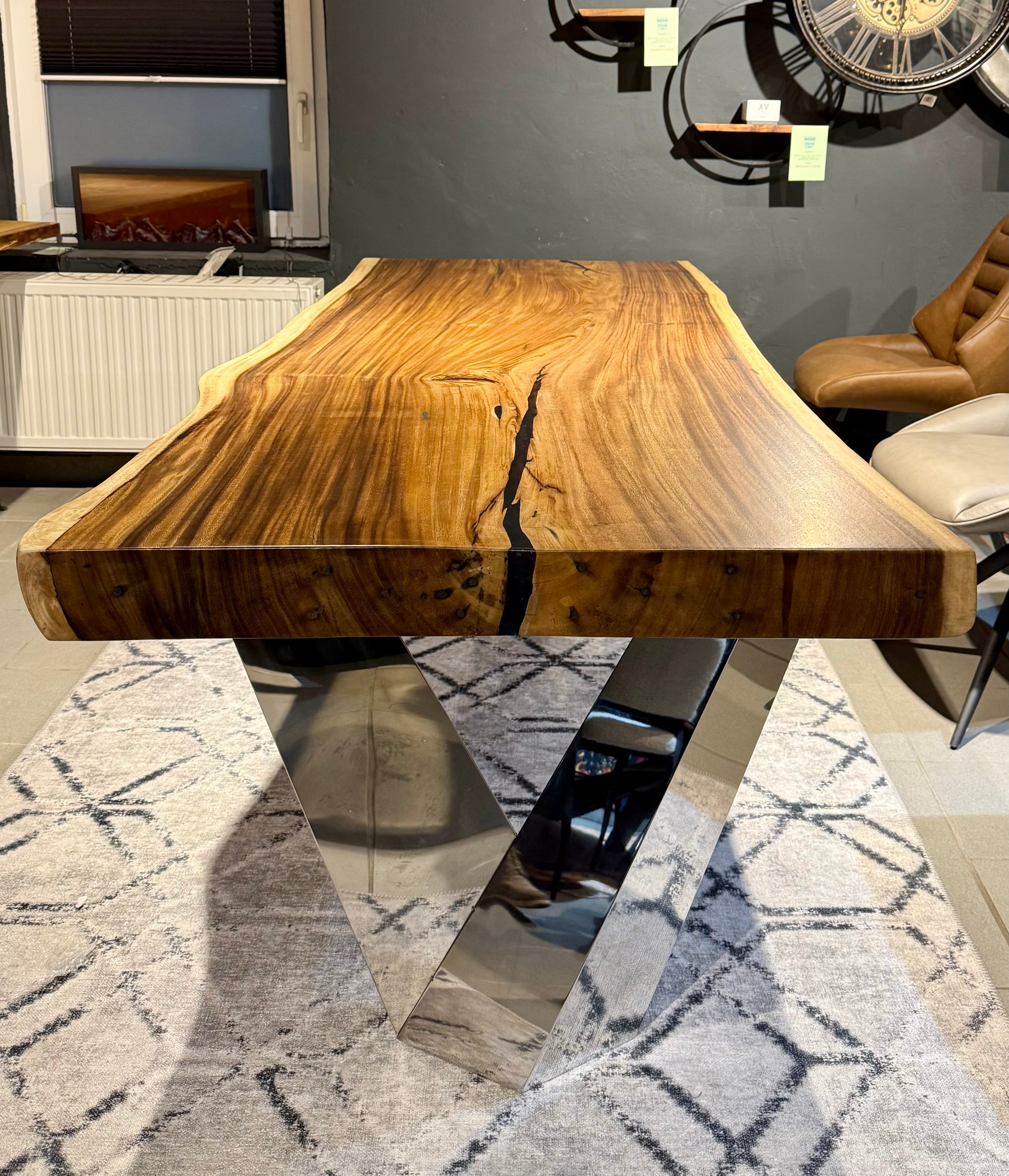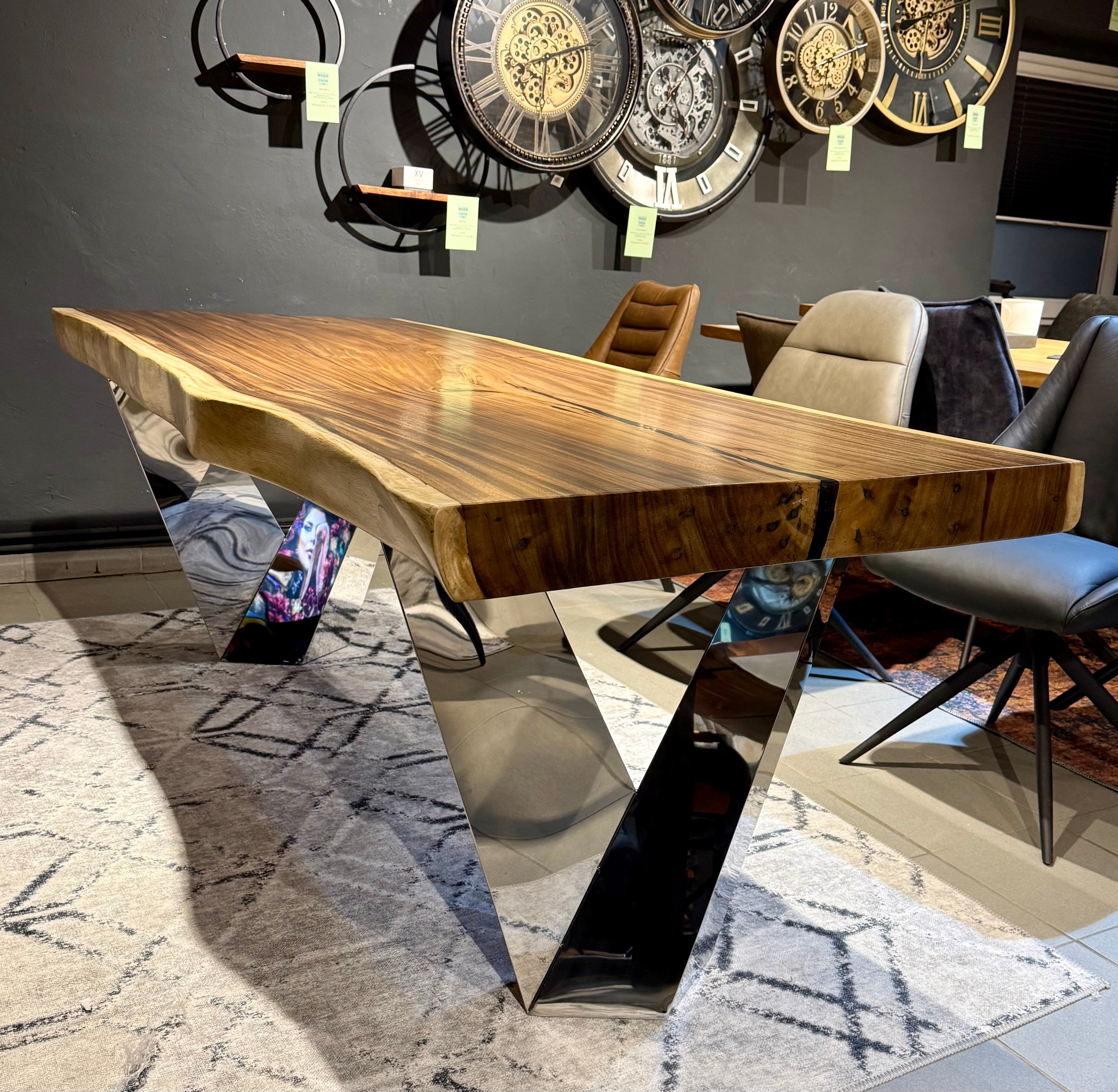 Mammut Baumstamm Esstisch Suar Mungur 210 lang und 9 cm massiv mit V-Gestell Set Chrom