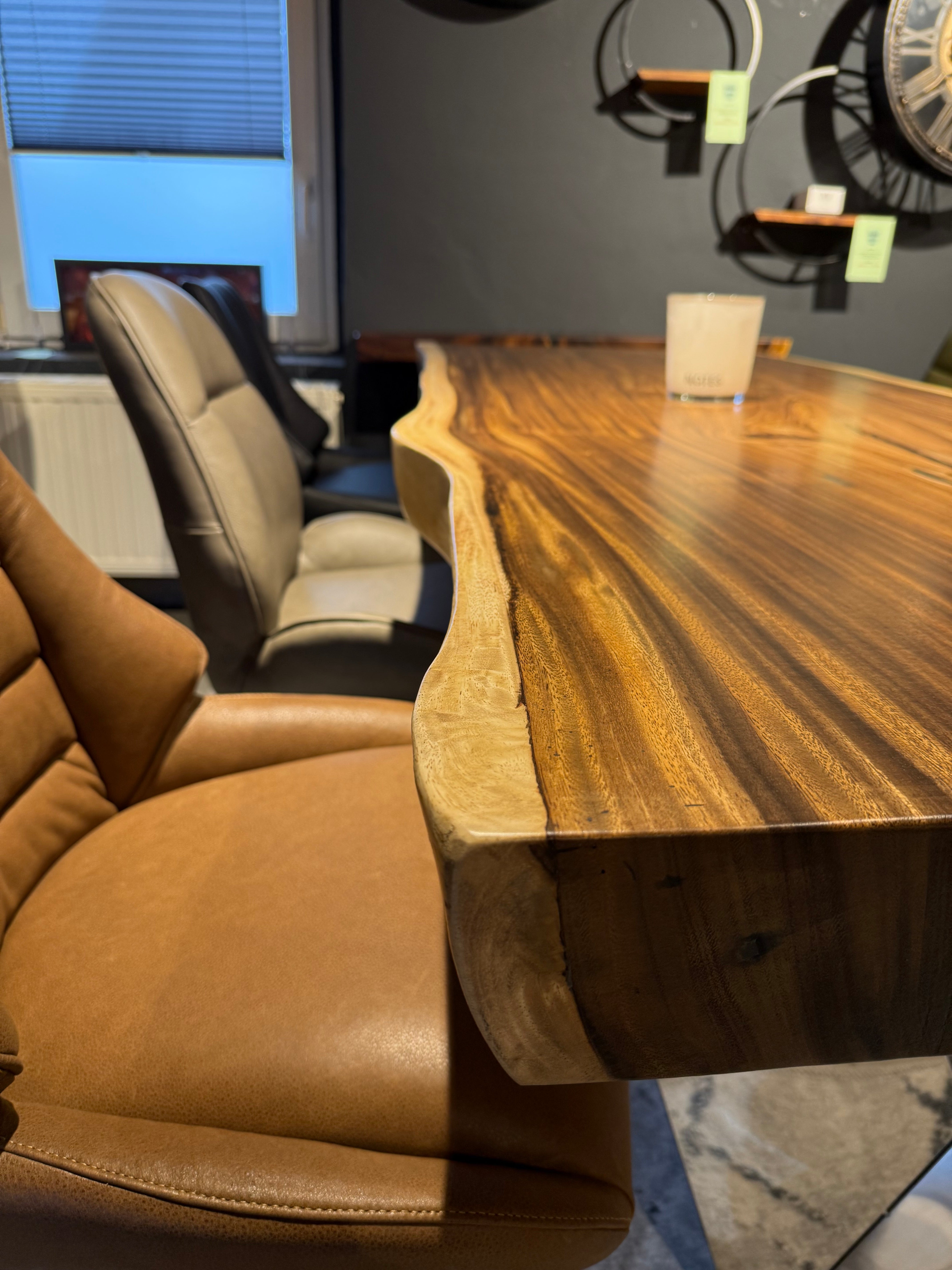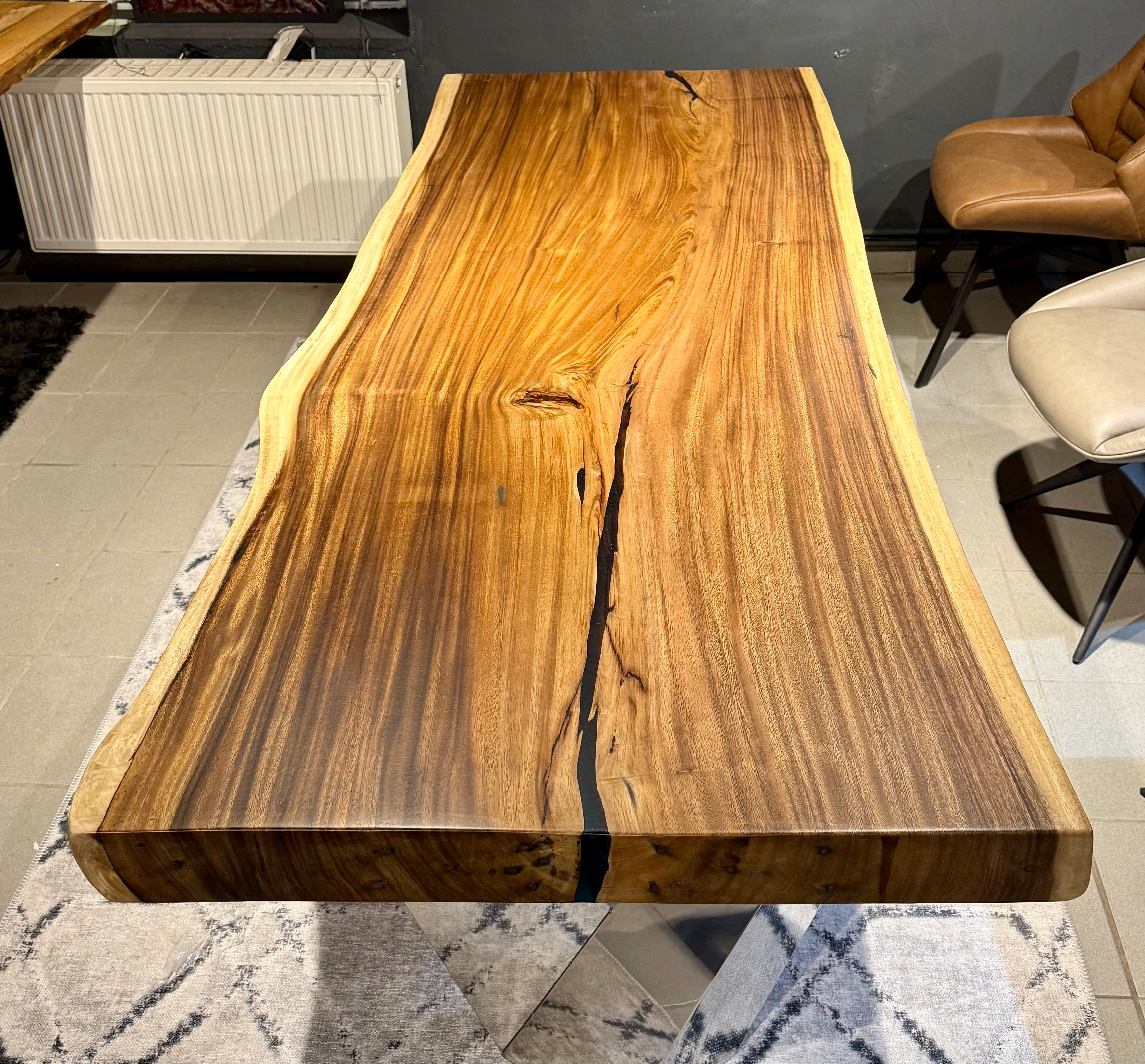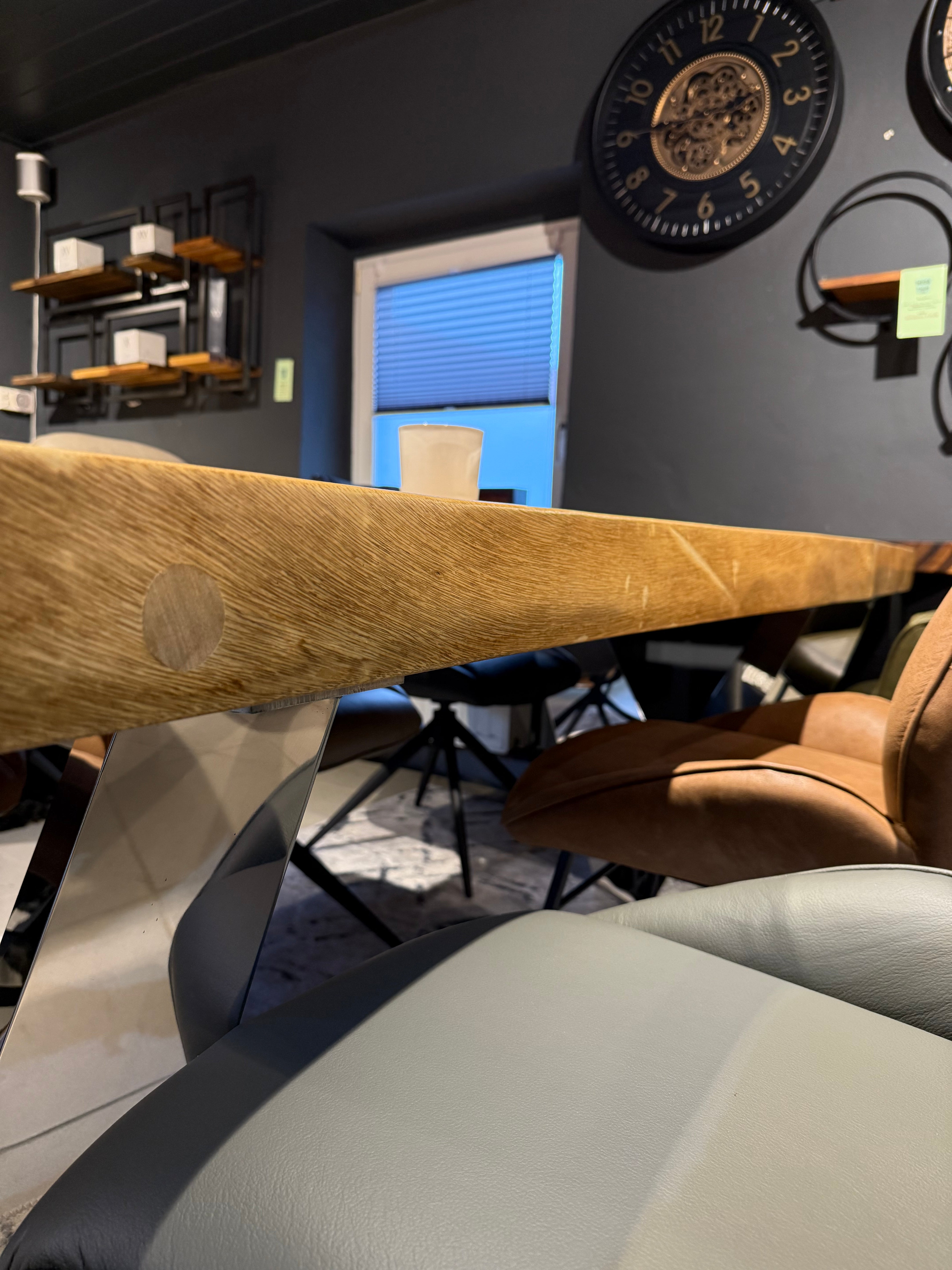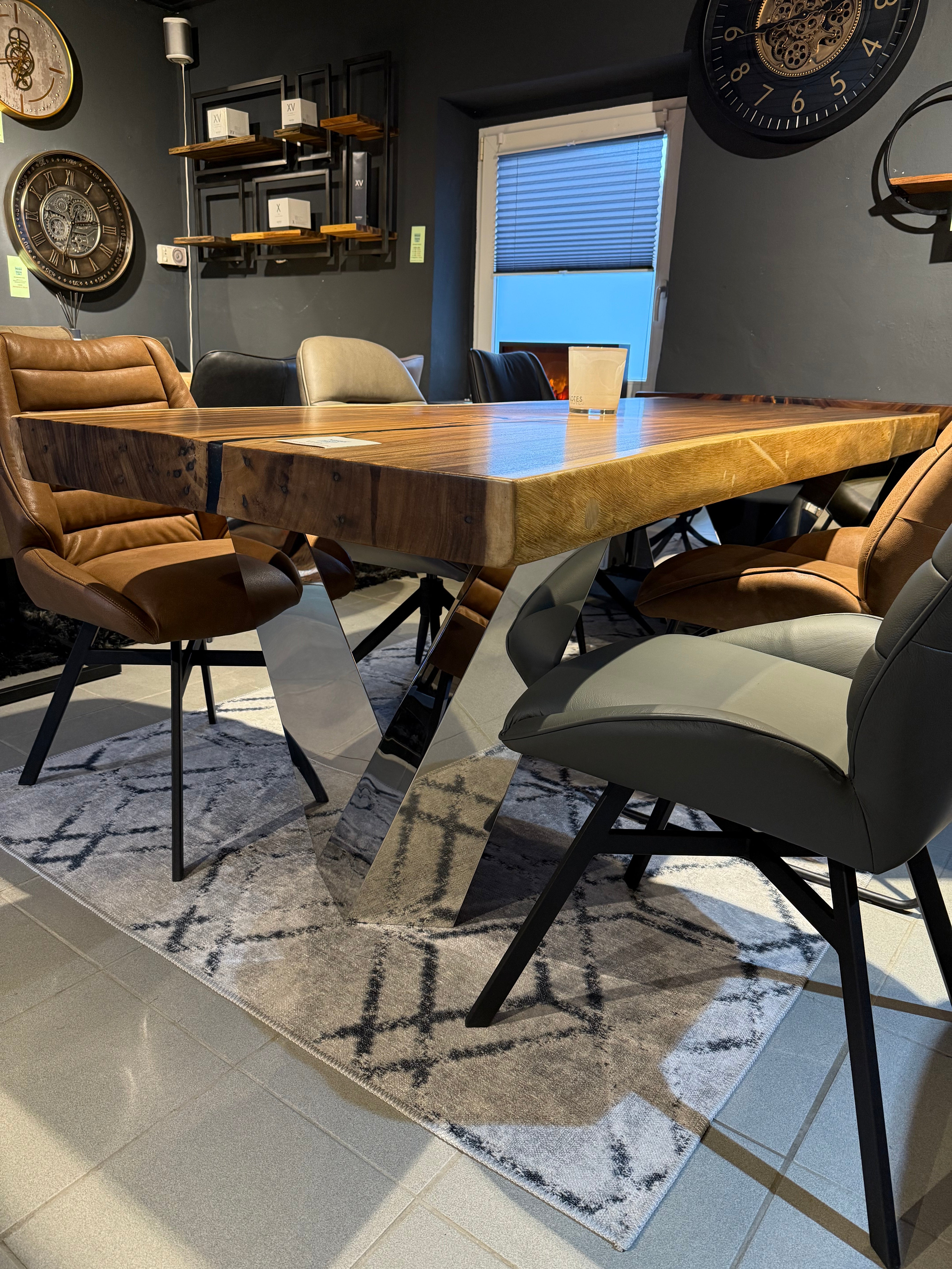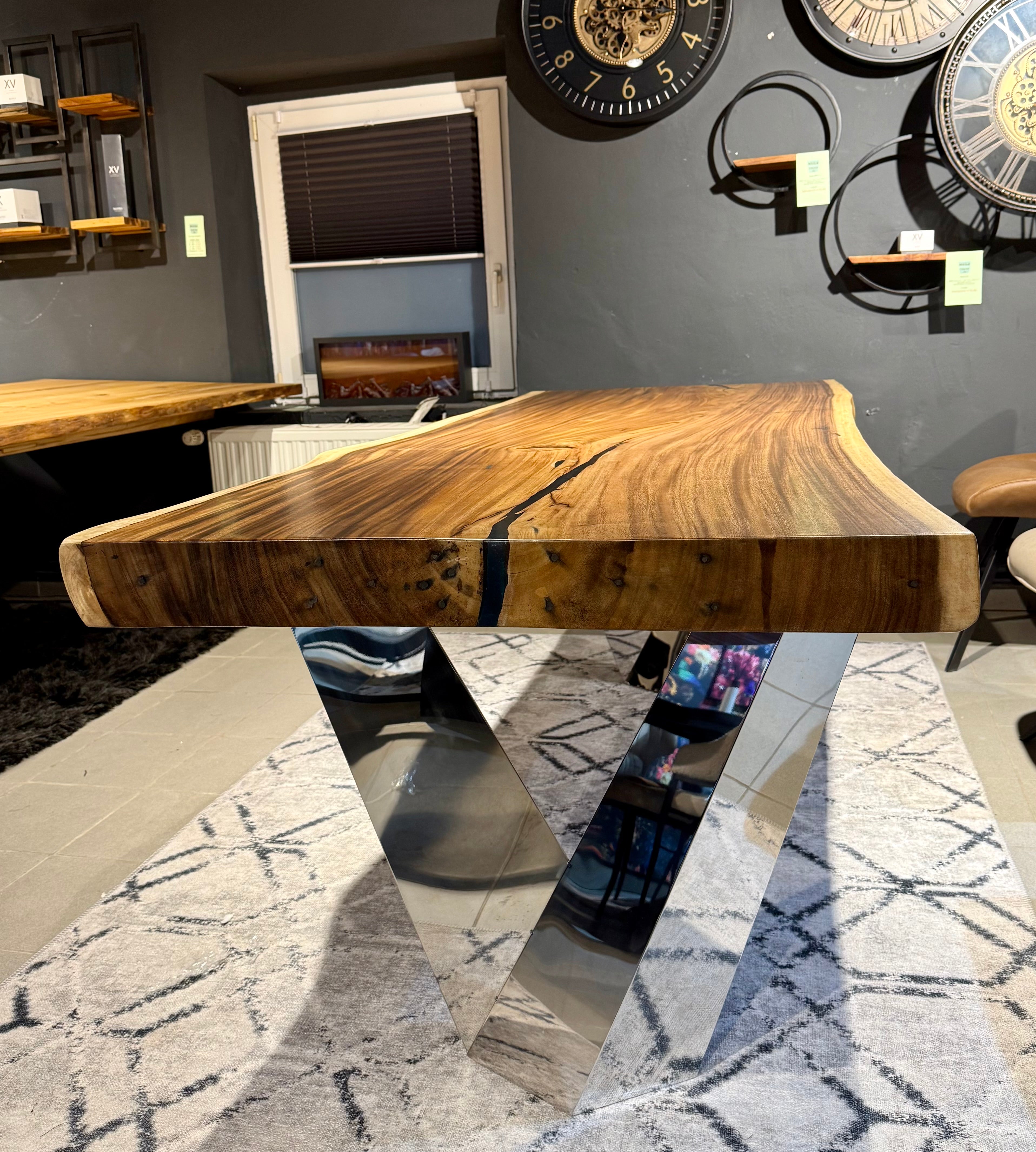 Mammut Baumstamm Esstisch Suar Mungur 210 lang und 9 cm massiv mit V-Gestell Set Chrom