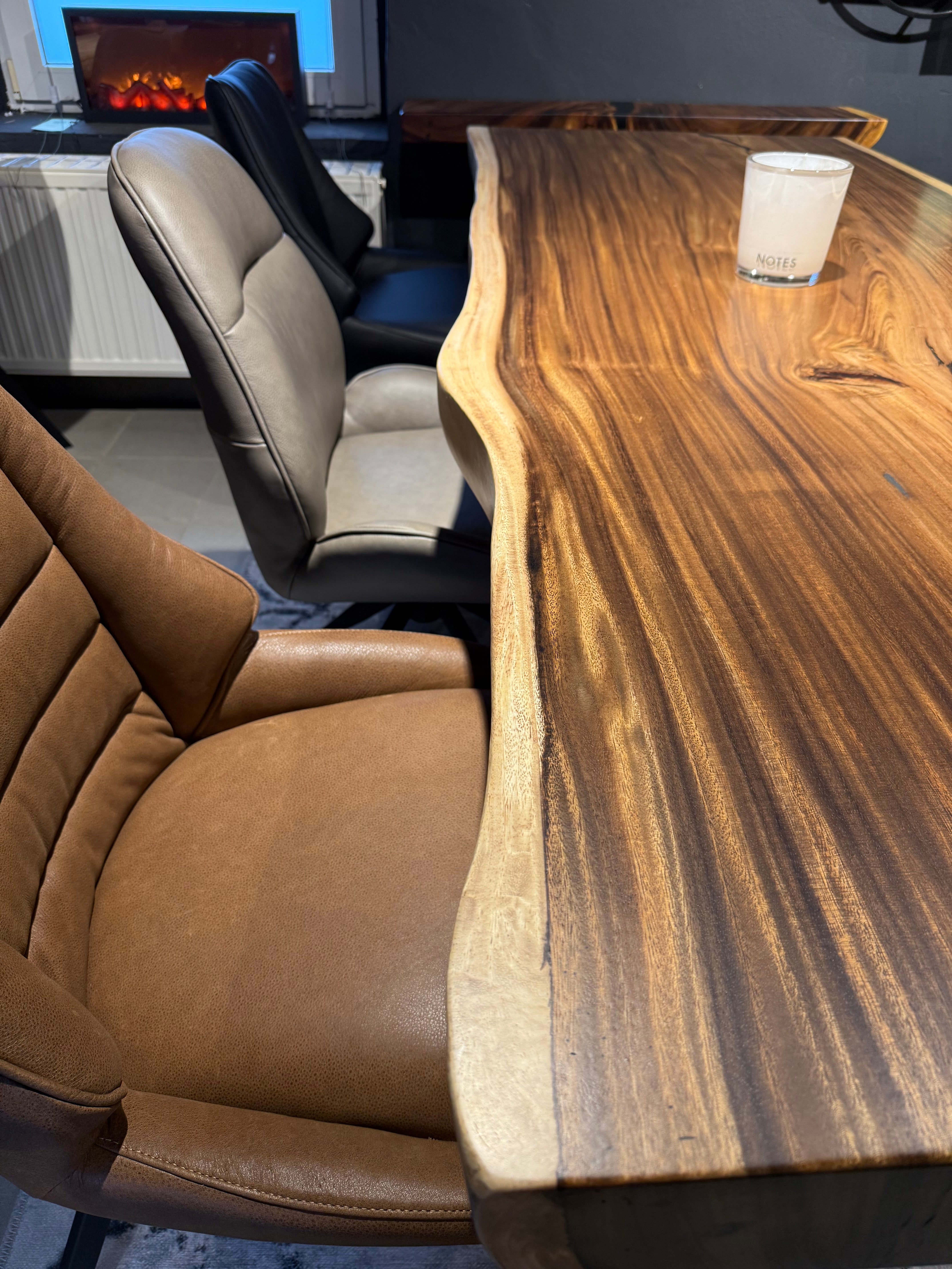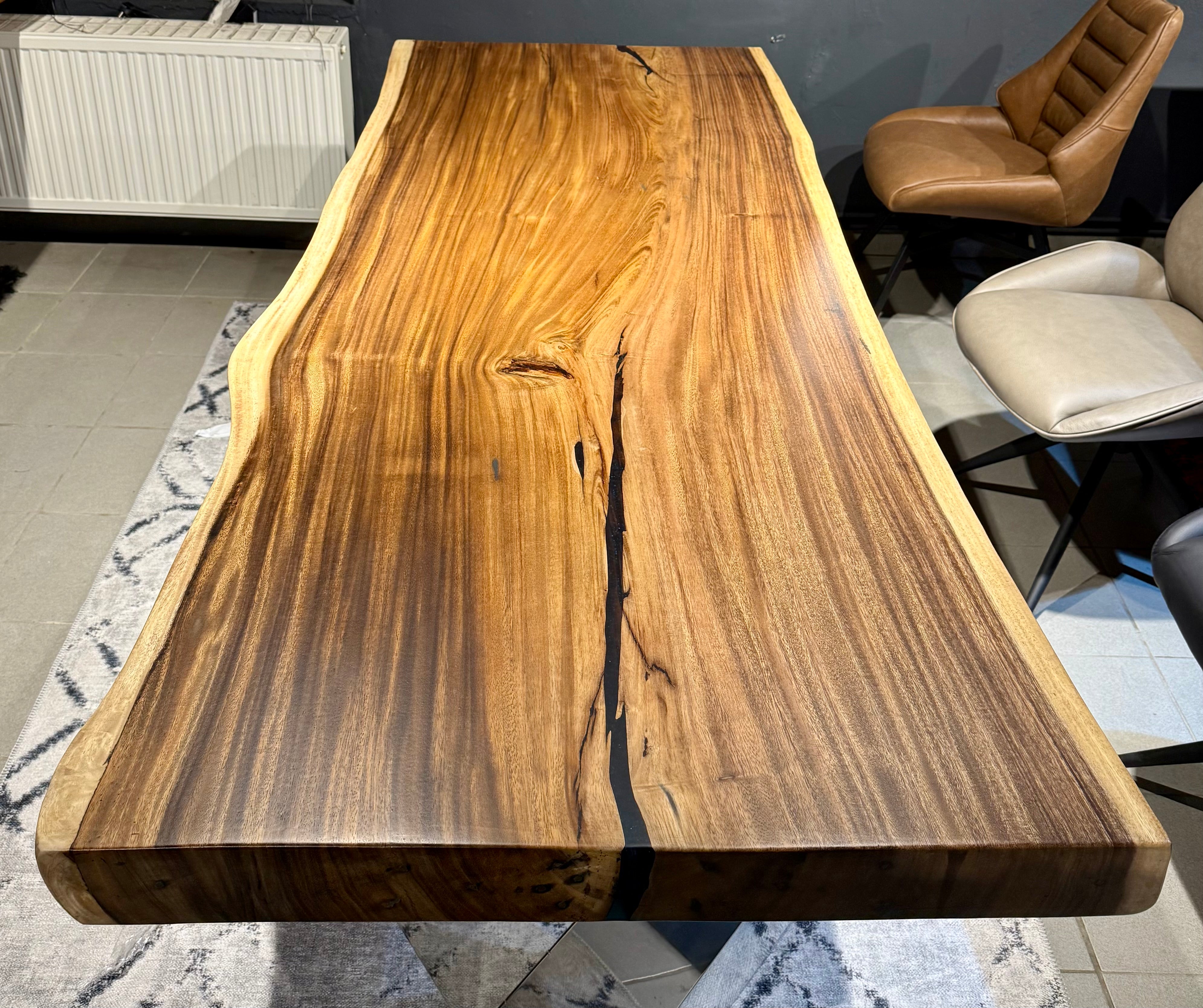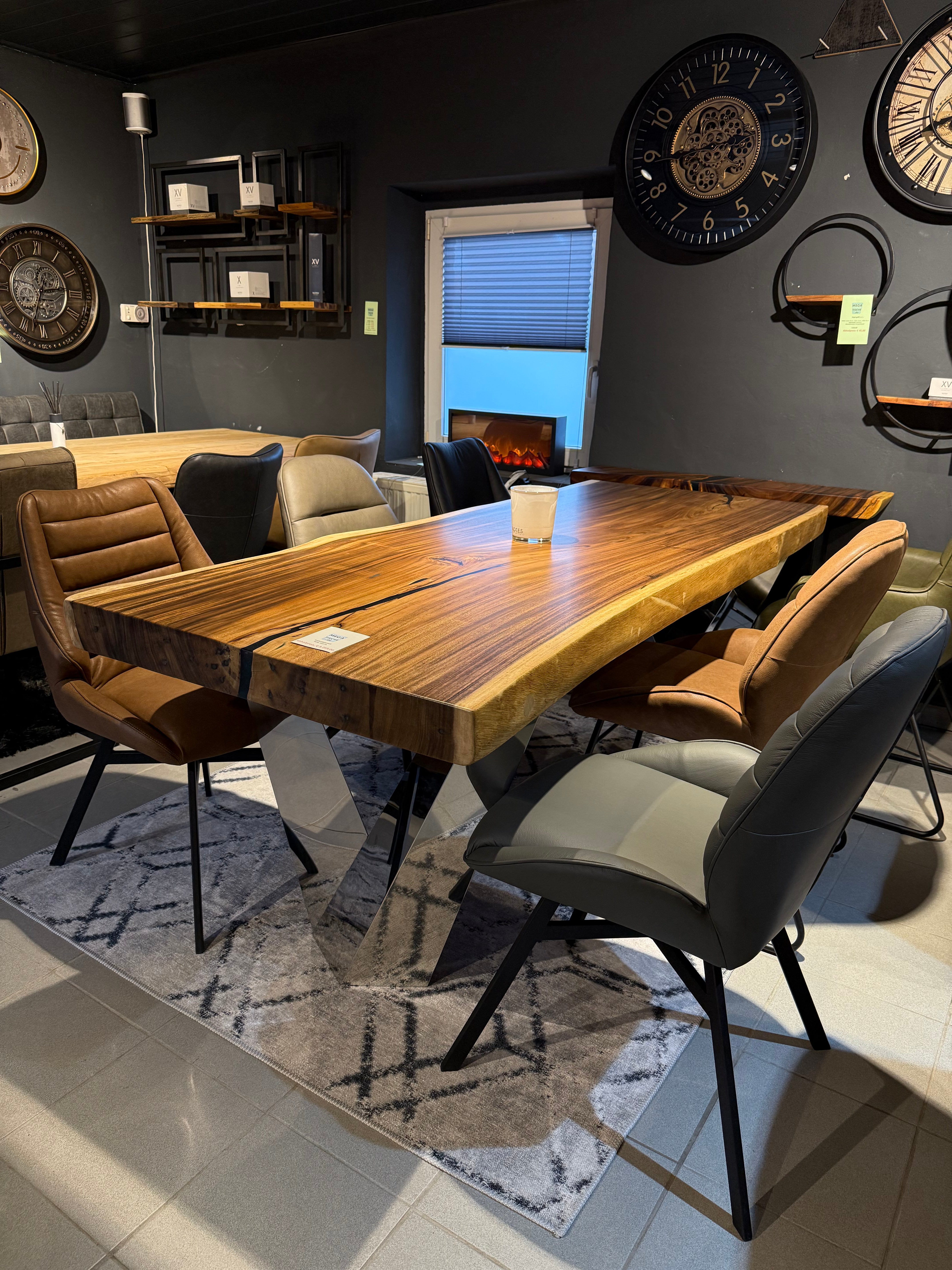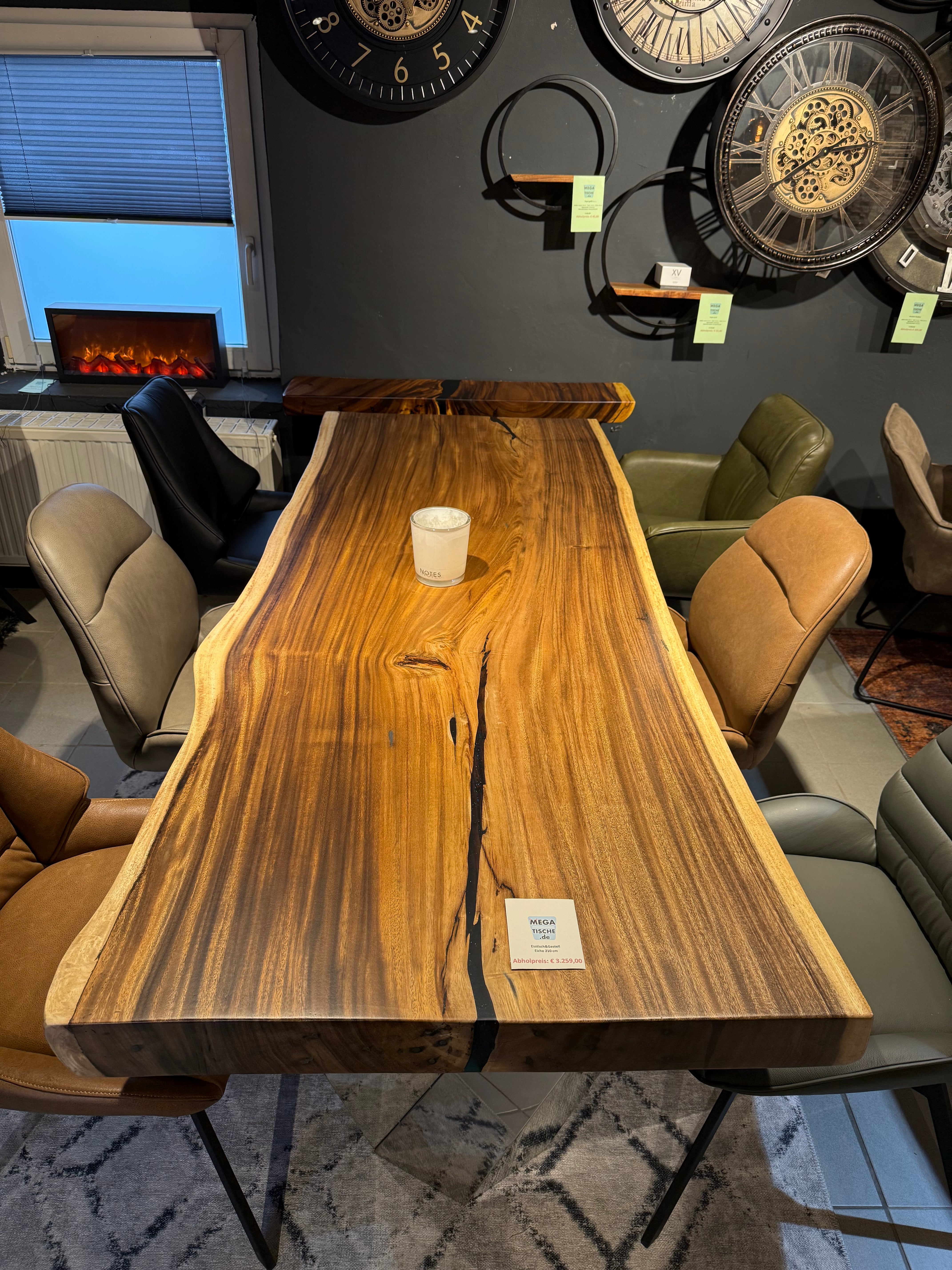 Mammut Baumstamm Esstisch Suar Mungur 210 lang und 9 cm massiv mit V-Gestell Set Chrom