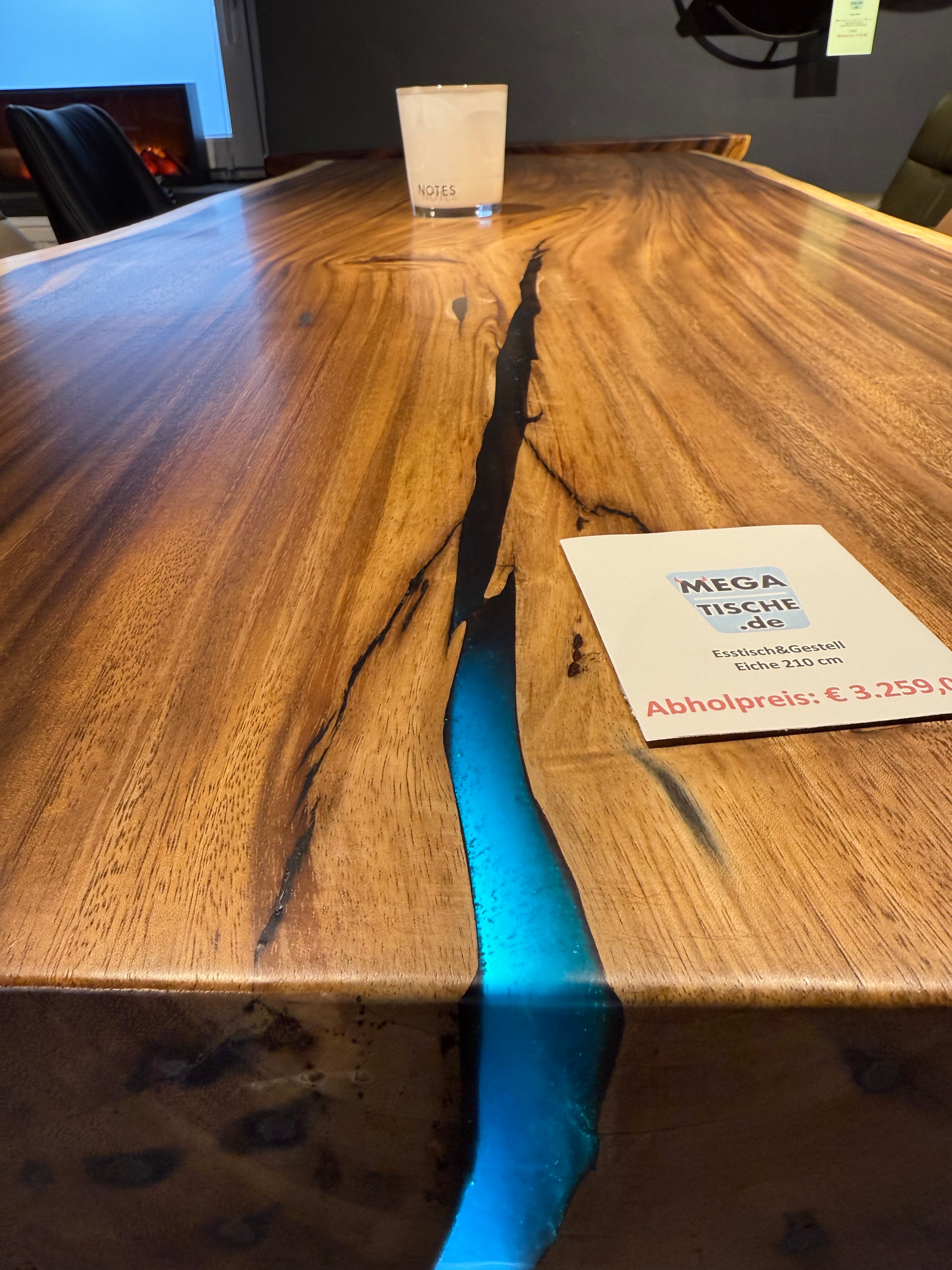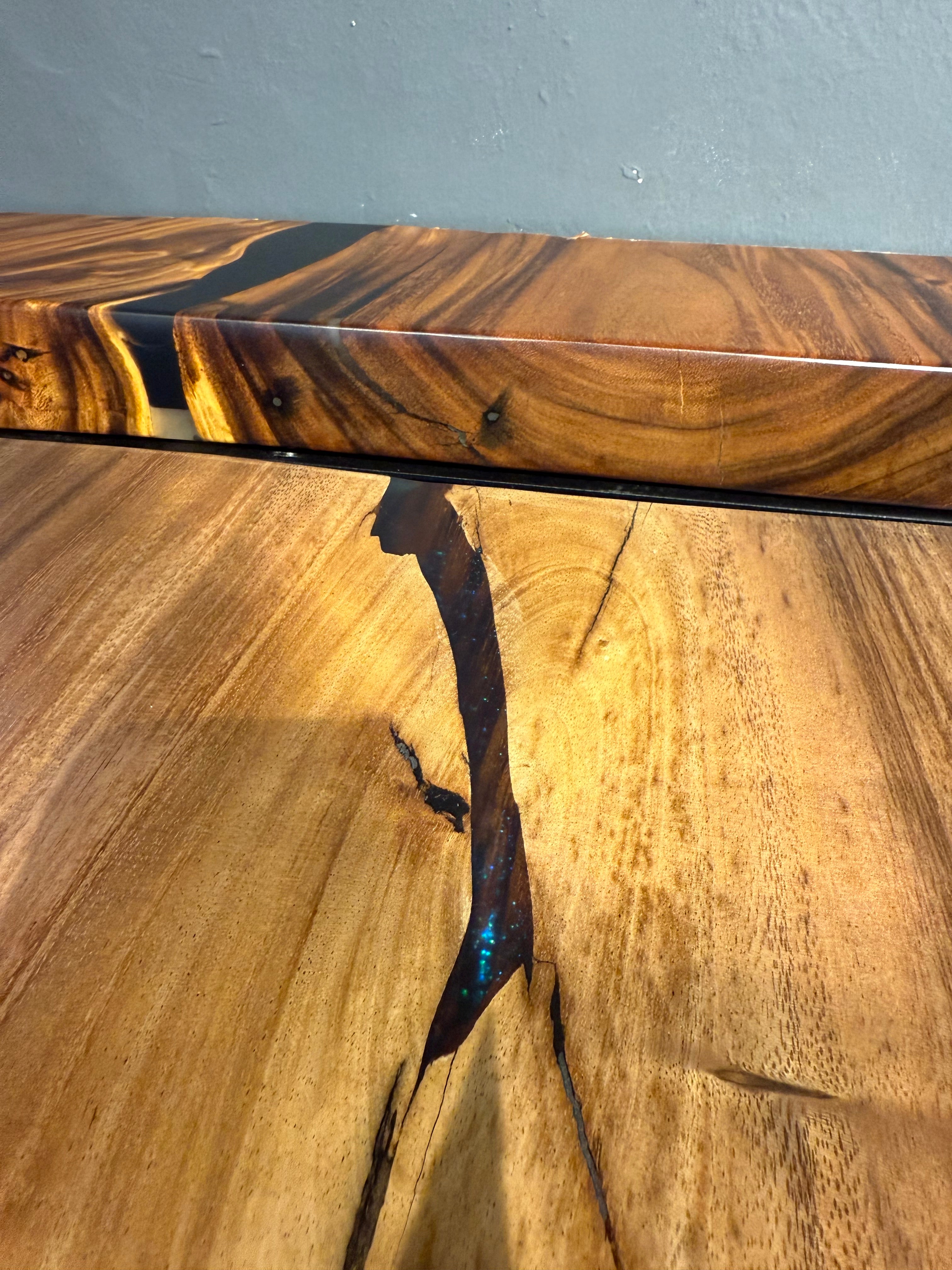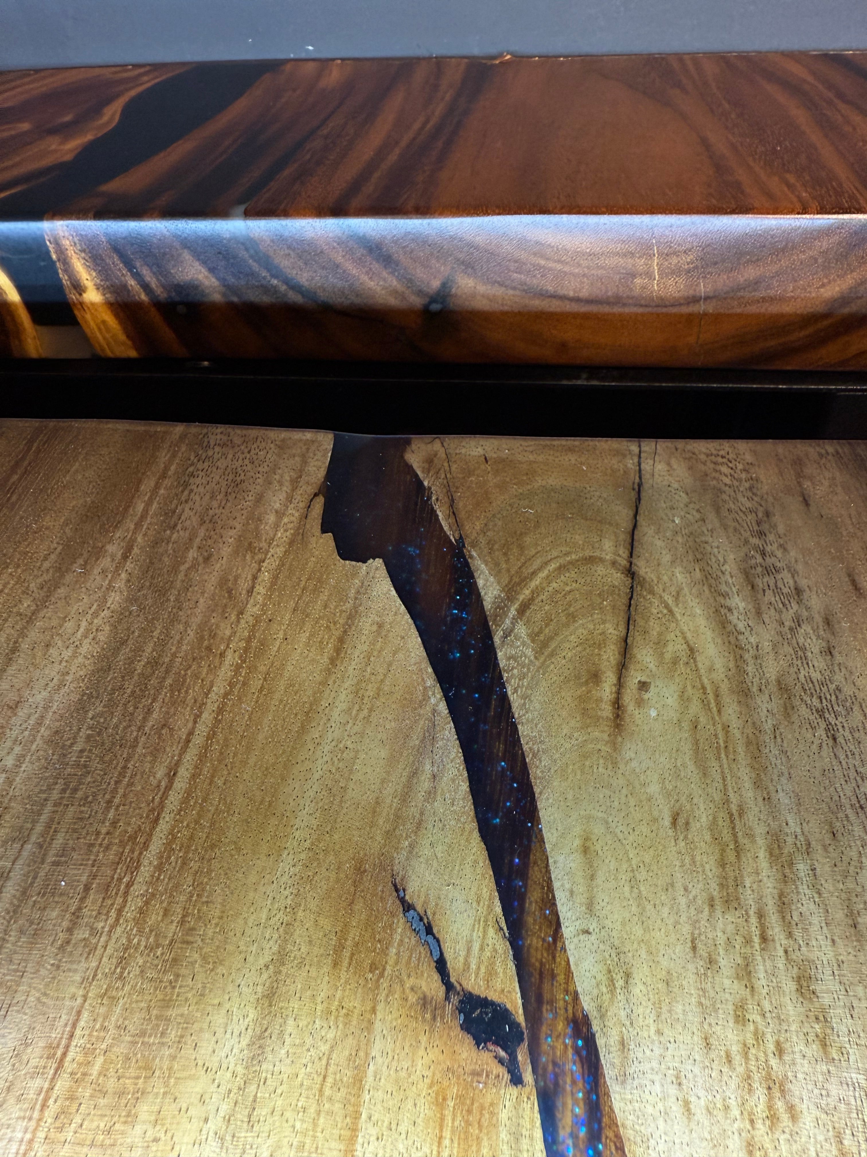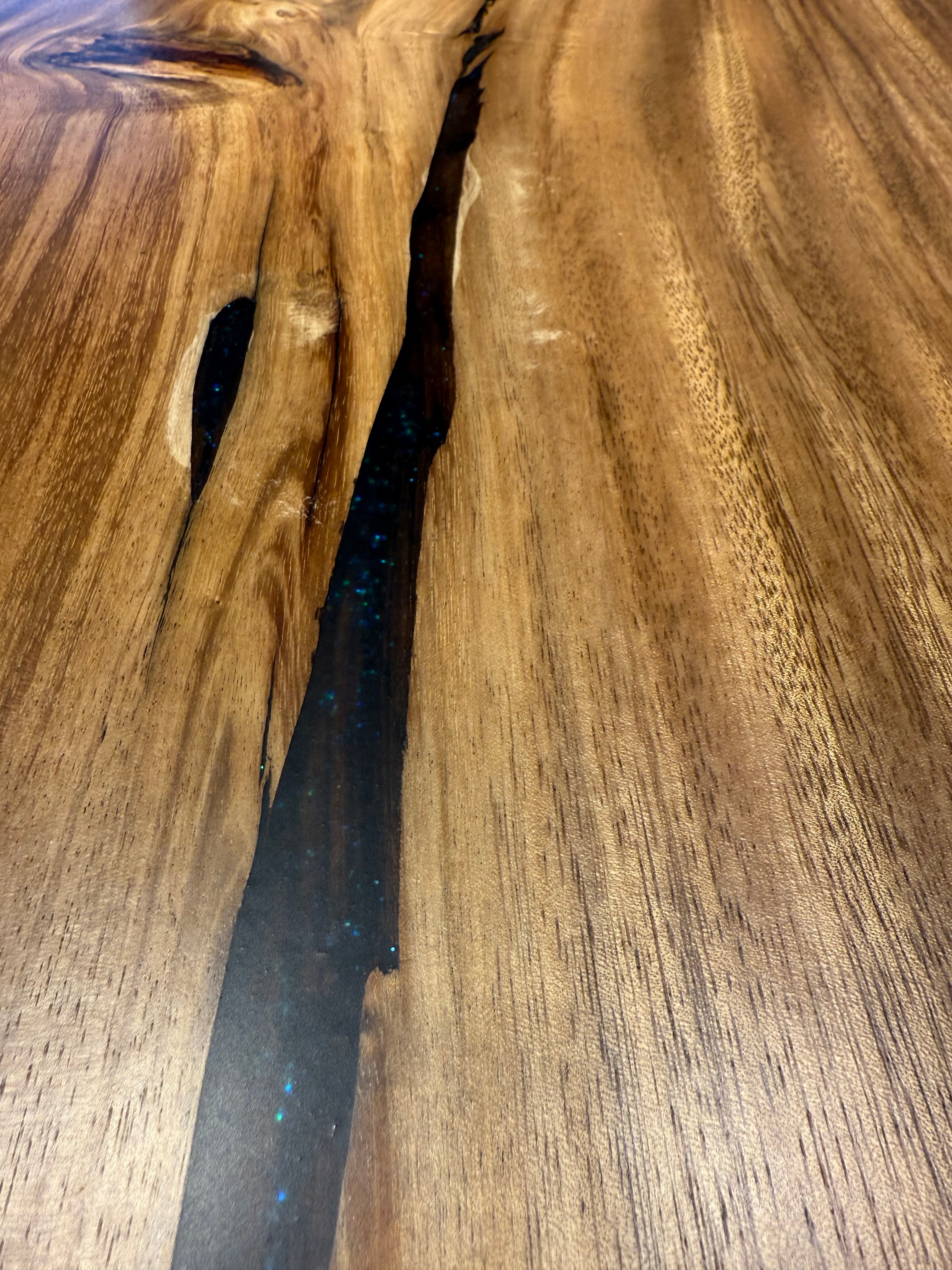 Die Tischoberfläche ist lackiert, mit hochwertigen und azurblauem glitter Epoxid aufgefüllt.