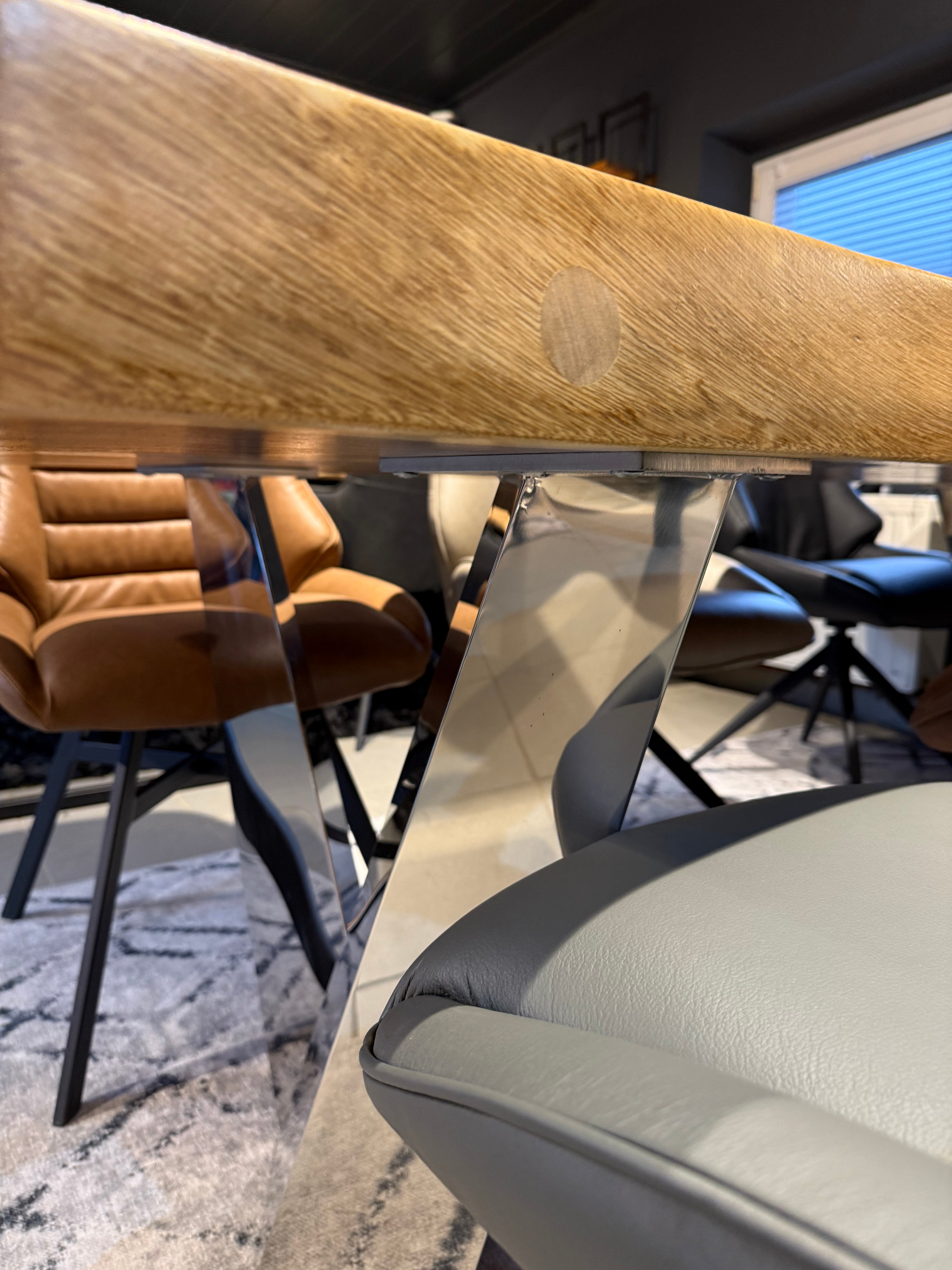 Der Holztisch hat ein verchromtes Tischuntergestell als Set in V Form.