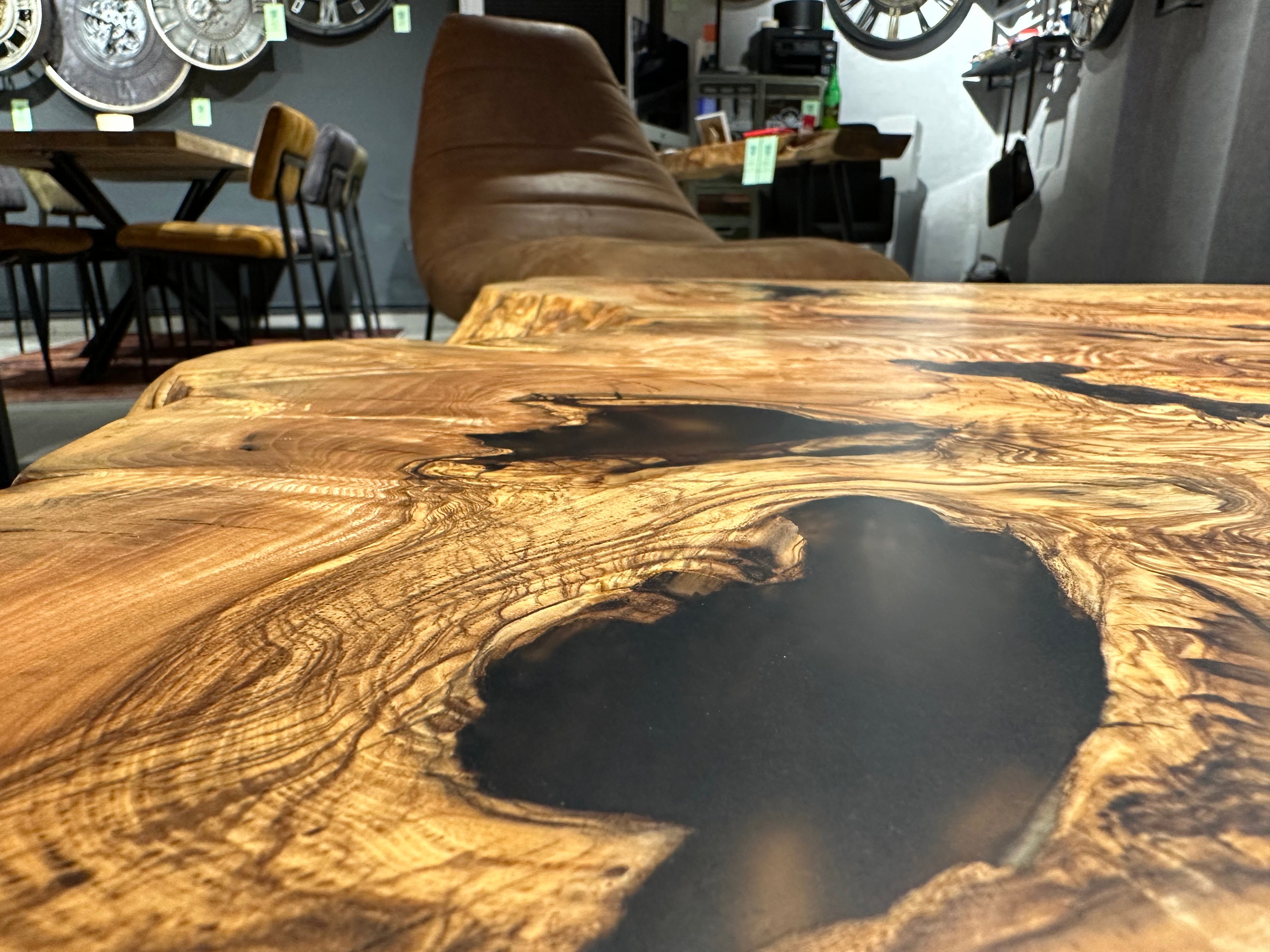 Diese einzigartige Platte haben wir von einem Bauernhof in Witten bekommen und sie dann gefräst, geschliffen und mit hochwertigen Epoxid aufgefüllt - zum guten Ende wurde der Couchtisch mit einem sehr hochwertigen Lack seidenmatt lackiert.