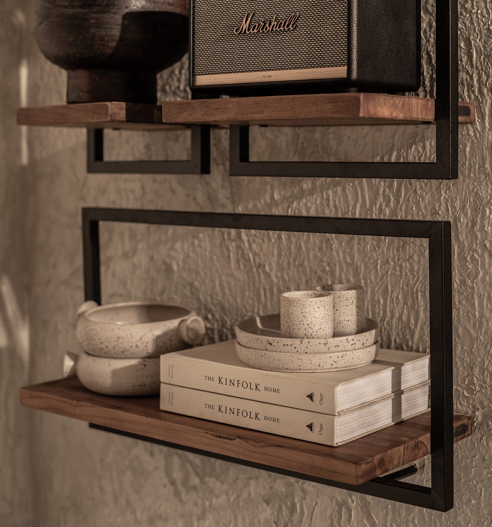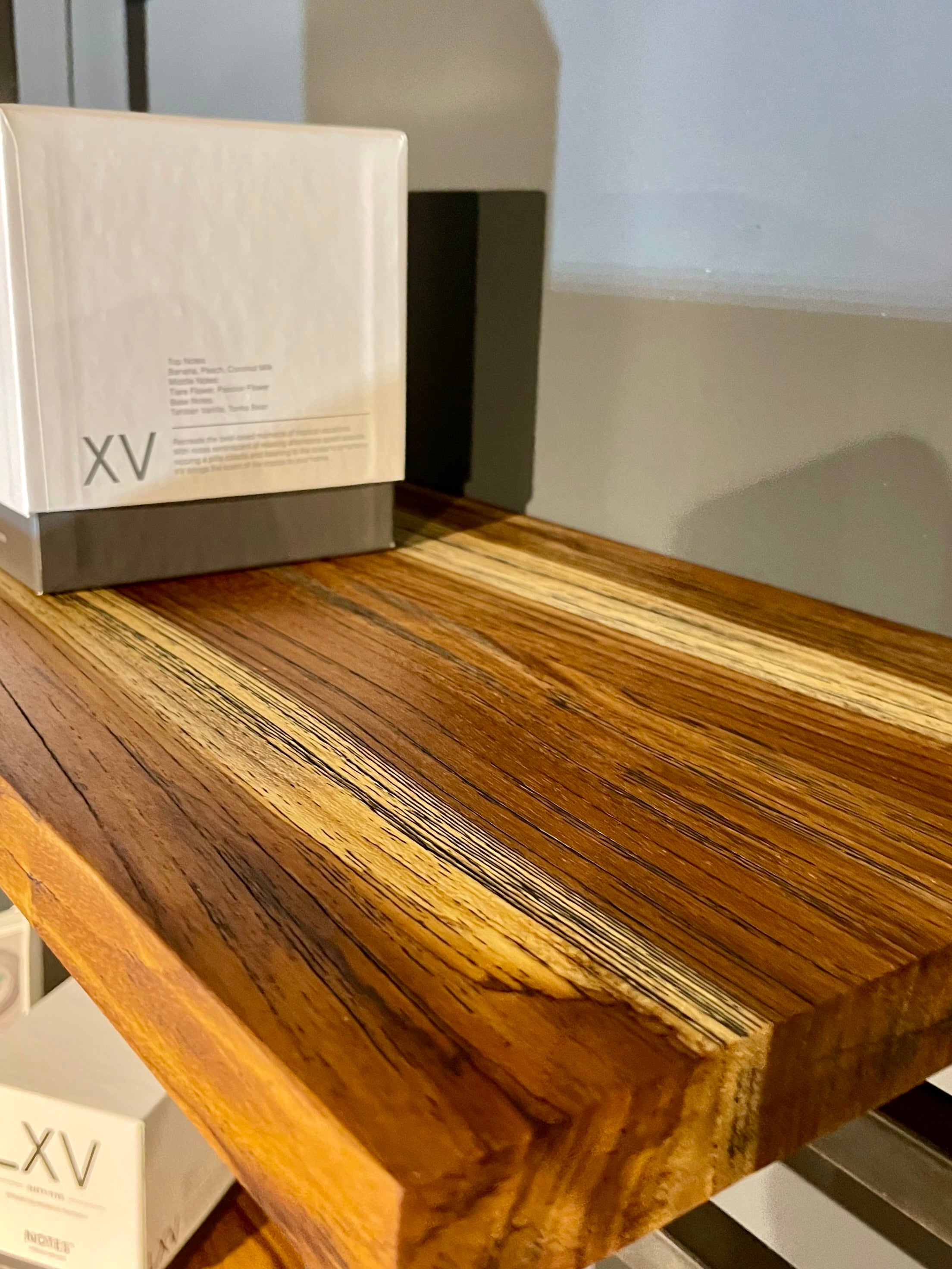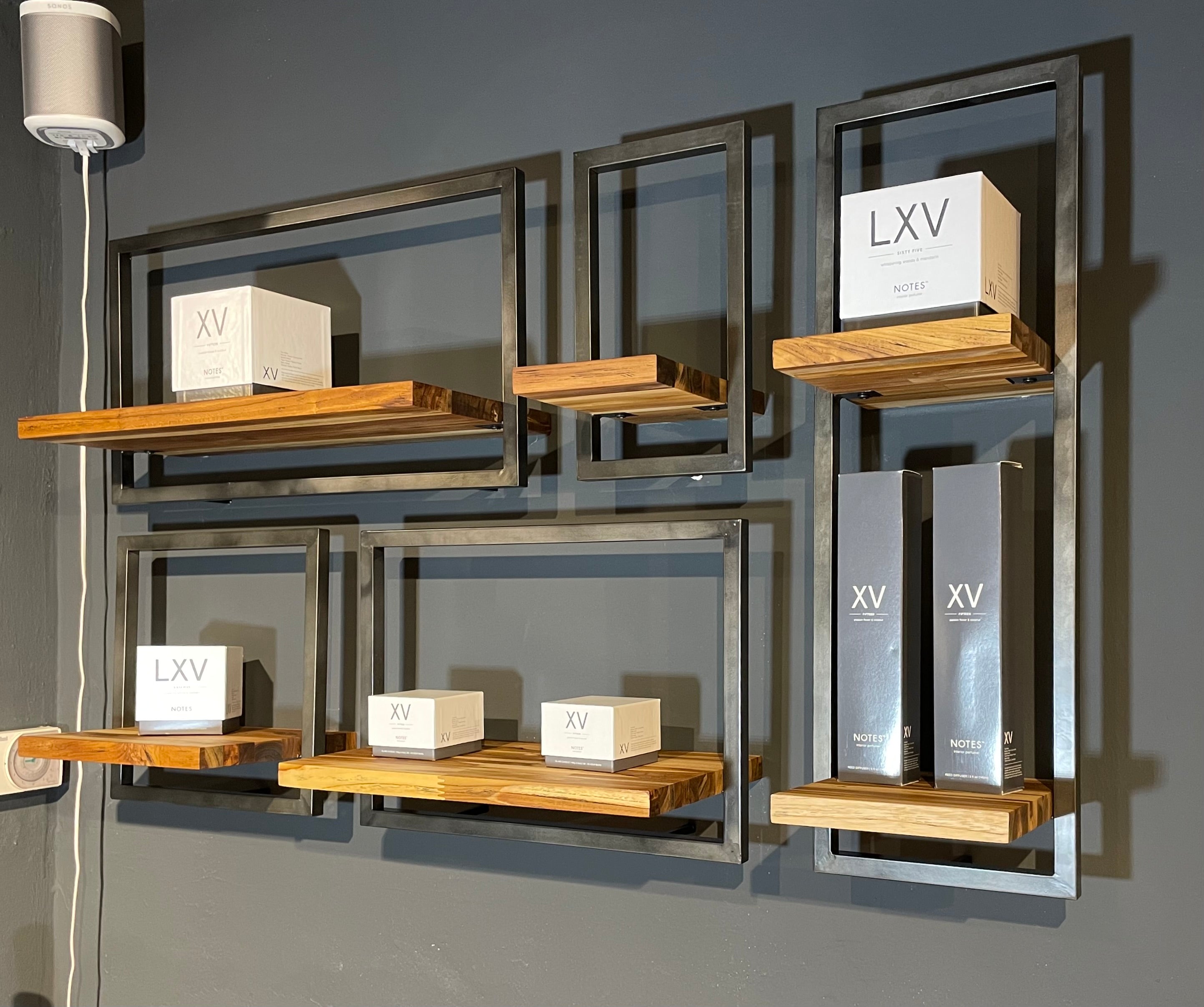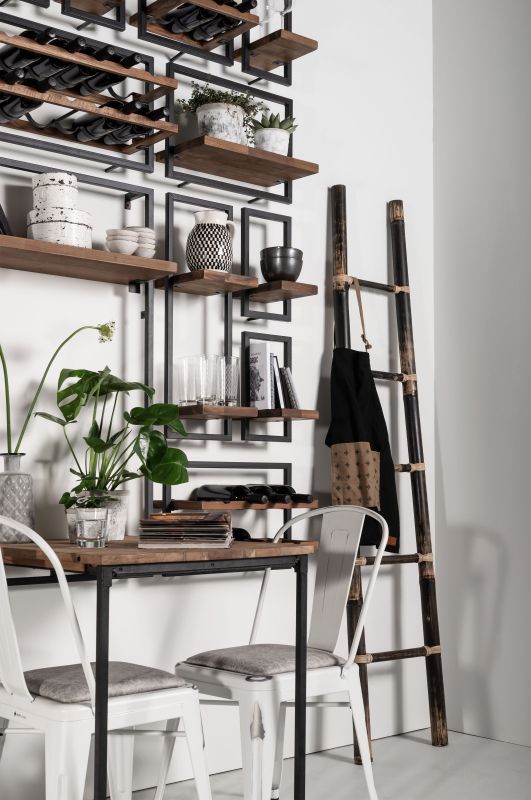 Die Regale sind handgefertigt aus Eisen und aus recyceltem Teakholz, das aus alten javanischen Häusern stammt.