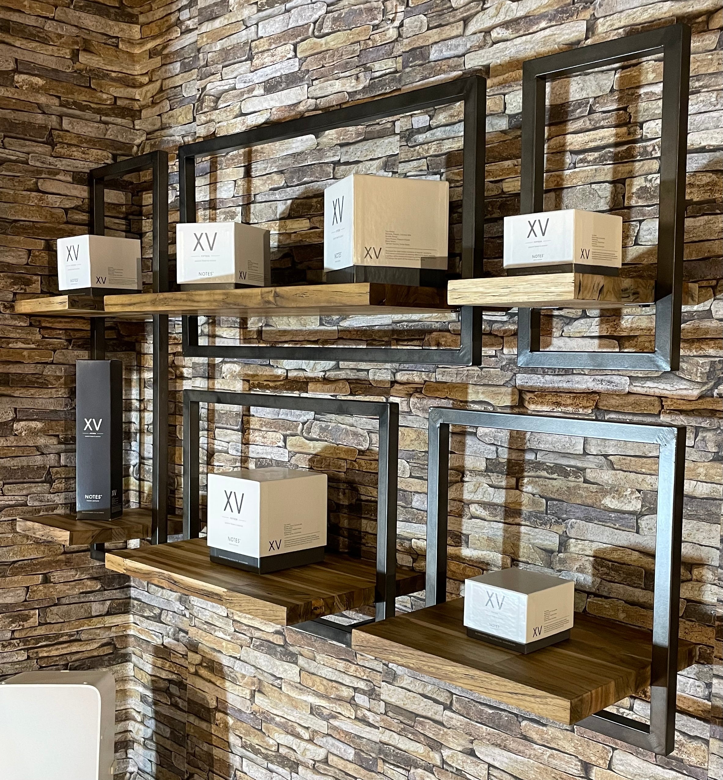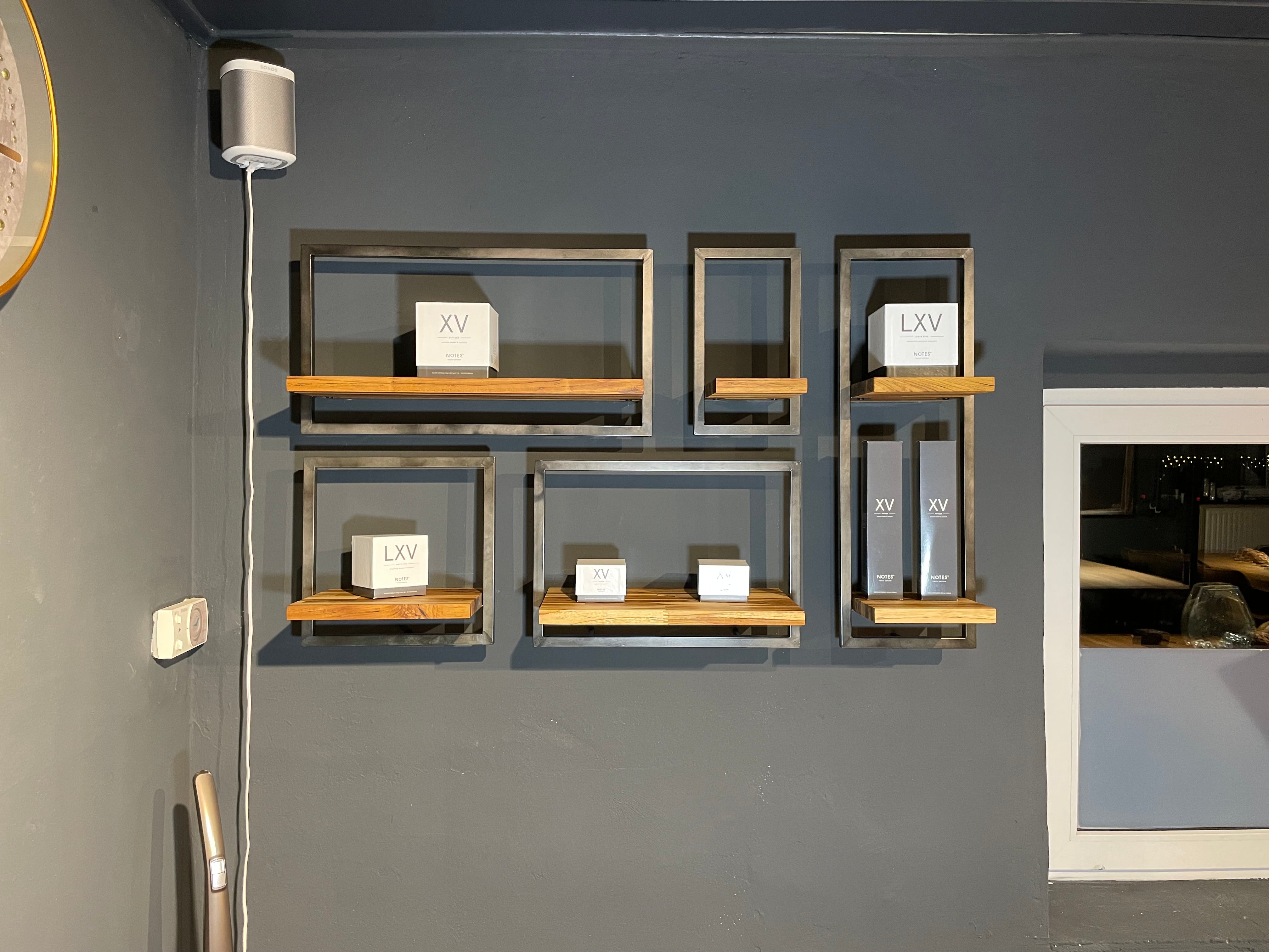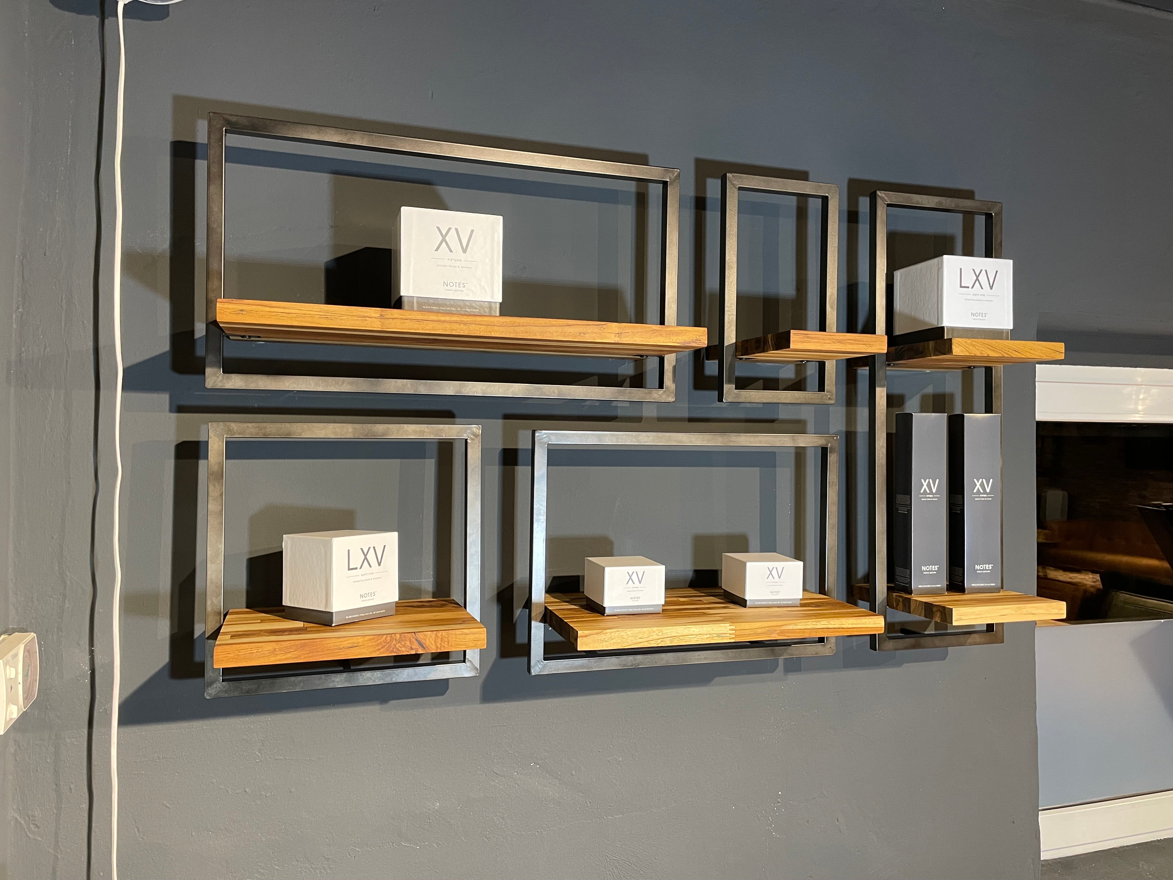 Die Regale sind handgefertigt aus Eisen und aus recyceltem Teakholz, das aus alten javanischen Häusern stammt.