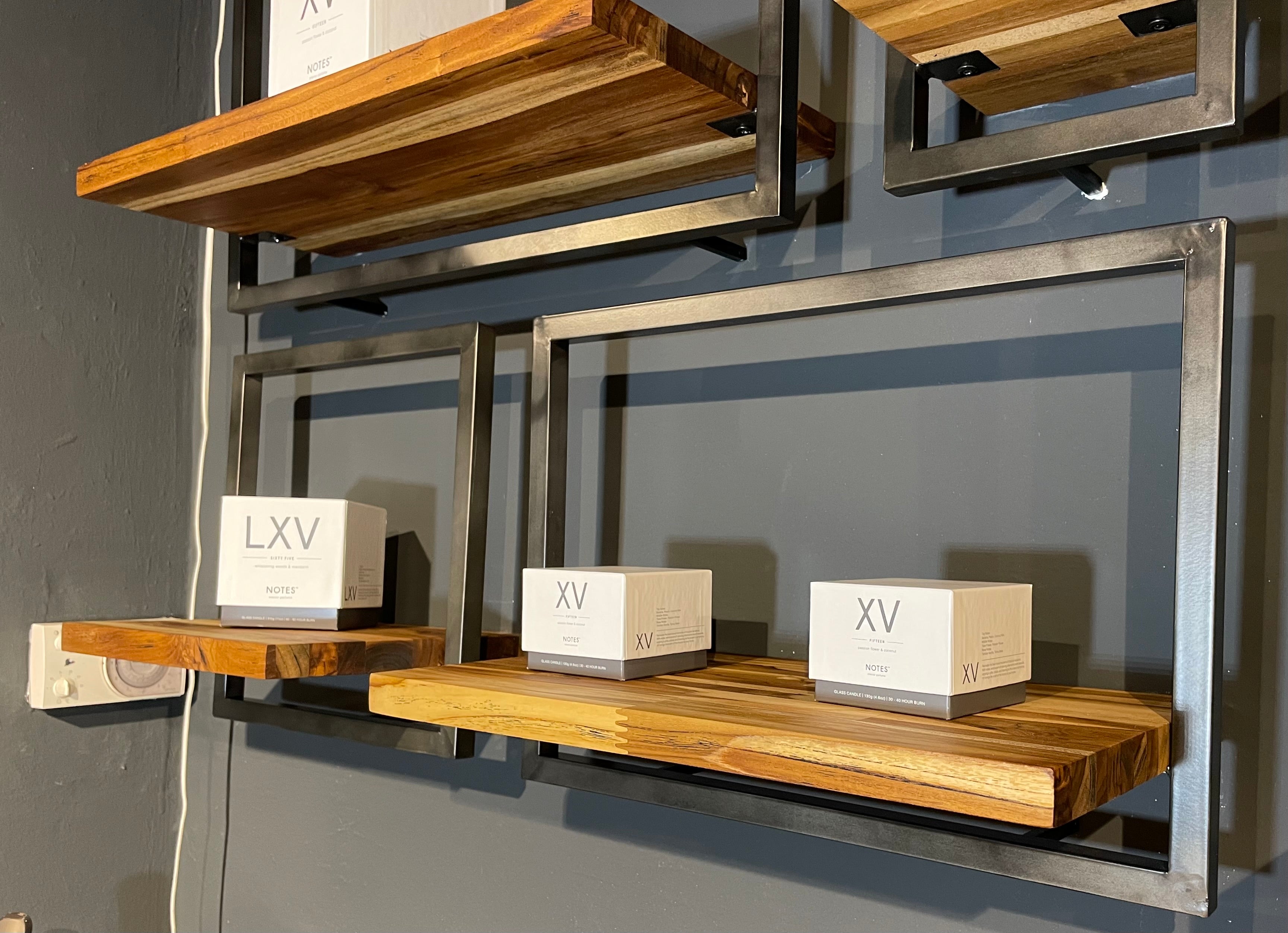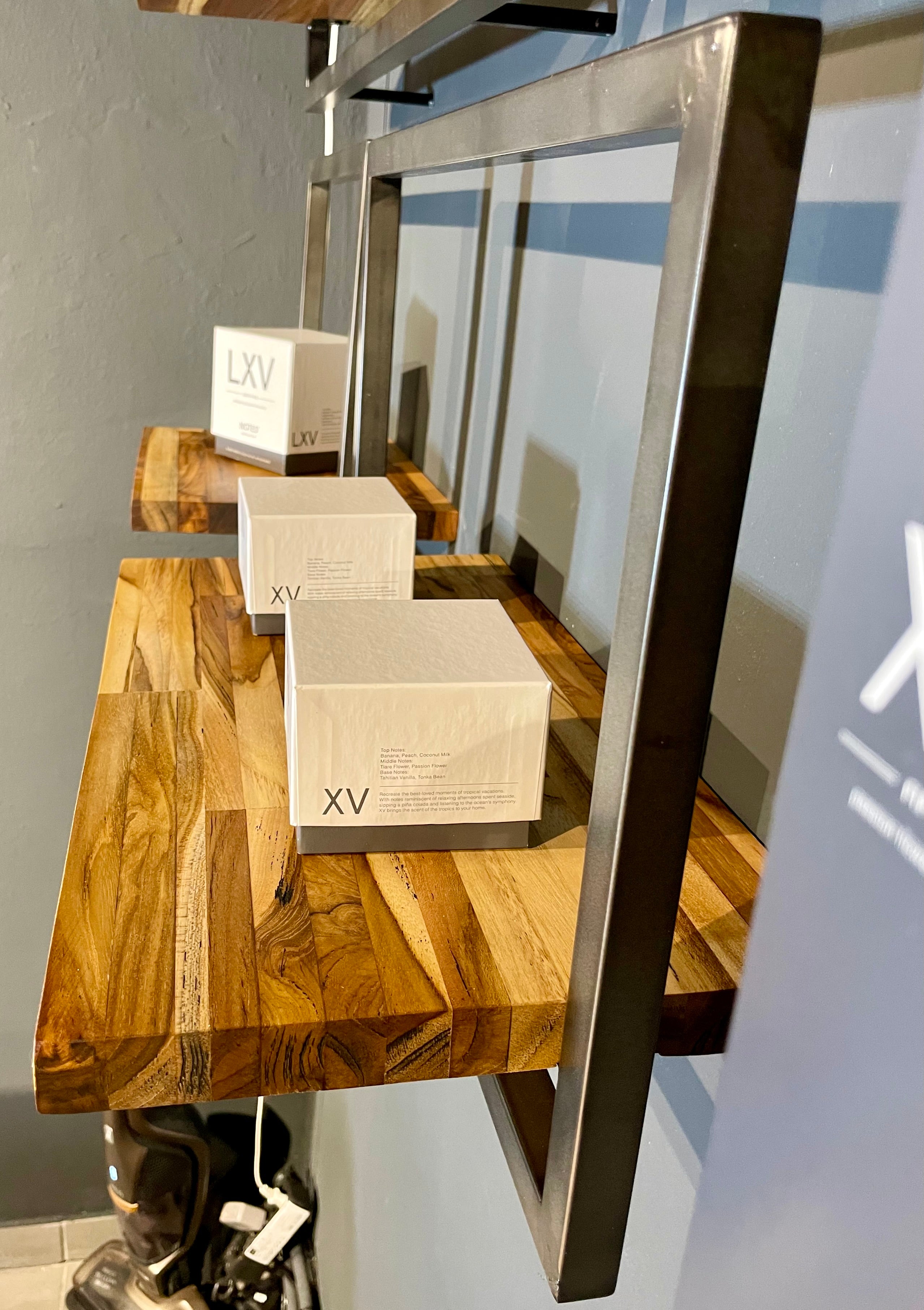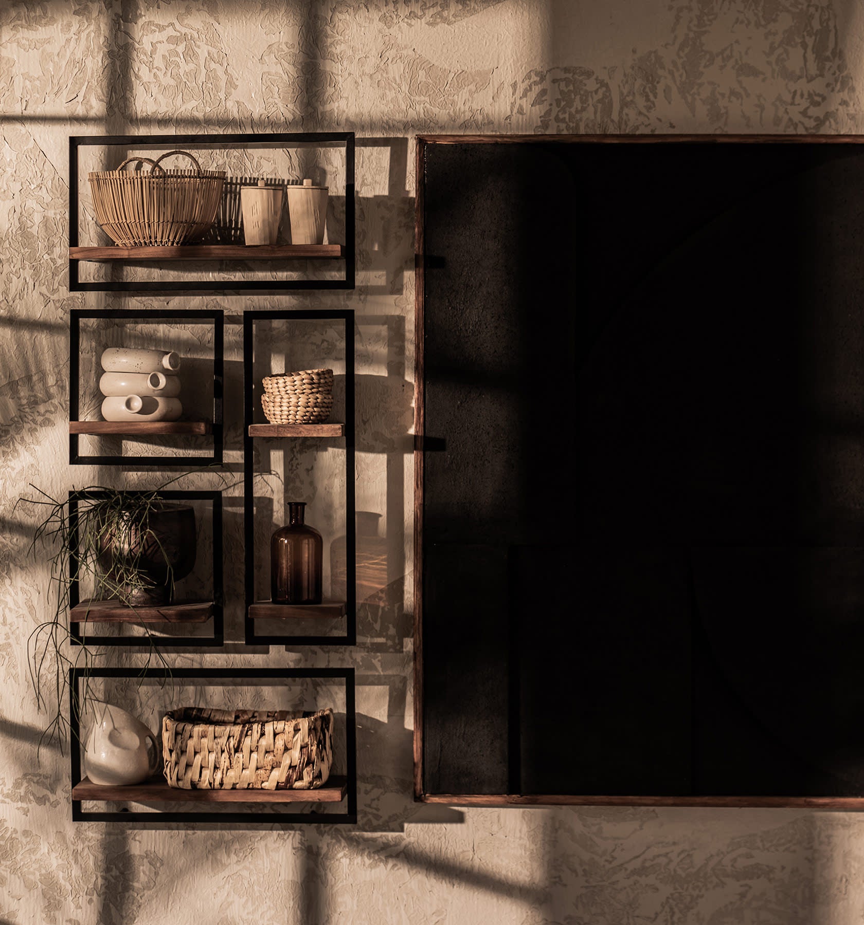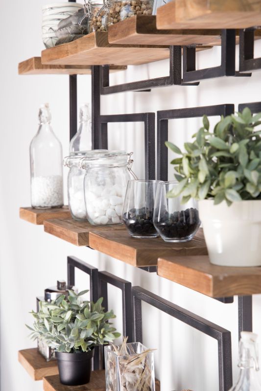 Die Regale sind handgefertigt aus Eisen und aus recyceltem Teakholz, das aus alten javanischen Häusern stammt.