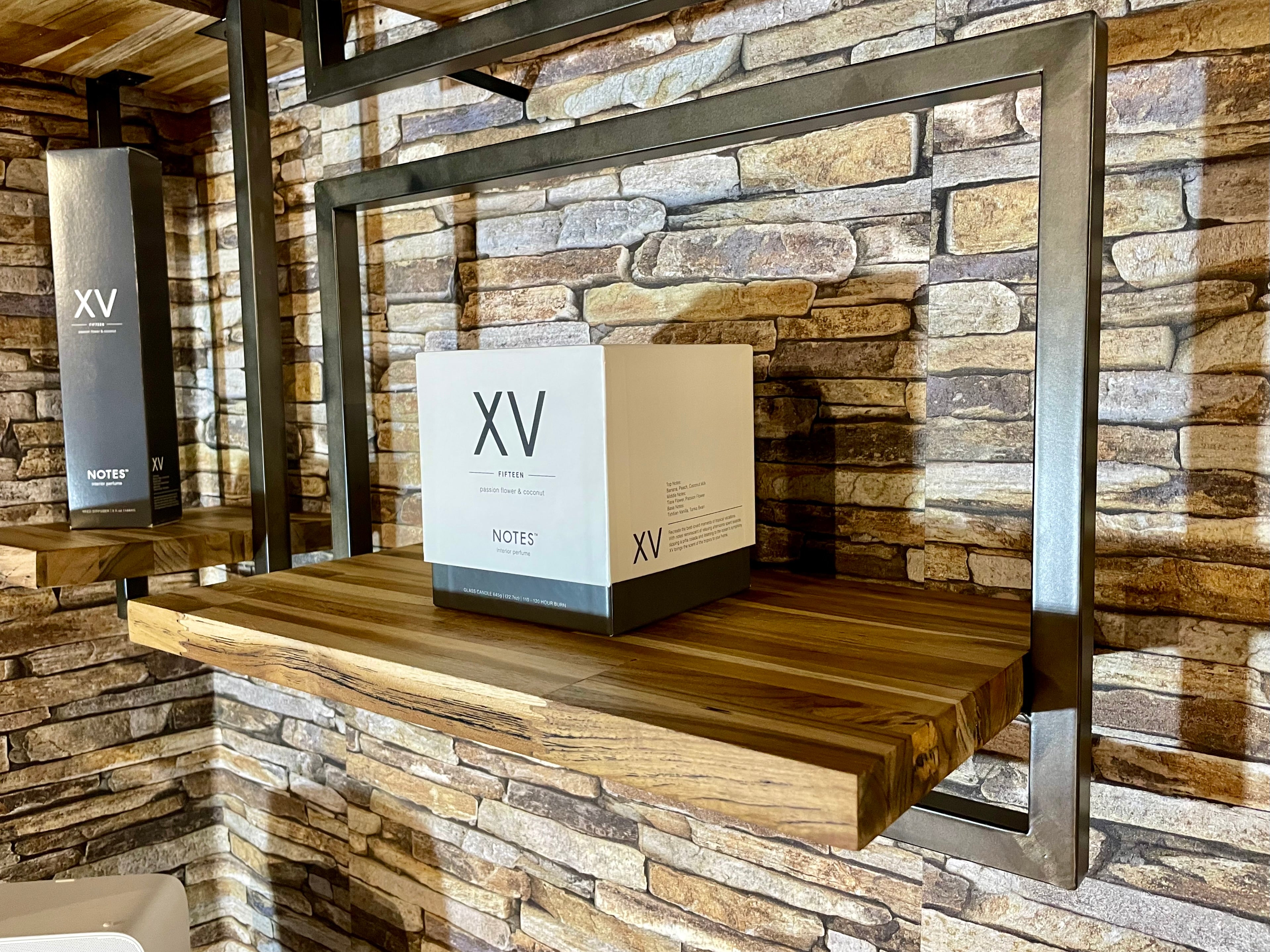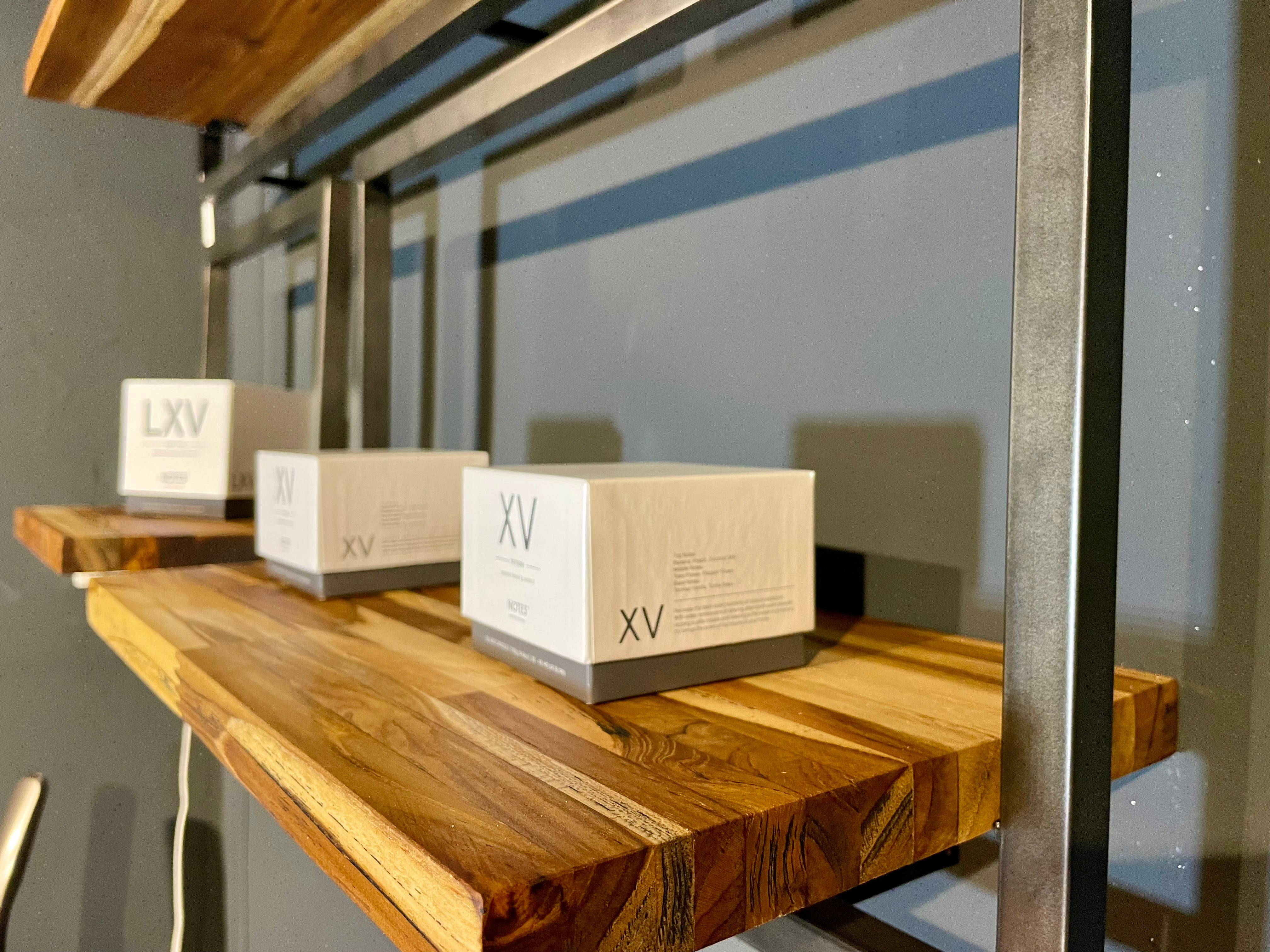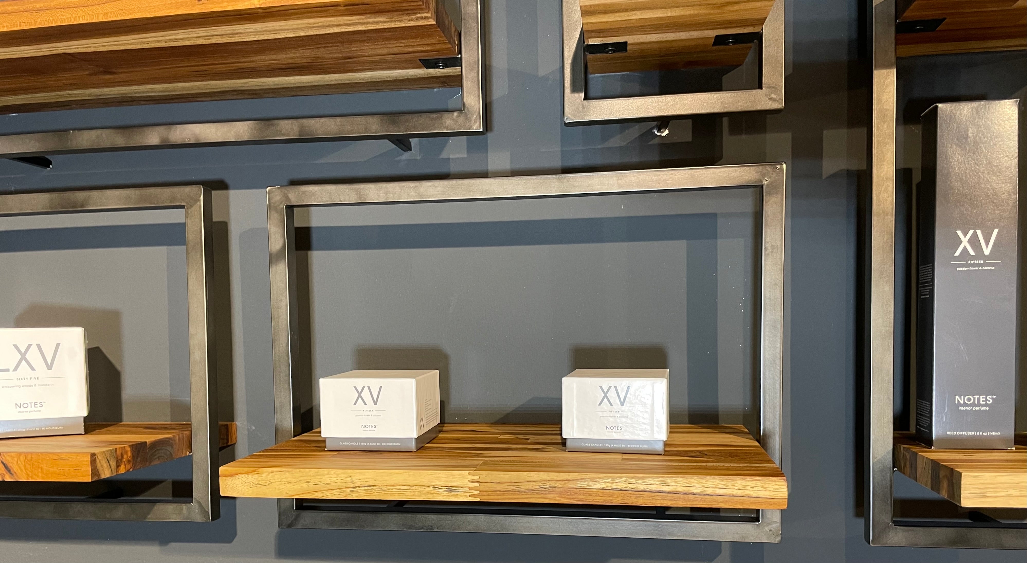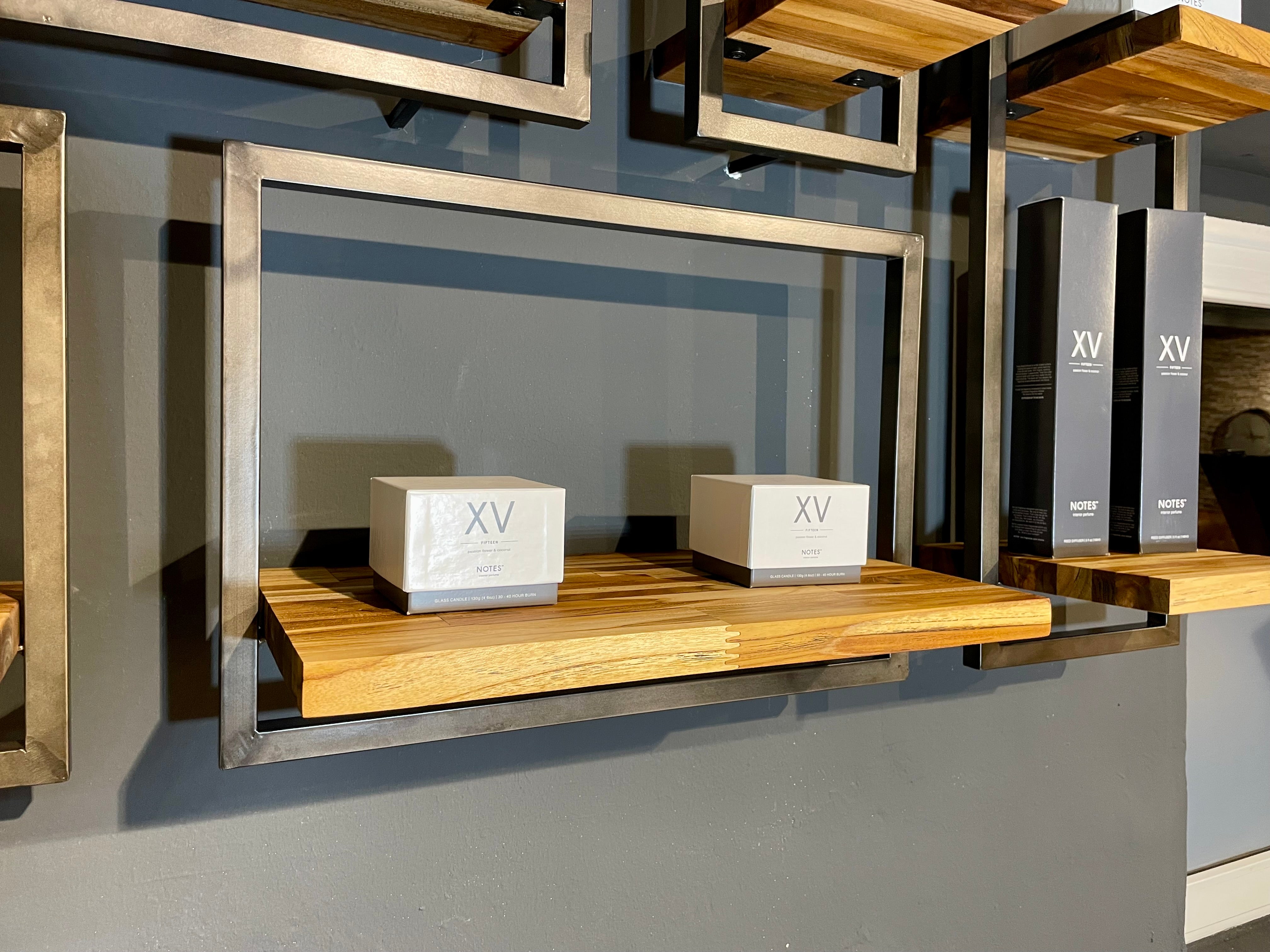 Die Regale sind handgefertigt aus Eisen und aus recyceltem Teakholz, das aus alten javanischen Häusern stammt.