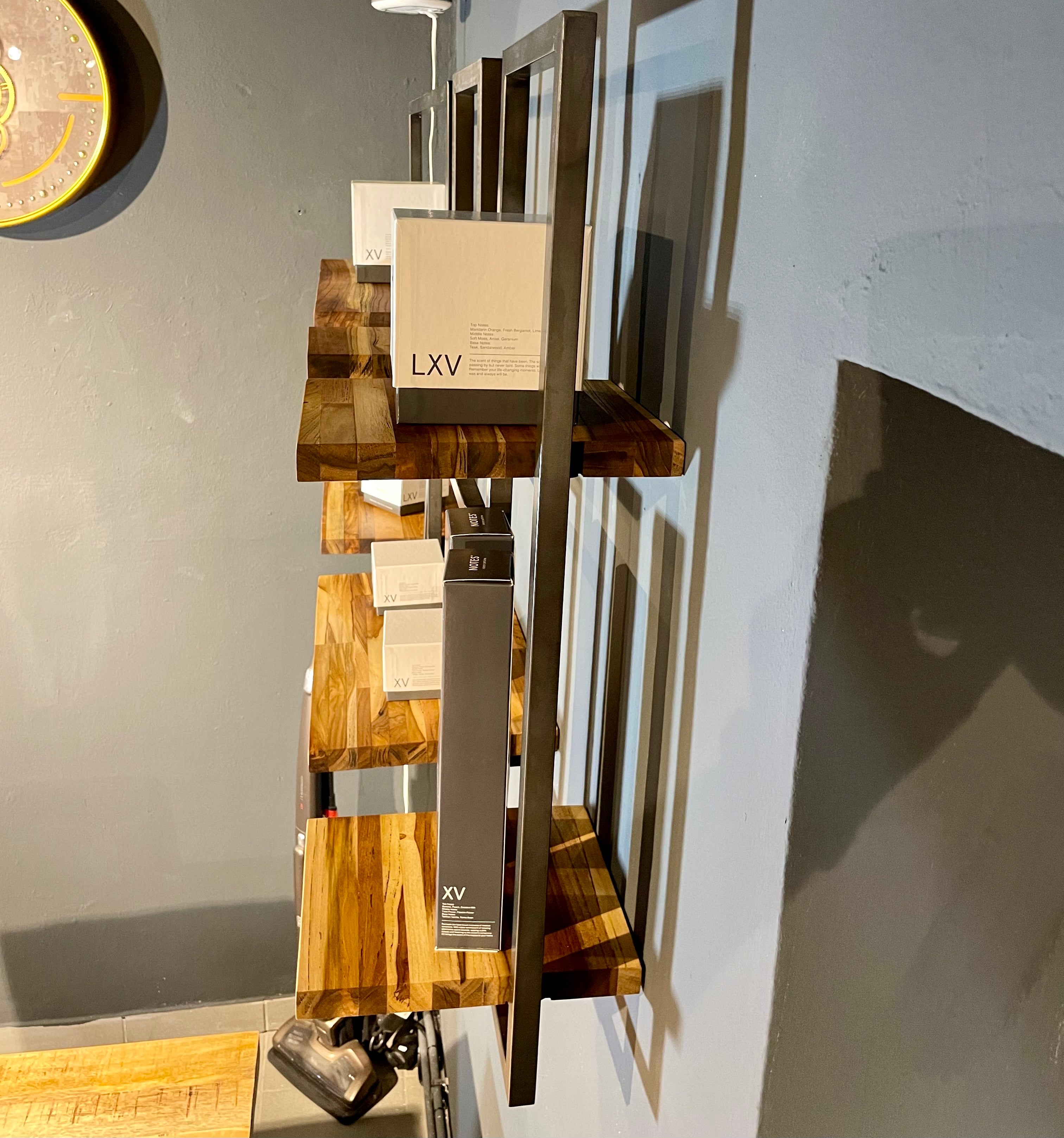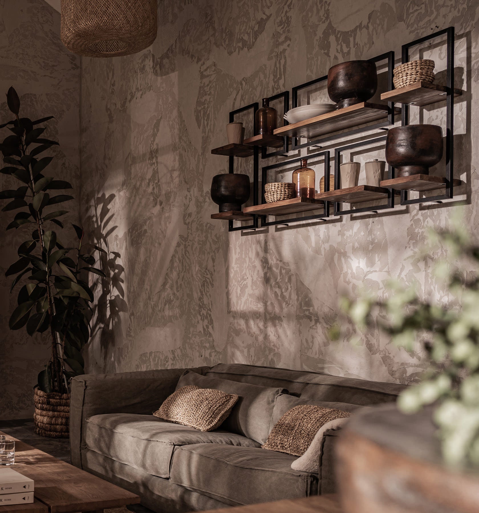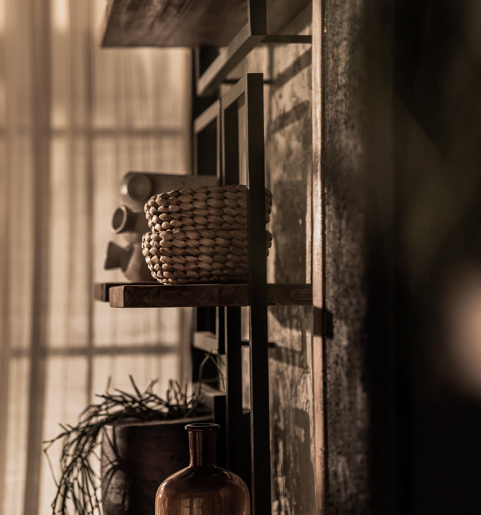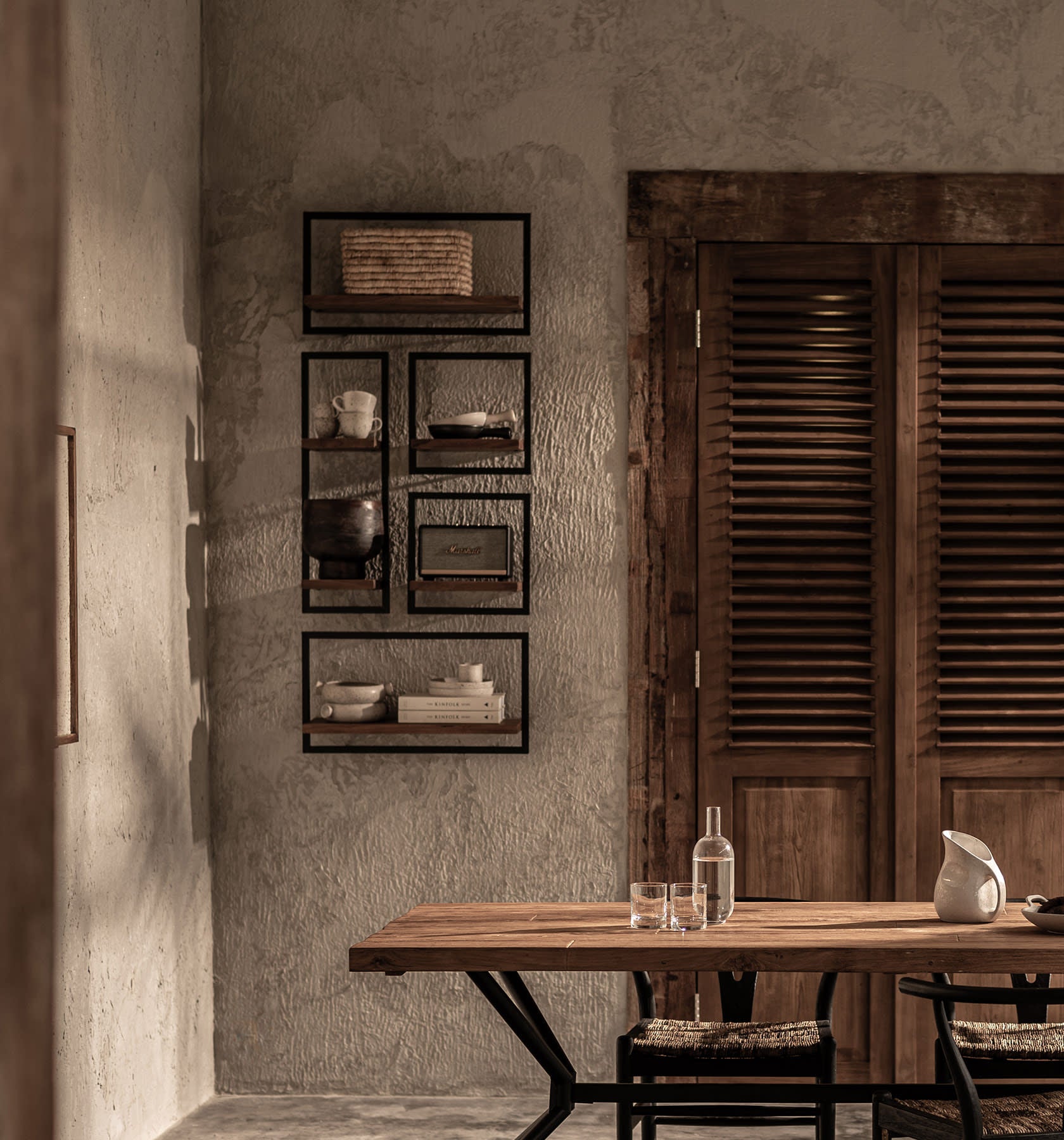Die Regale sind handgefertigt aus Eisen und aus recyceltem Teakholz, das aus alten javanischen Häusern stammt.