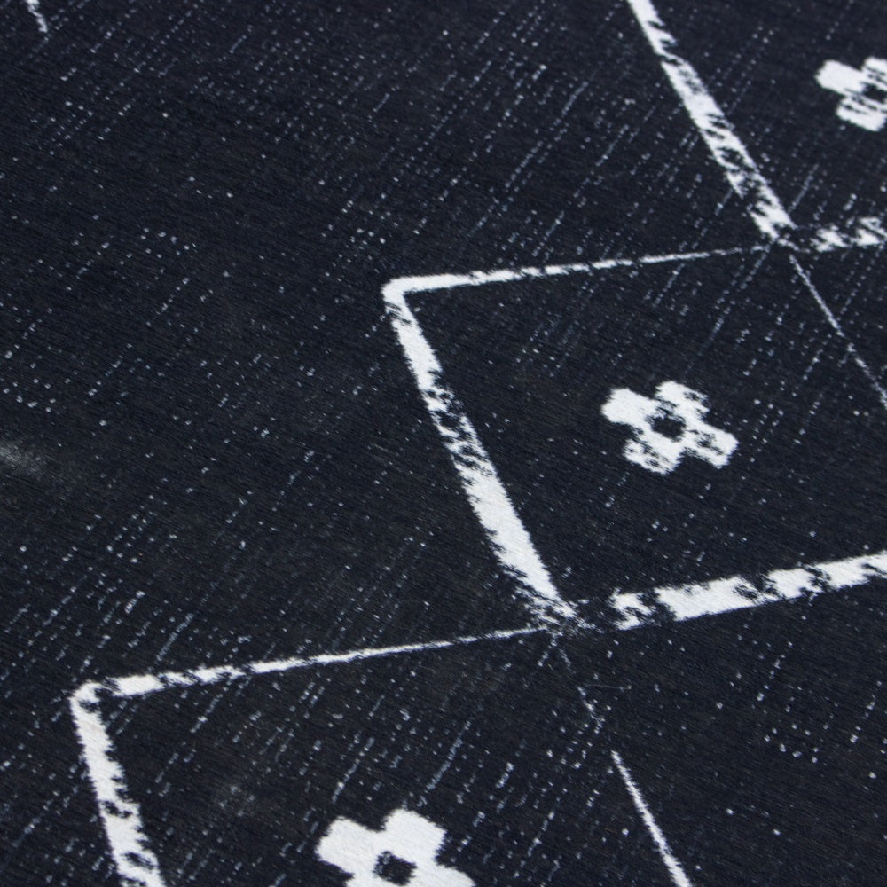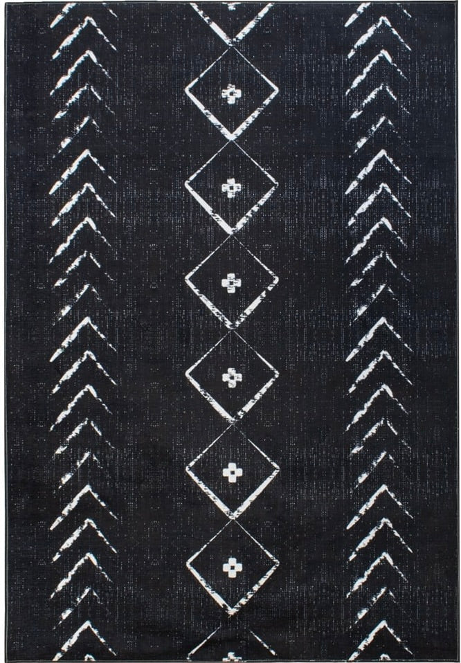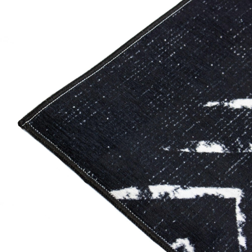 Der Teppich ist überwiegend in schwarzer Farbe gehalten.
