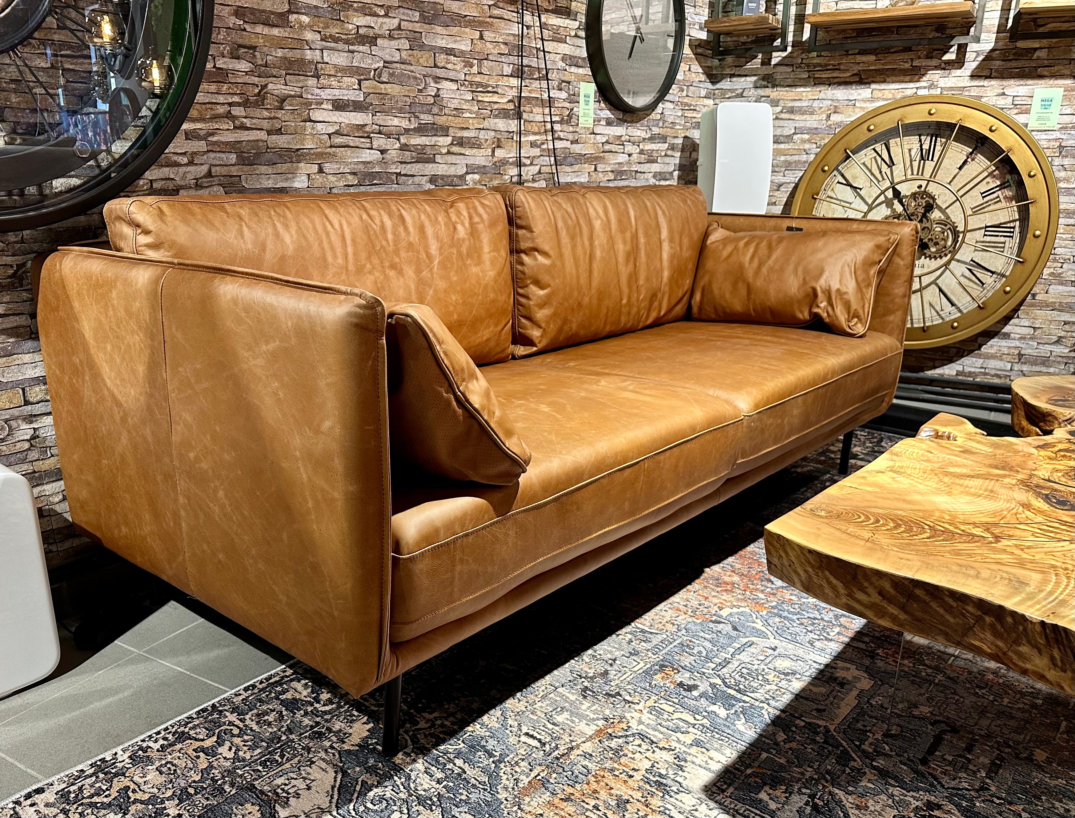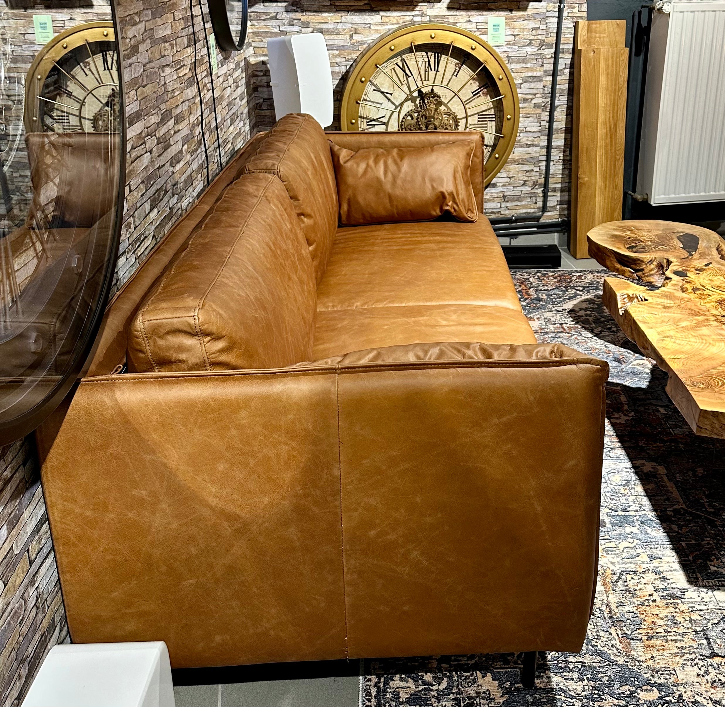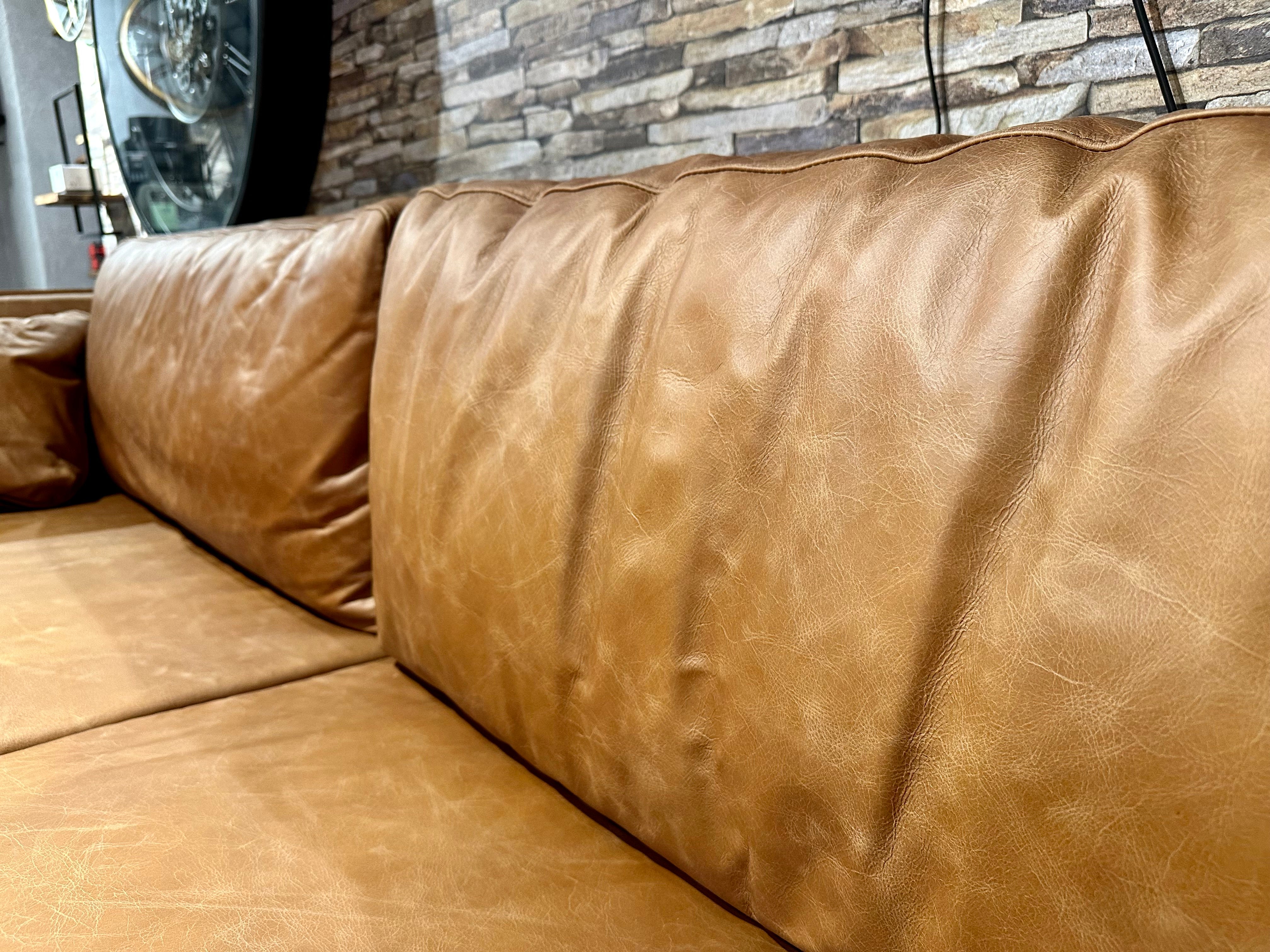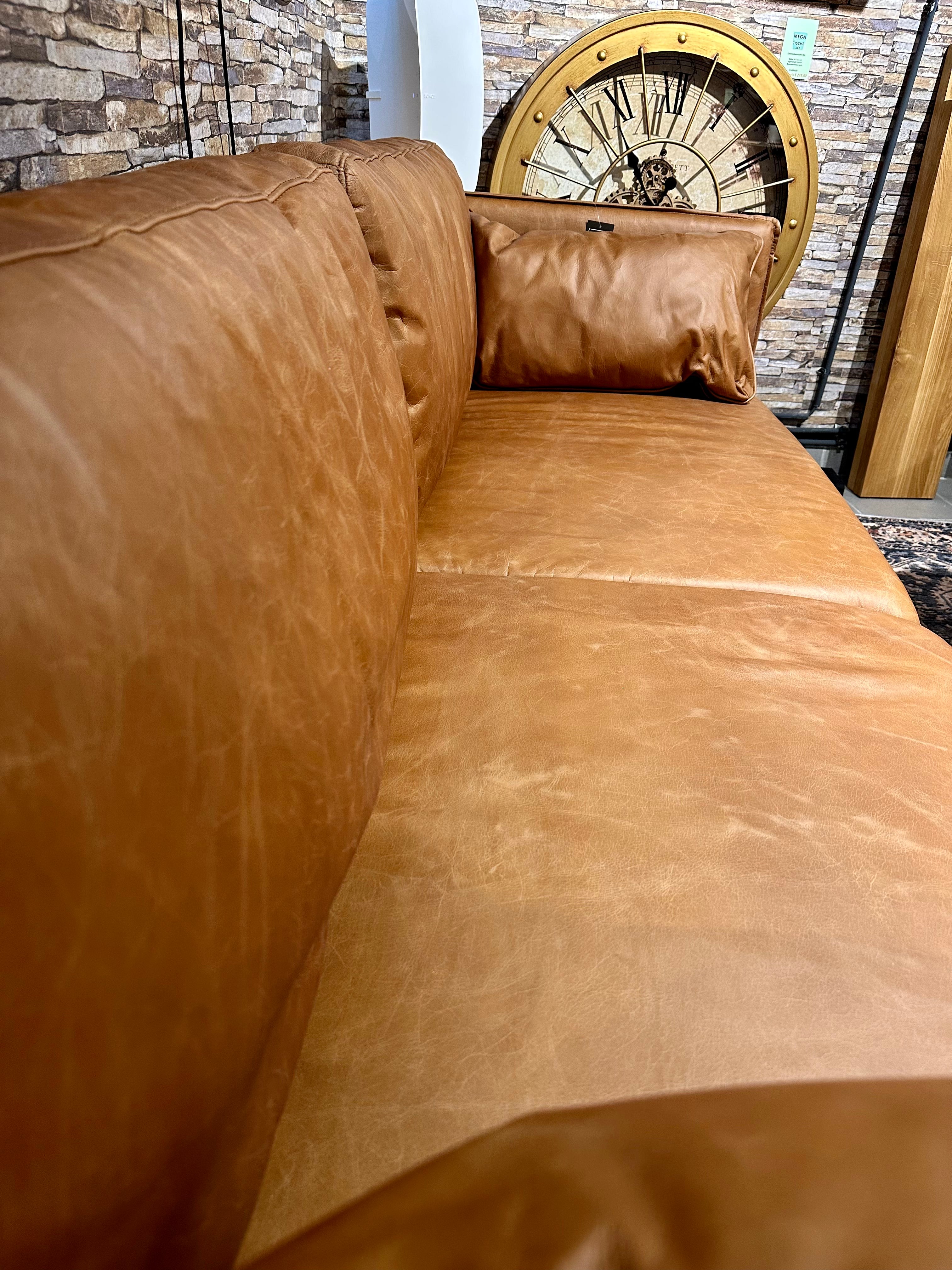 Eine tolle und sehr schöne Echtleder Couch im Vintage Look und aus feinstem Kamelleder in der Farbe Cognac braun.