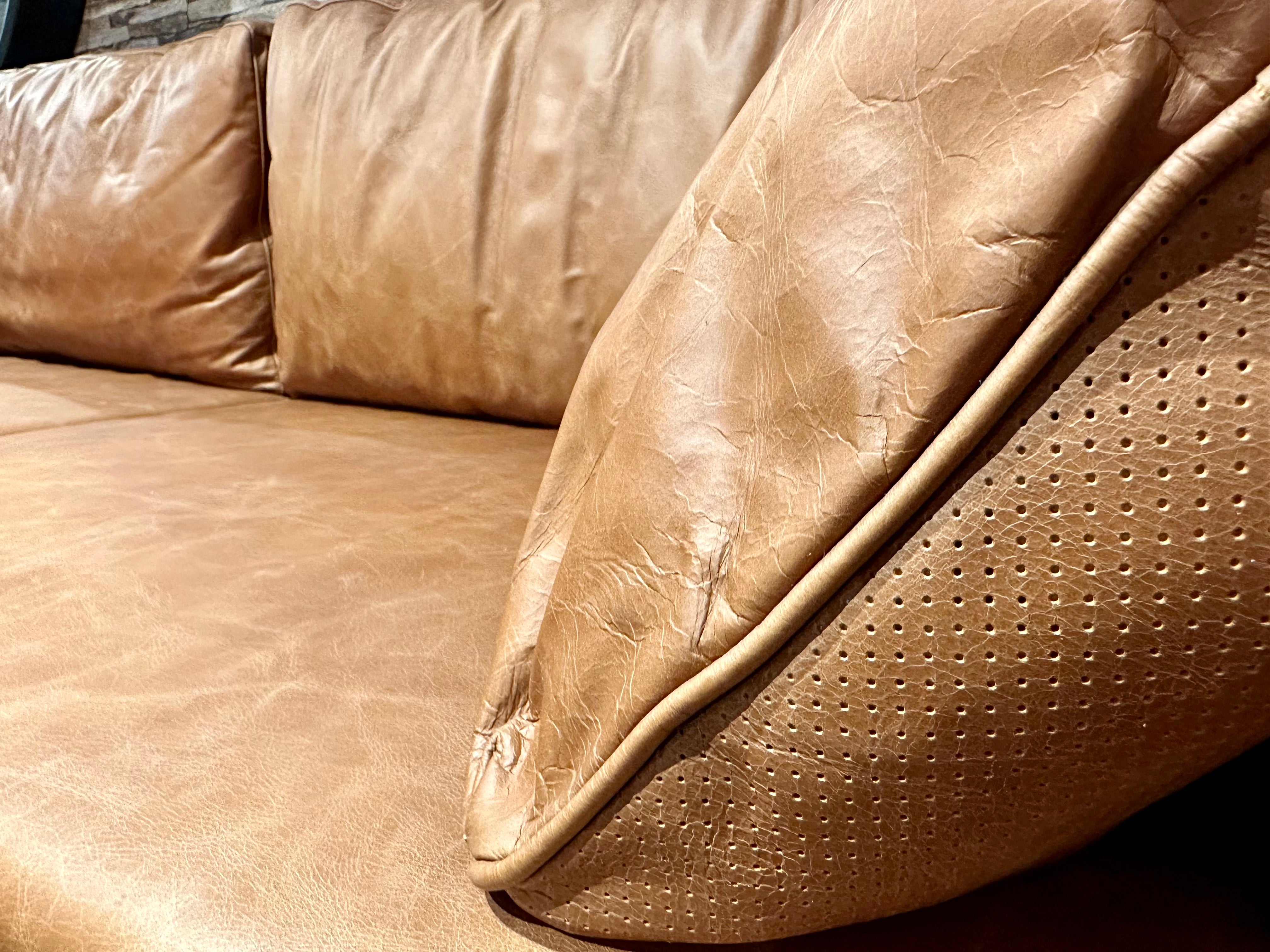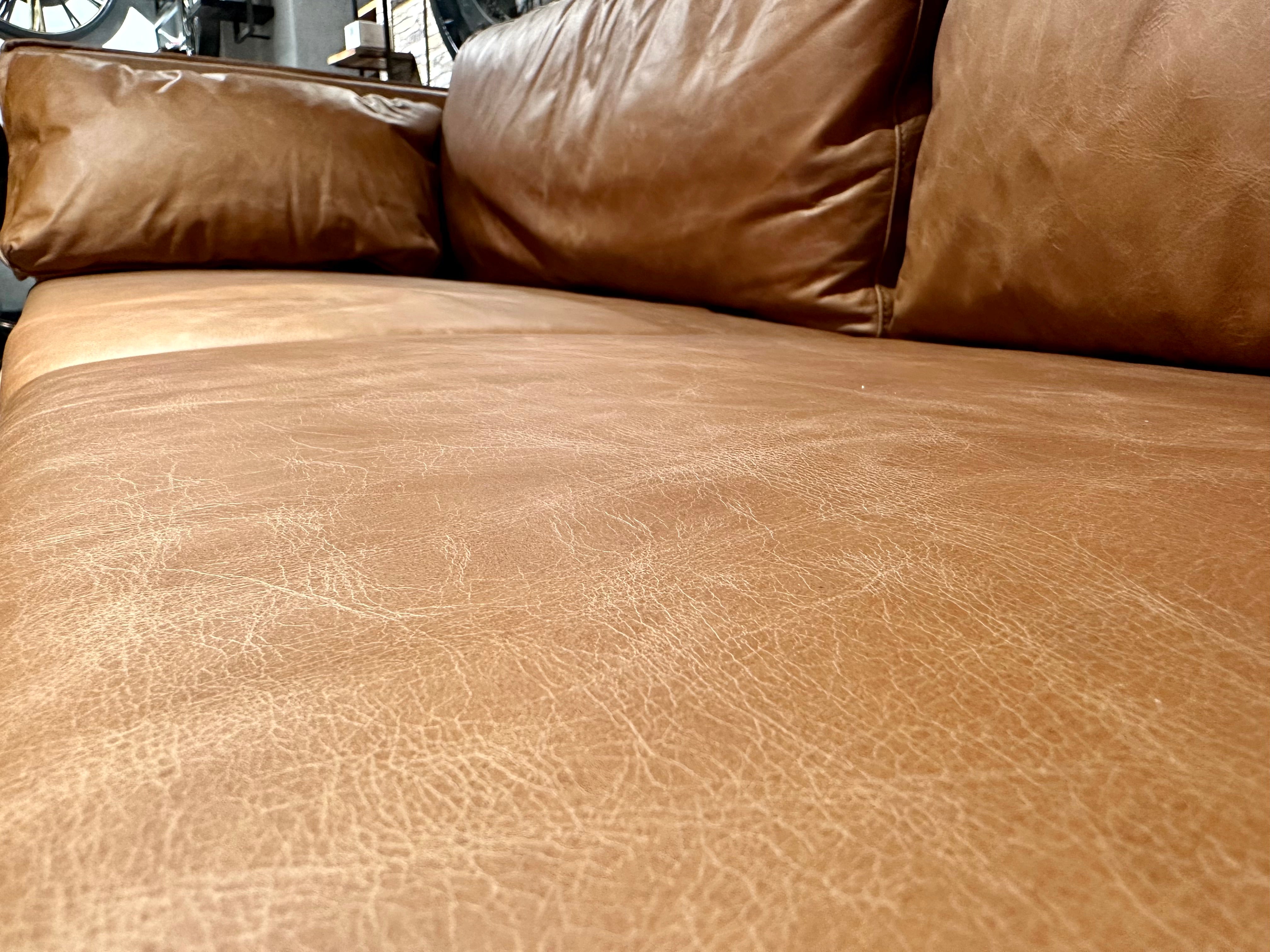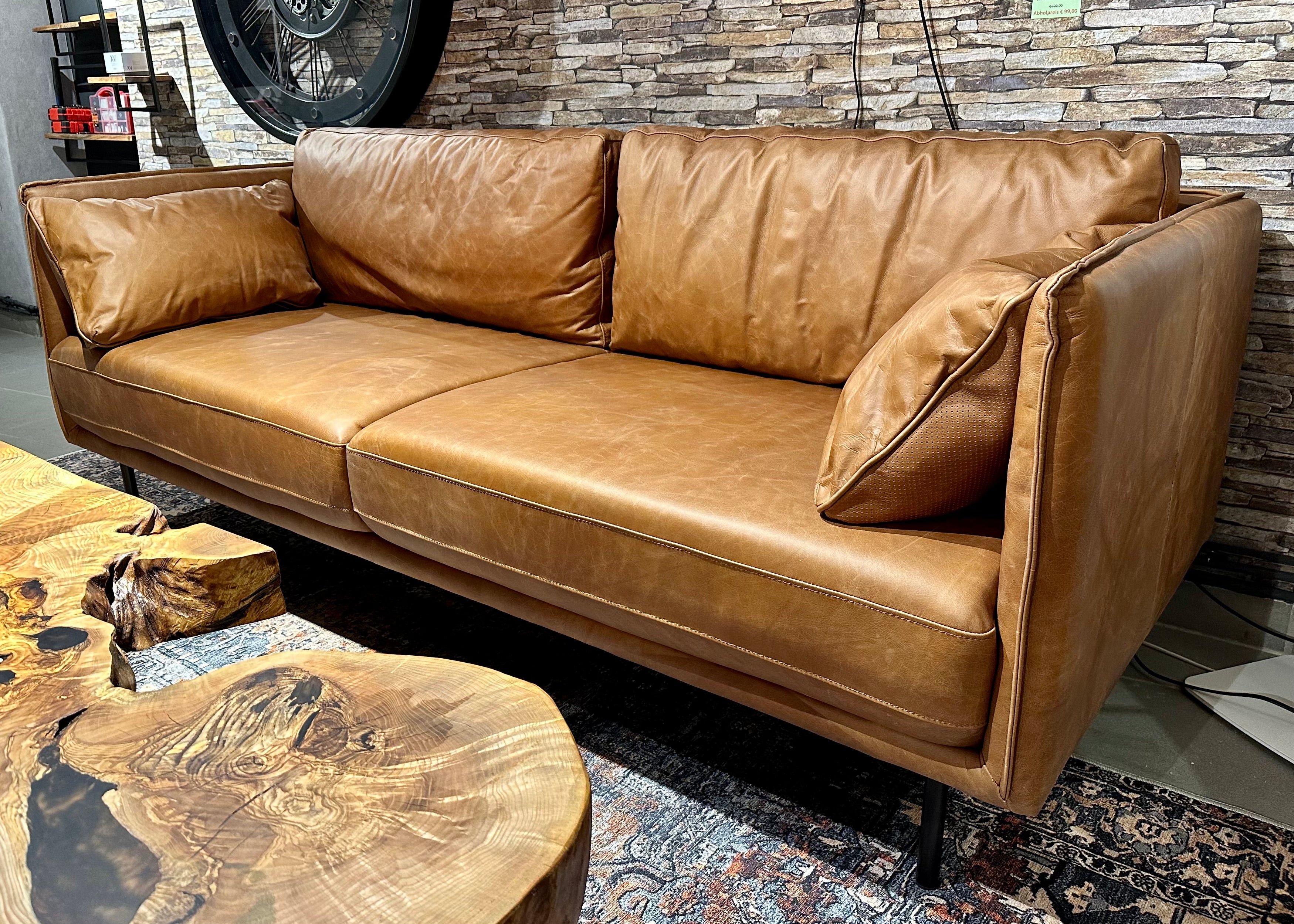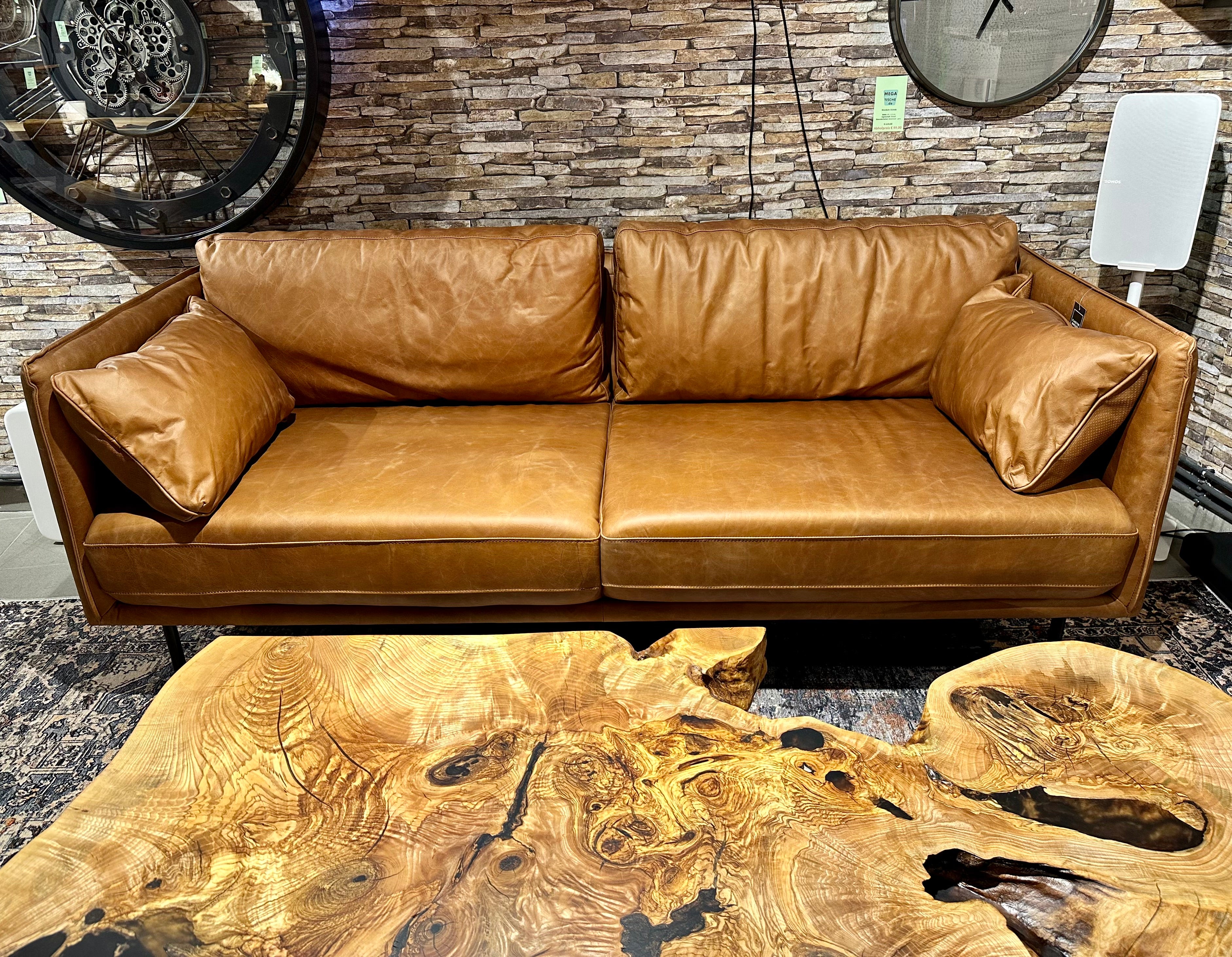 Eine tolle und sehr schöne Echtleder Couch im Vintage Look und aus feinstem Kamelleder in der Farbe Cognac braun.