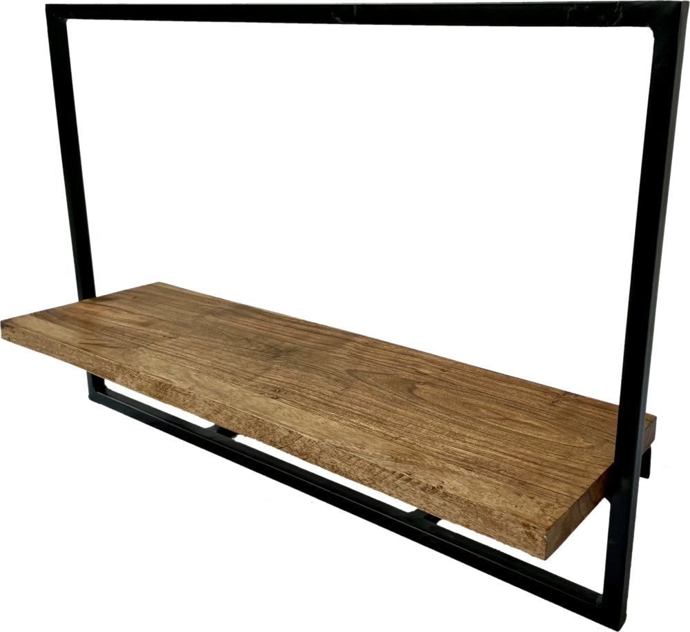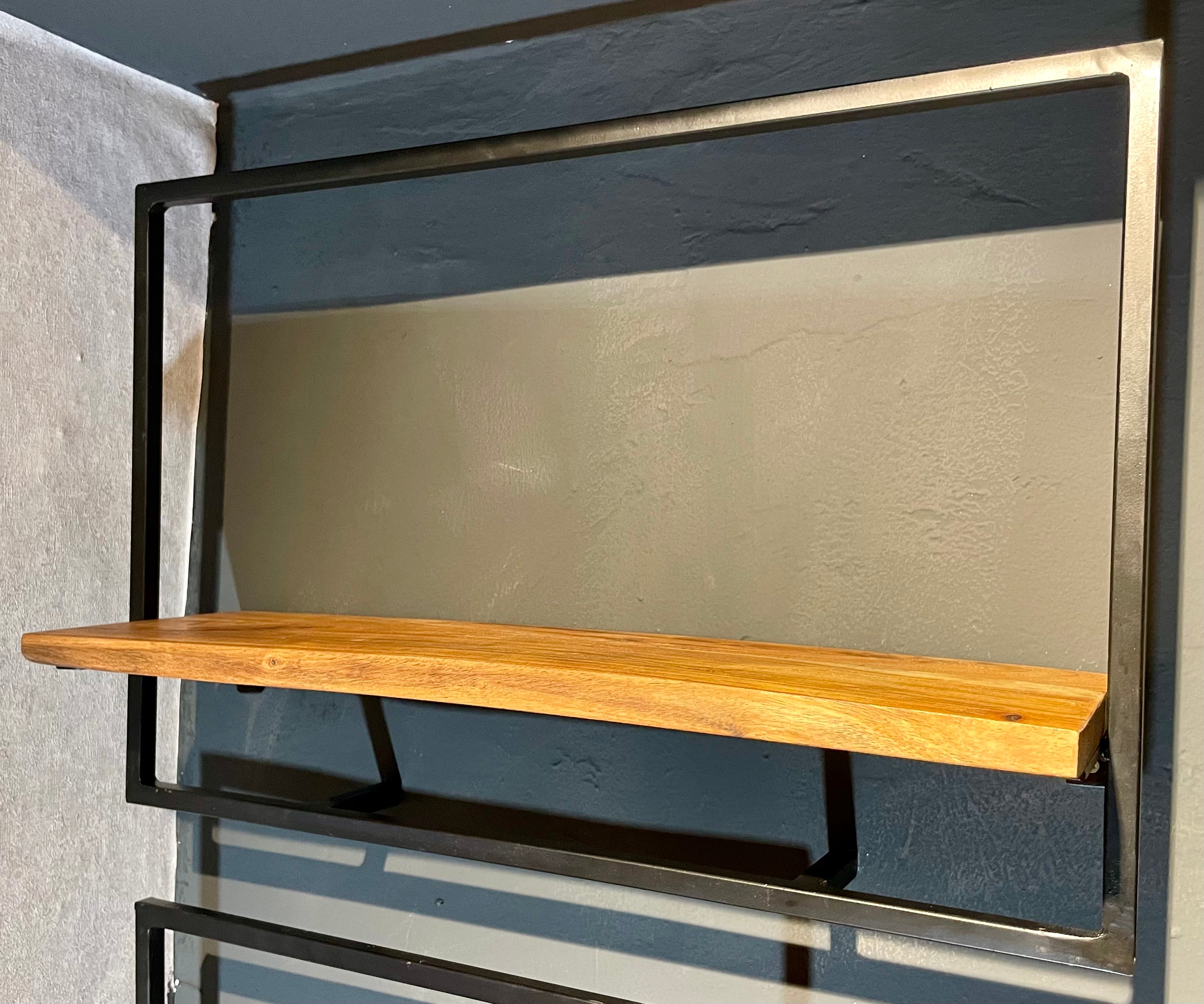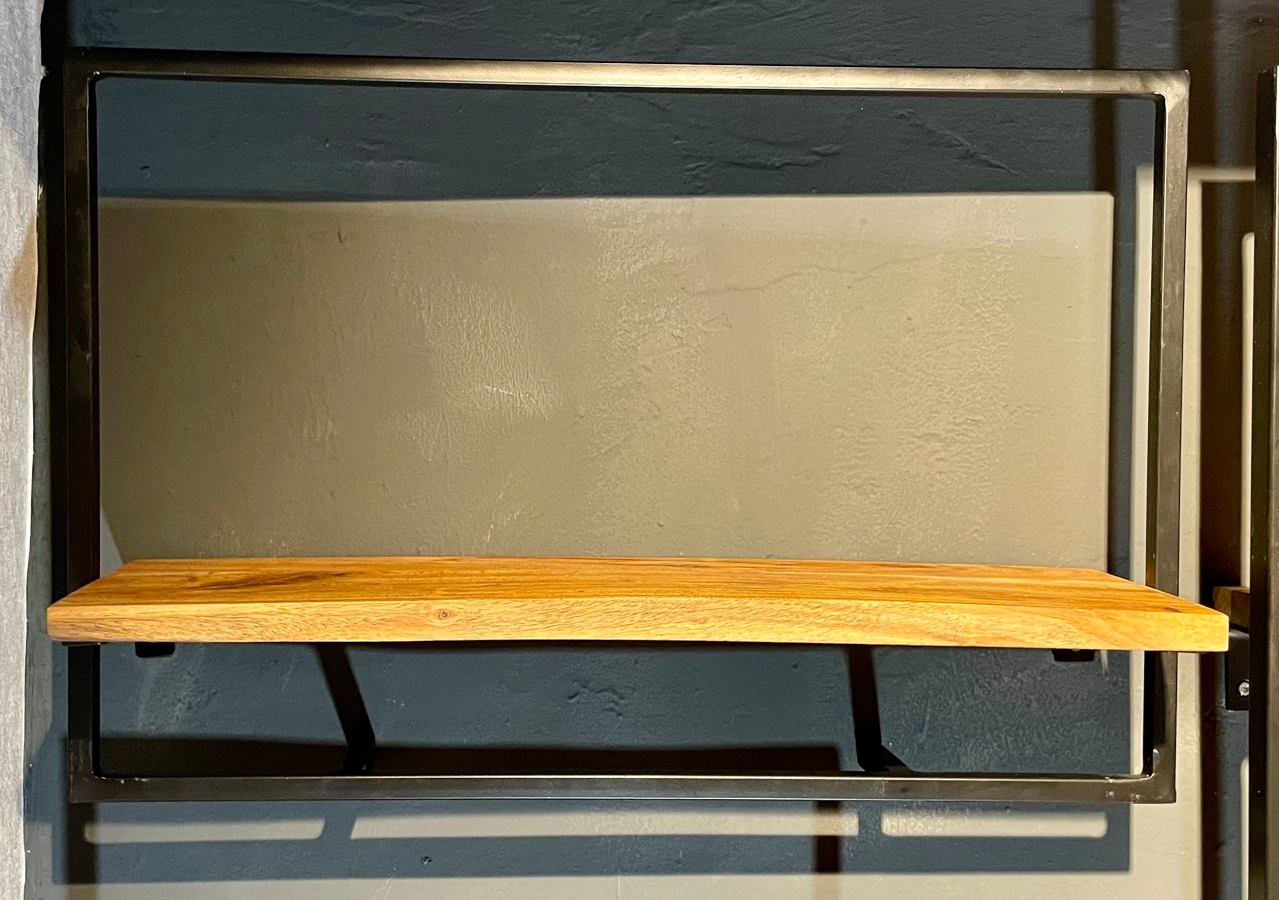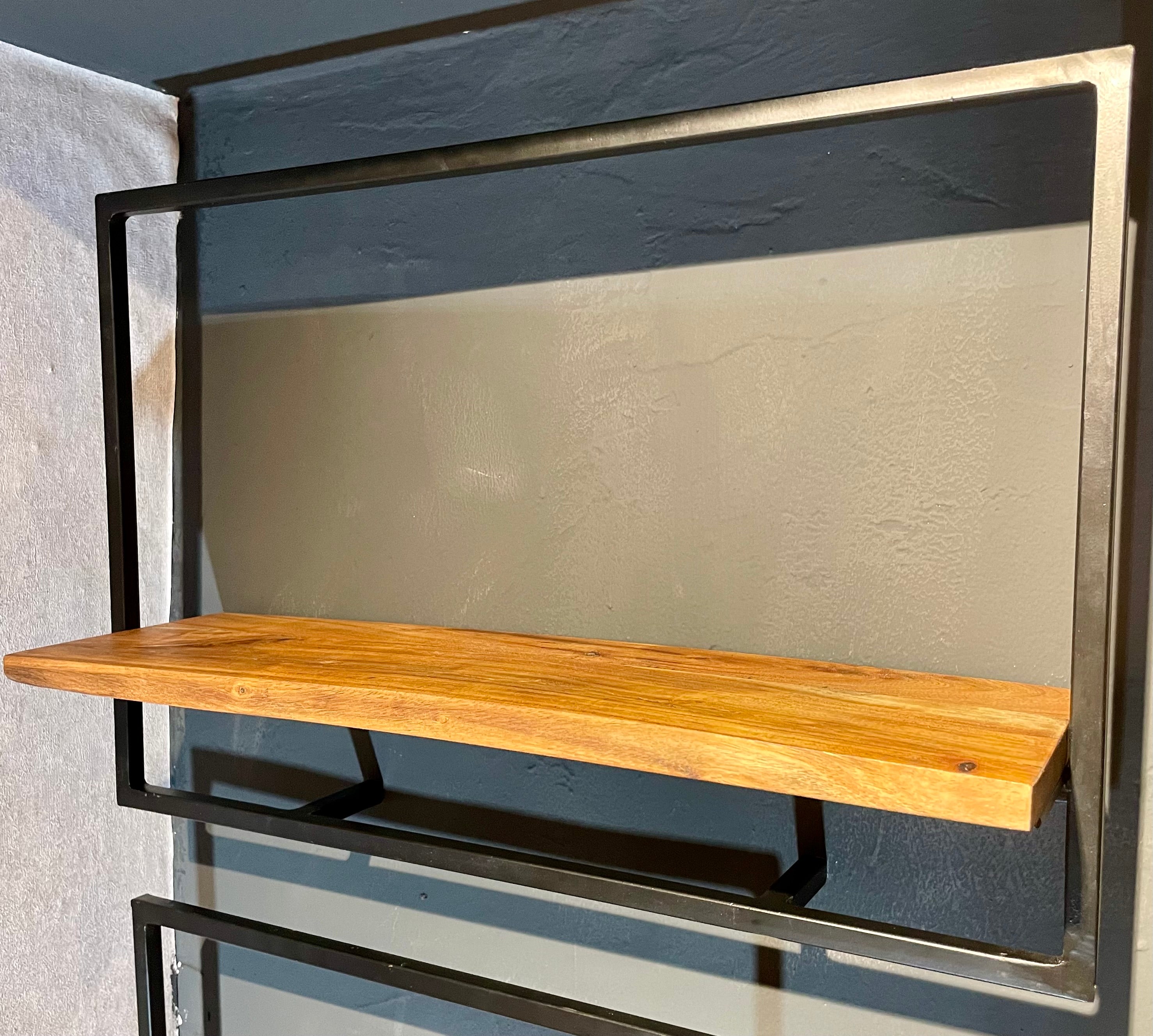 Wandregal Gr. L im industrial look aus massiven Mangoholz (leicht geölt) und mit einer Metallfassung.