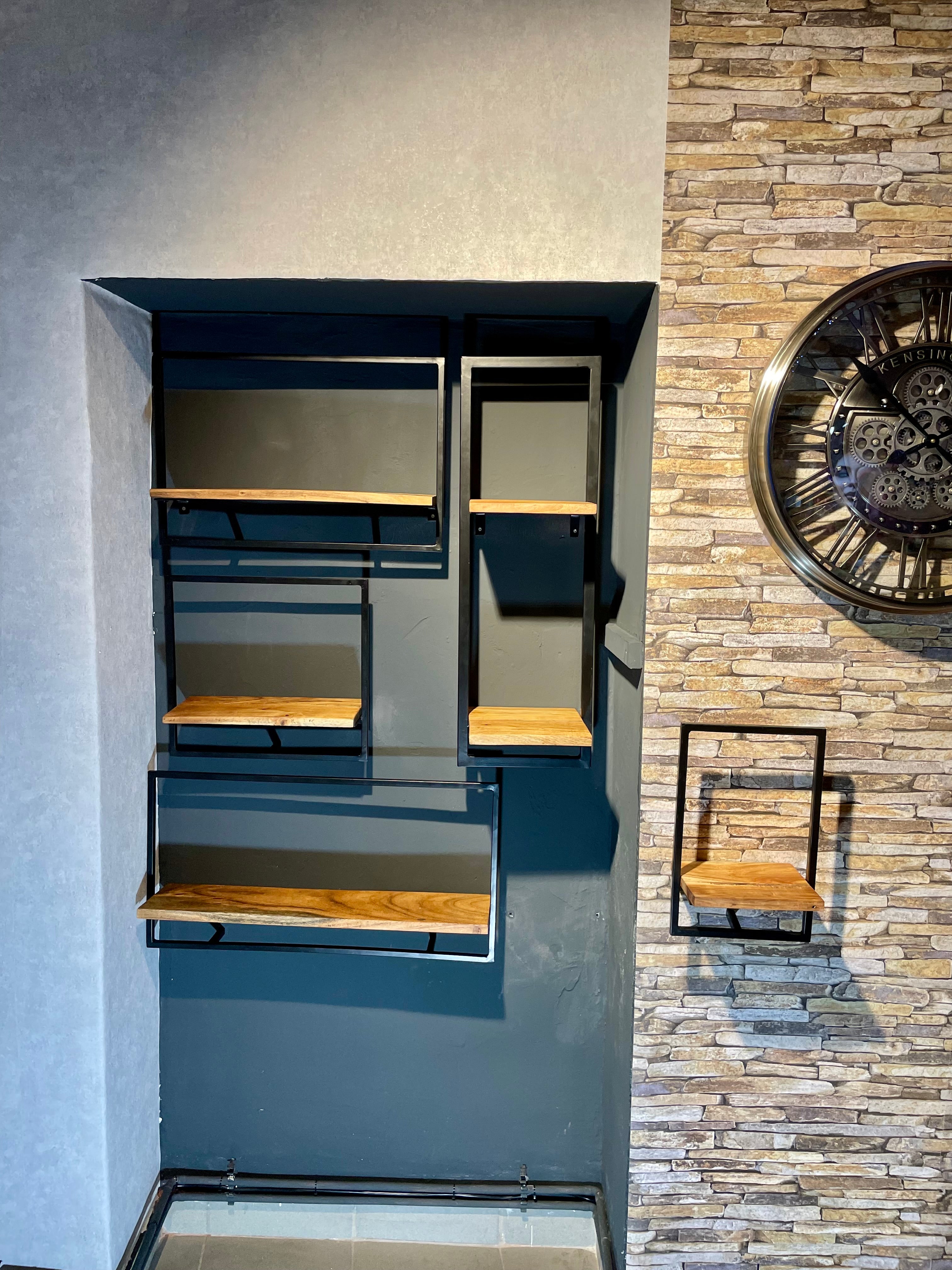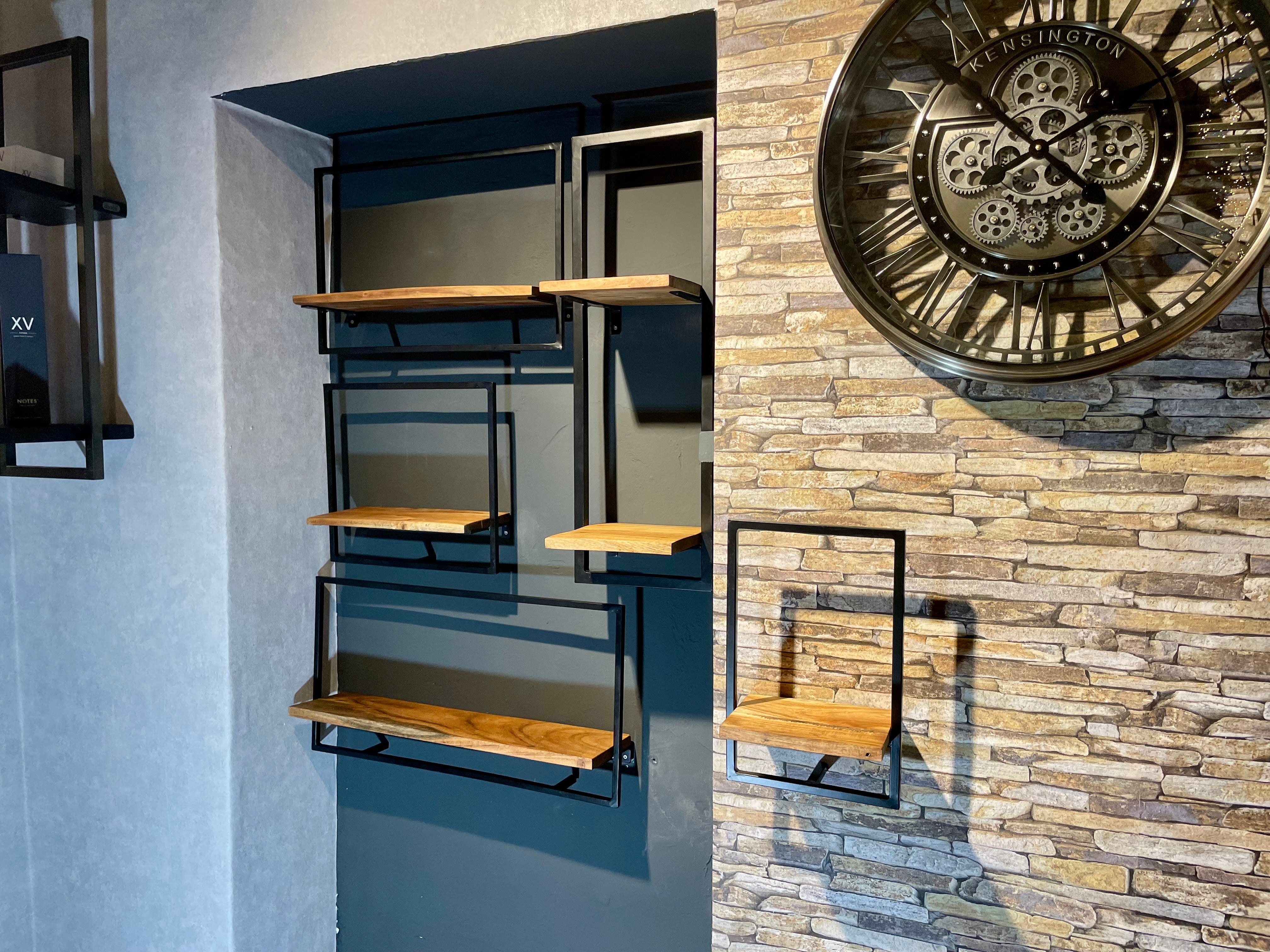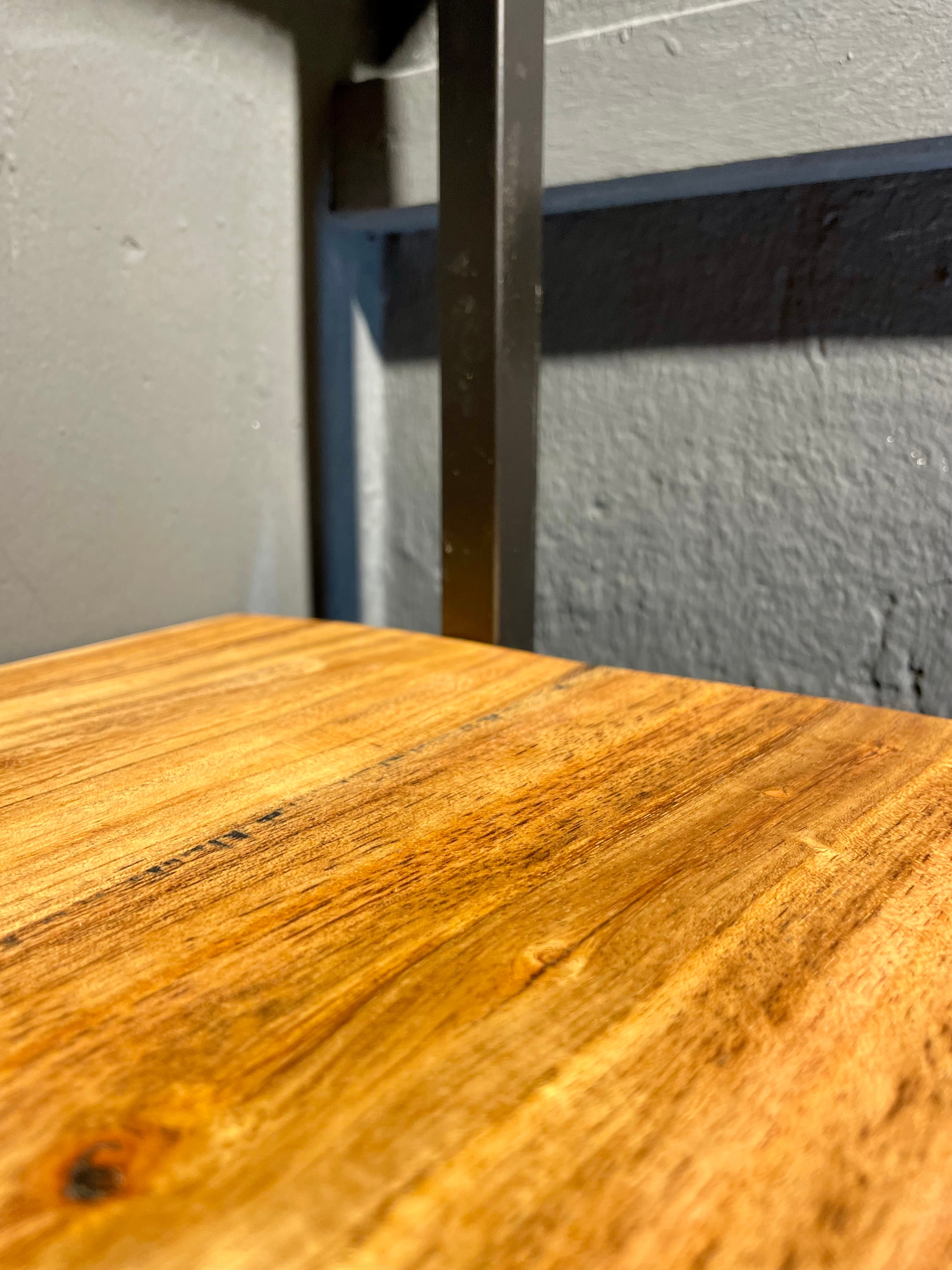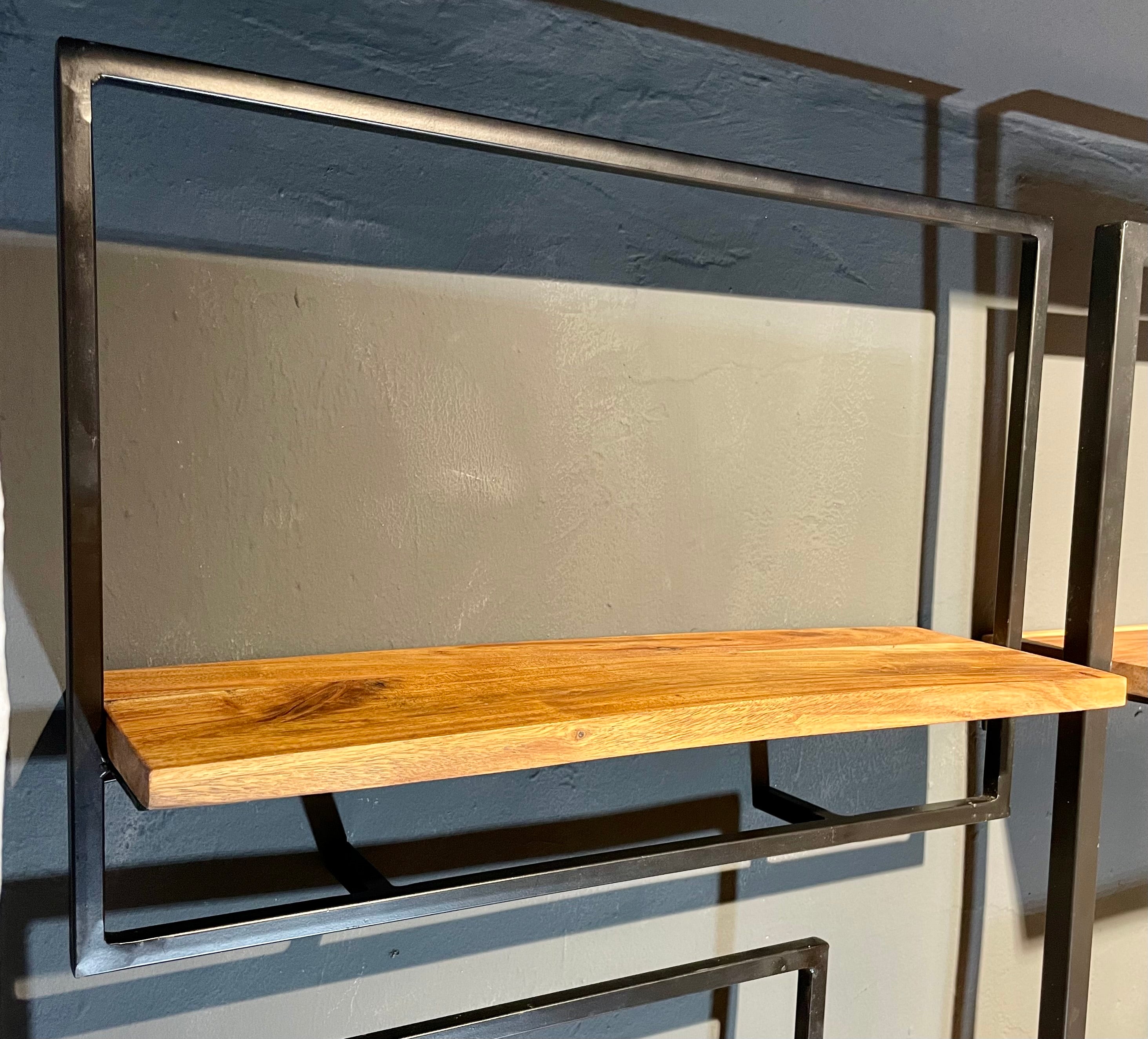 Wandregal Gr. L im industrial look aus massiven Mangoholz (leicht geölt) und mit einer Metallfassung.