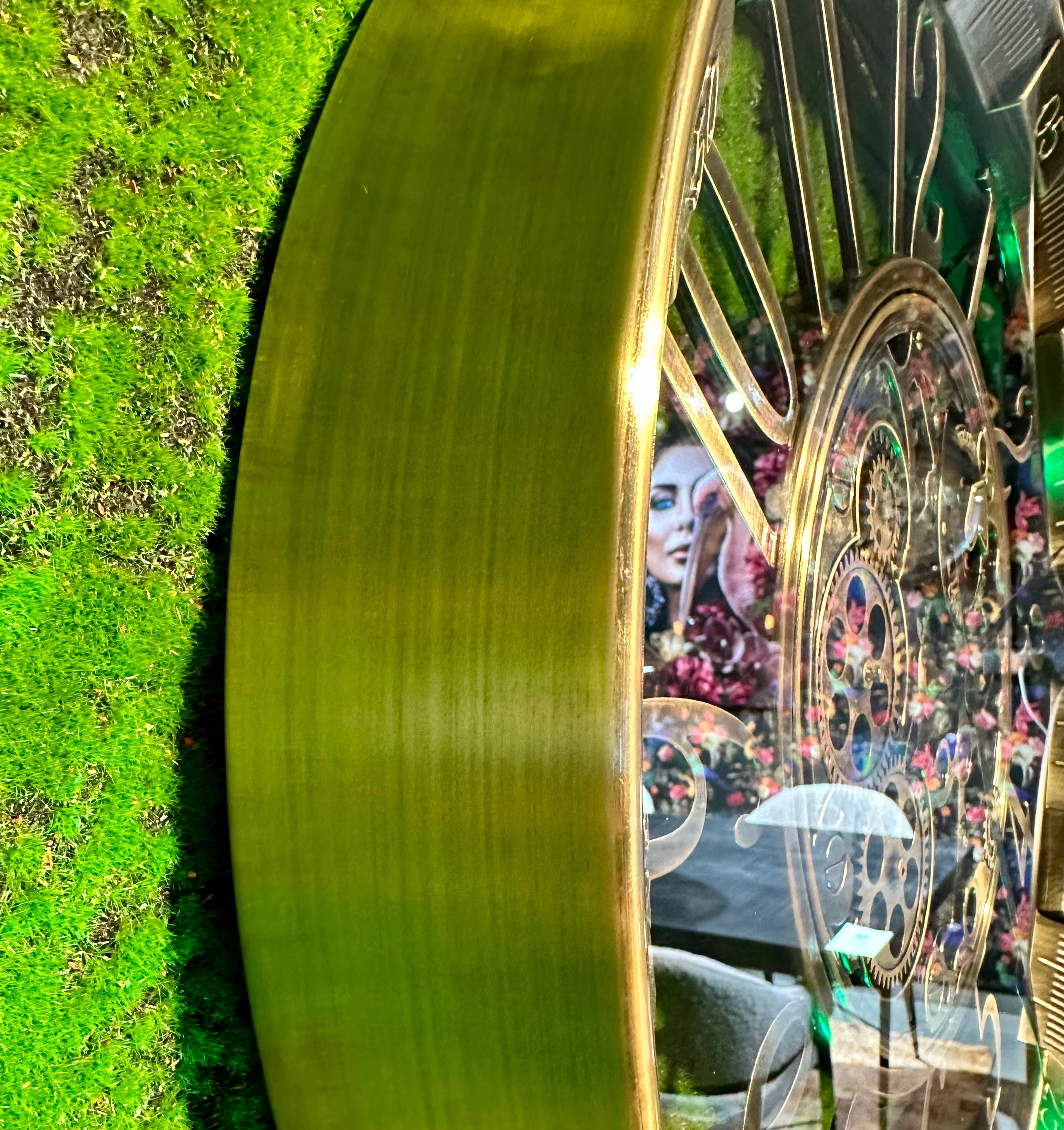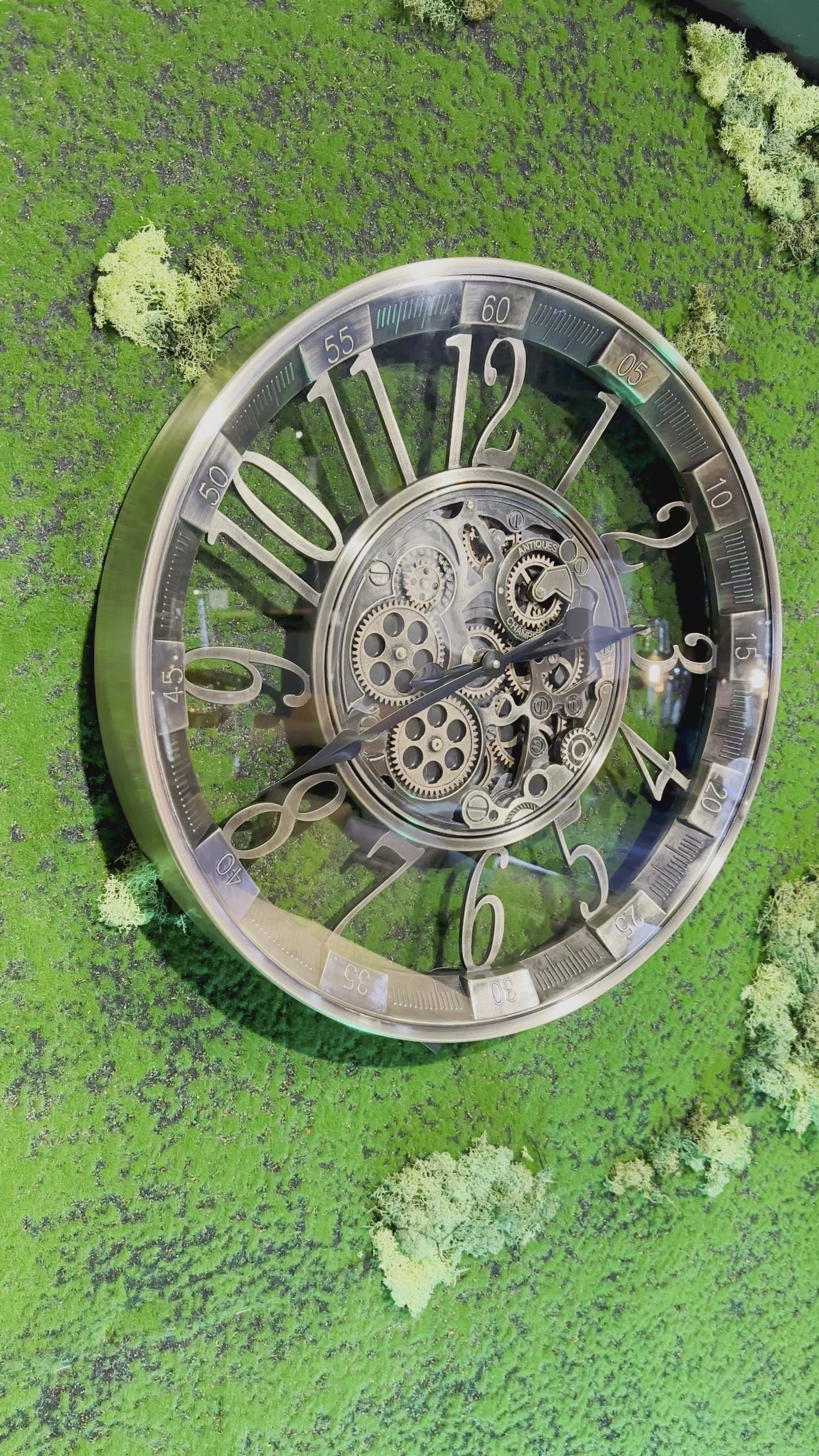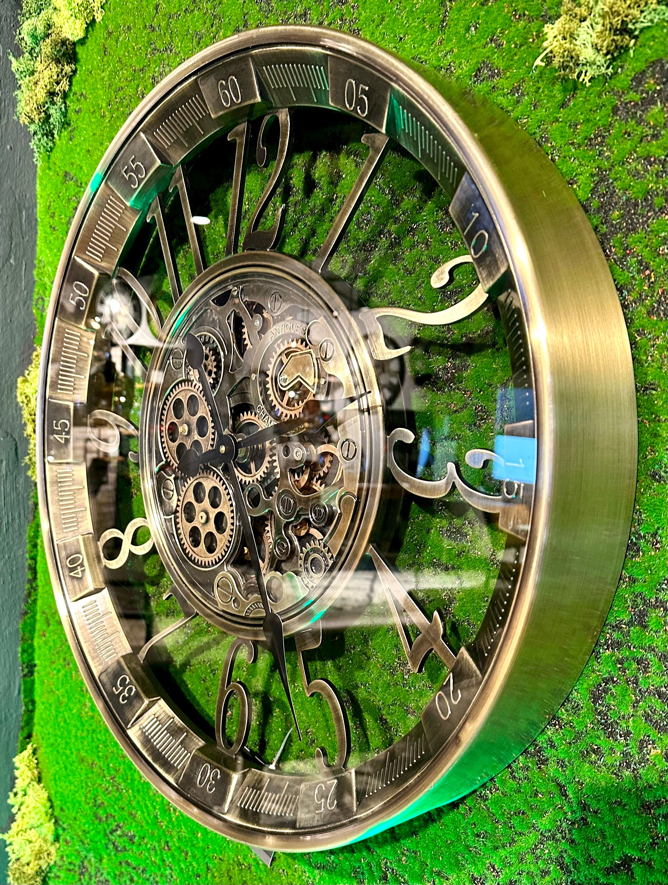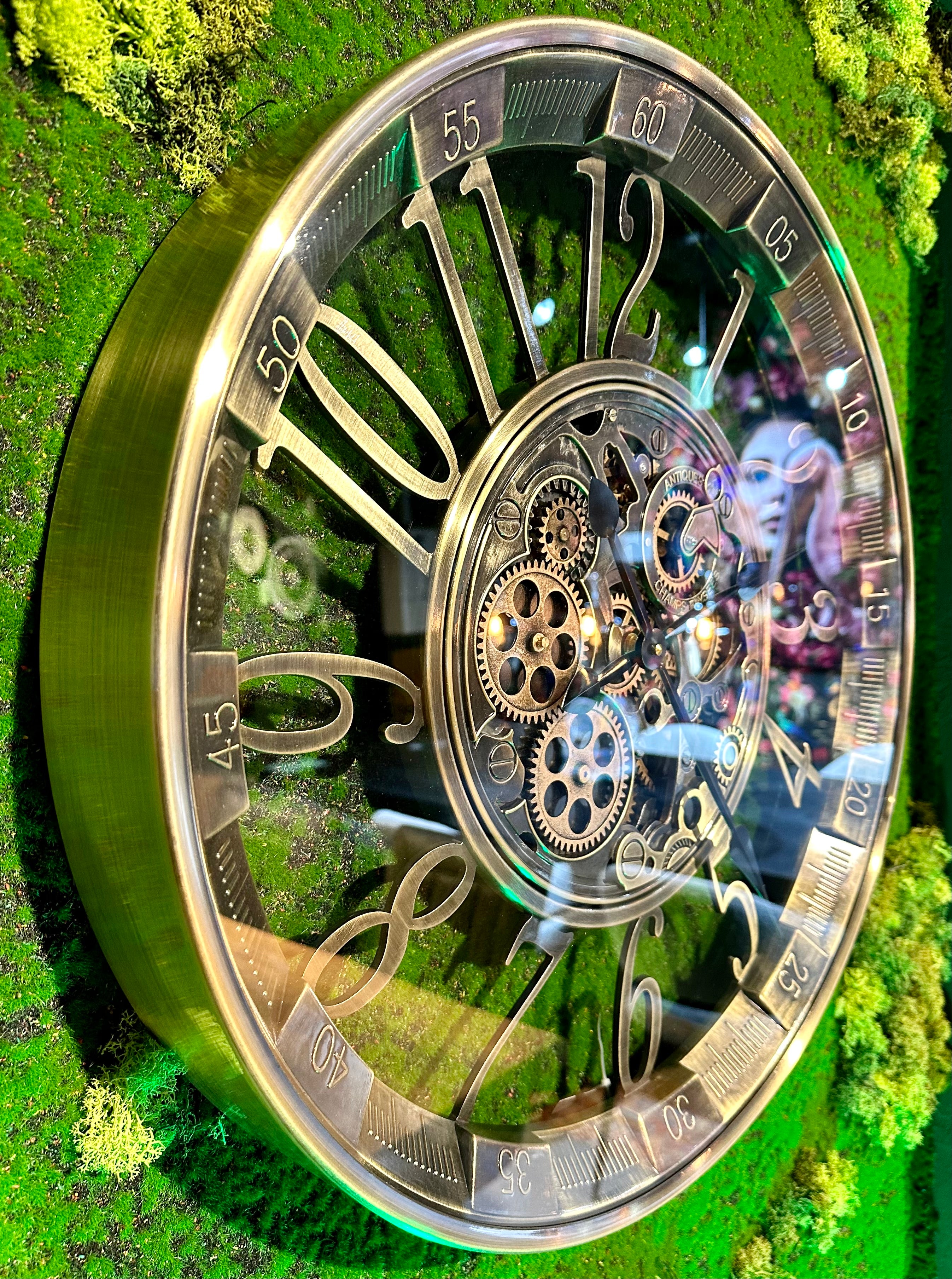 Die Annimationsuhr mit Zahnrädern hat eine Glasscheibe und ein Zifferblatt mit arabischen Zahlen und Sekundenangaben. Sie ist sehr schön und passt in eine Umgebung, die im Industrielook gestaltet ist, jedoch passt Sie auch in ein modernes Zimmer/ Wohnung oder Haus.
