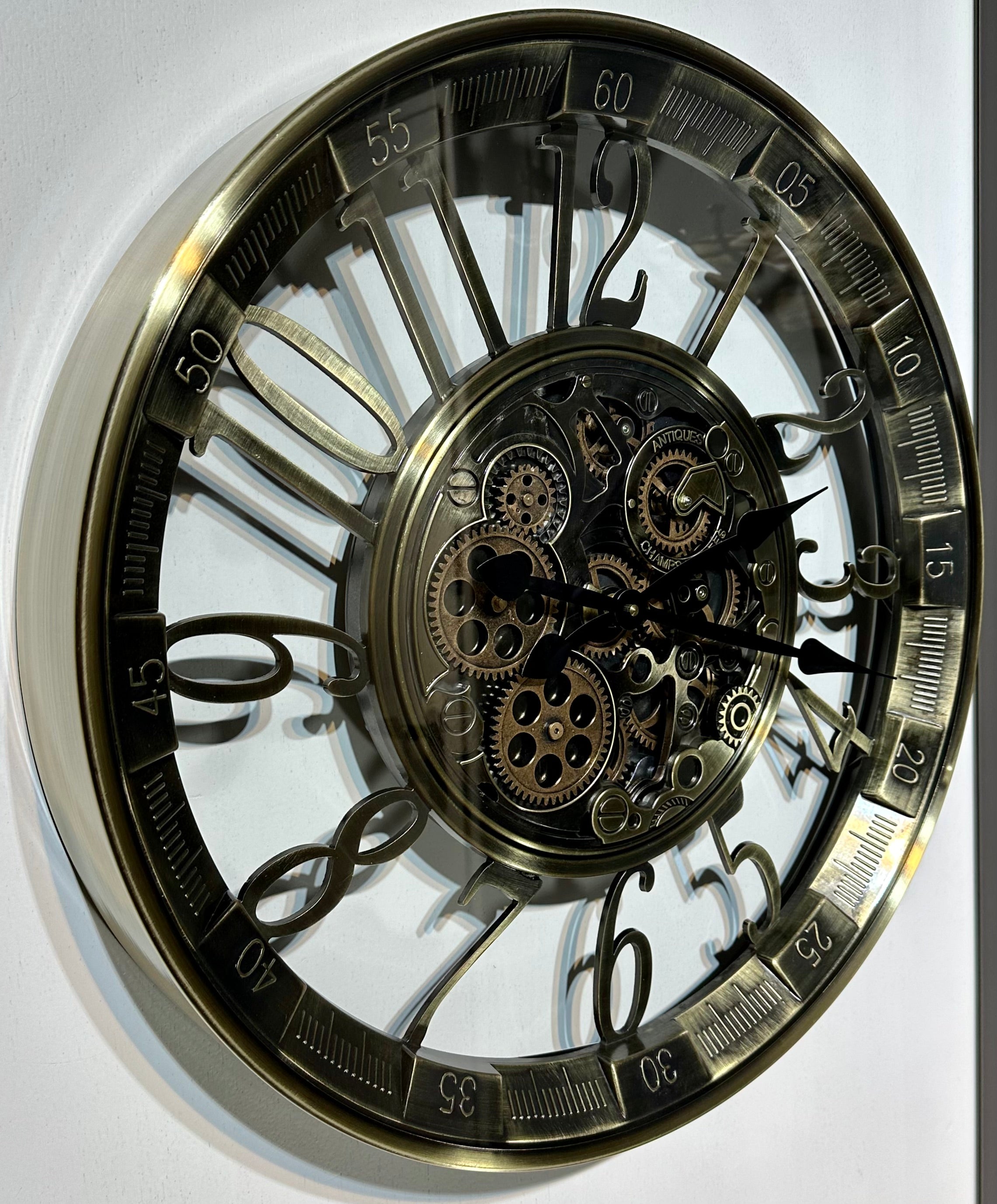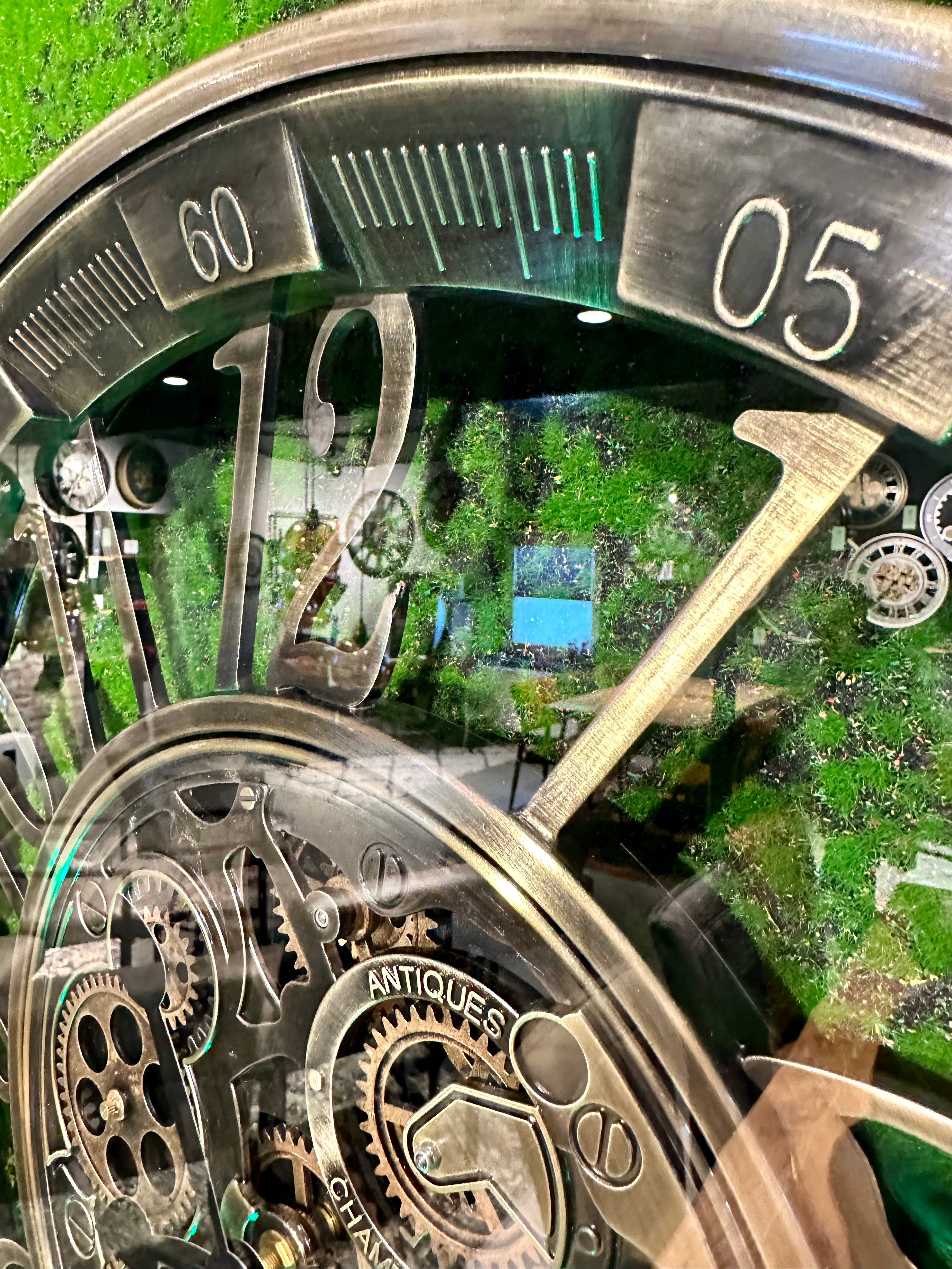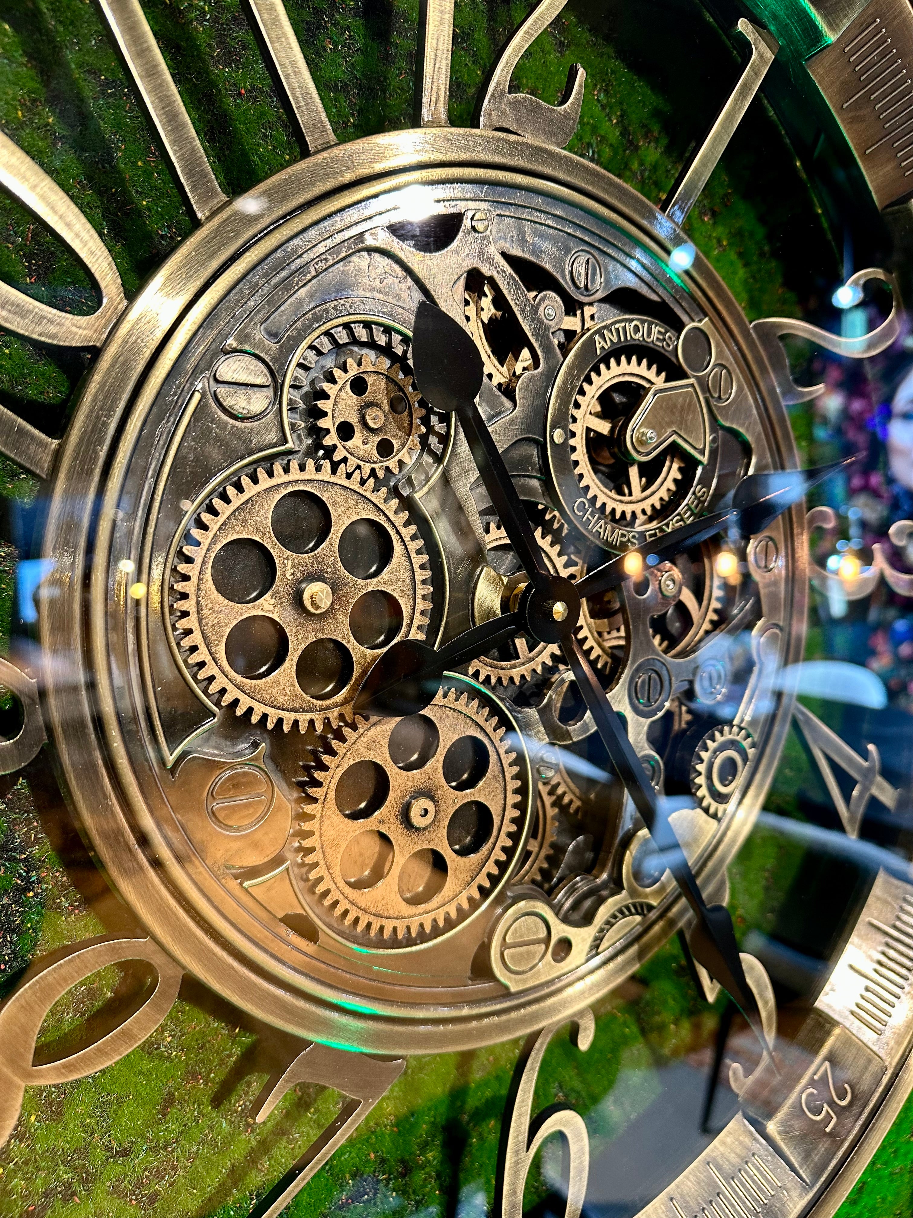 Die Uhr hat eine Aufschrift "Antiques" und "Champs Elysees" in der Nähe der Zahnrädchen.