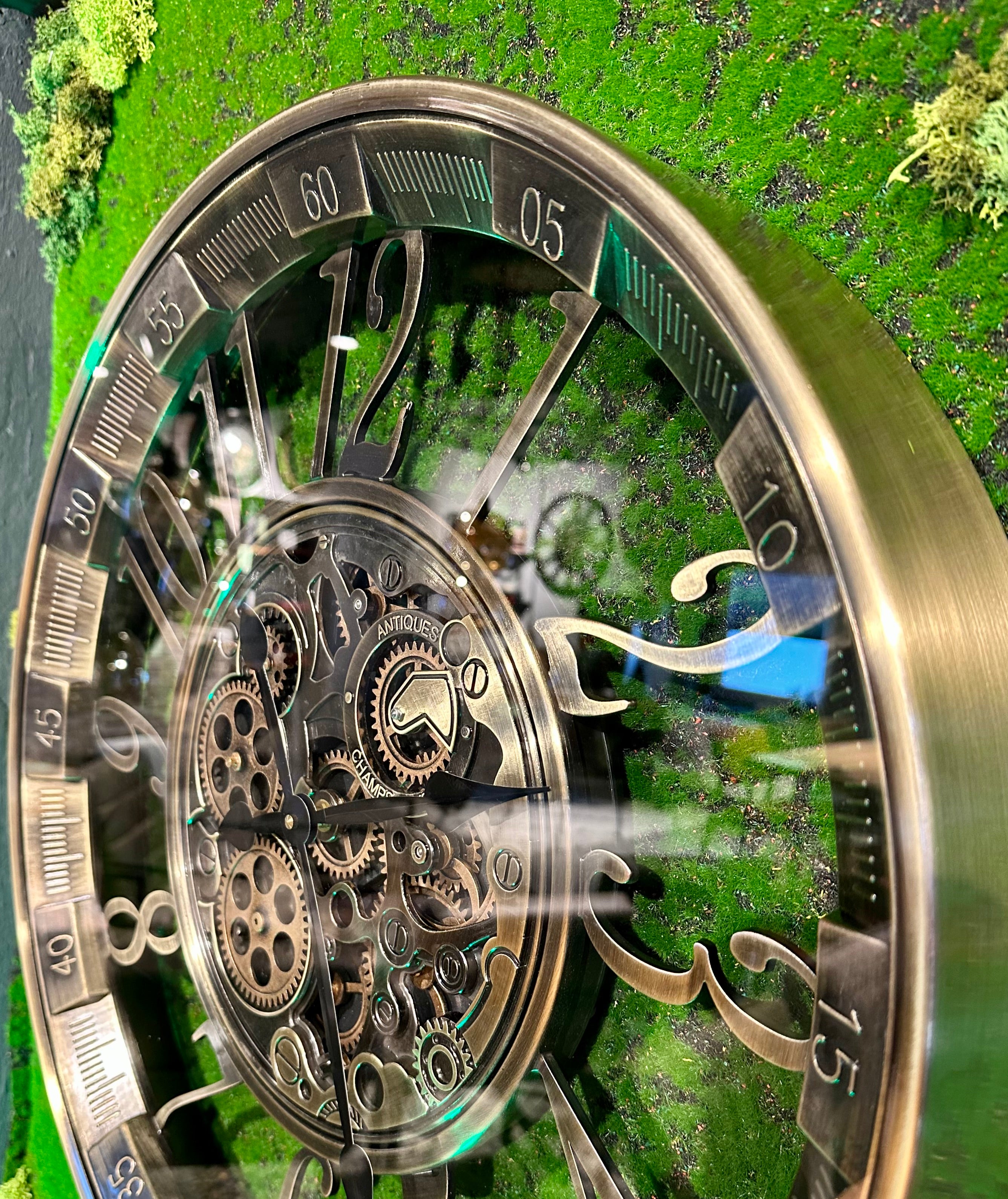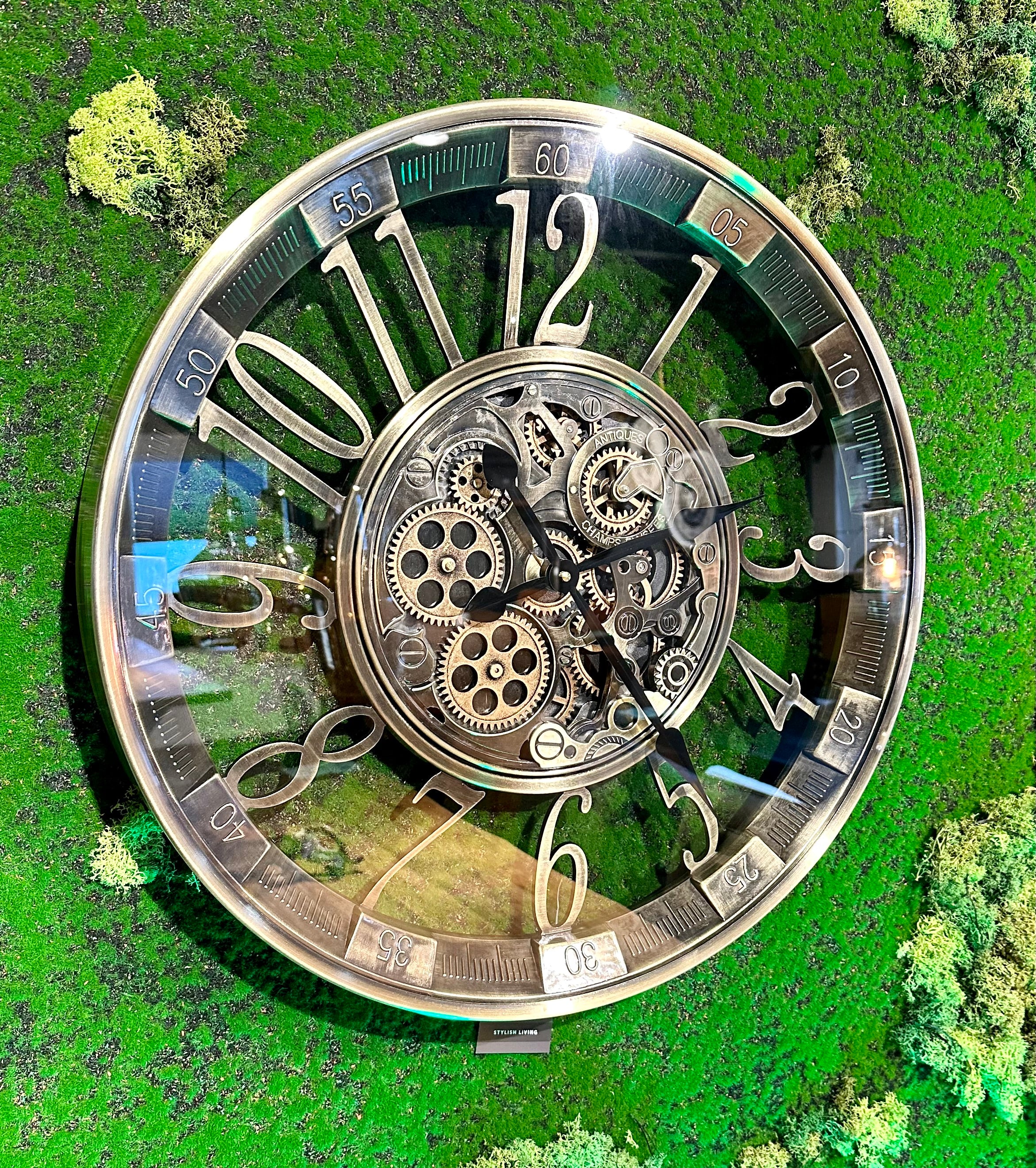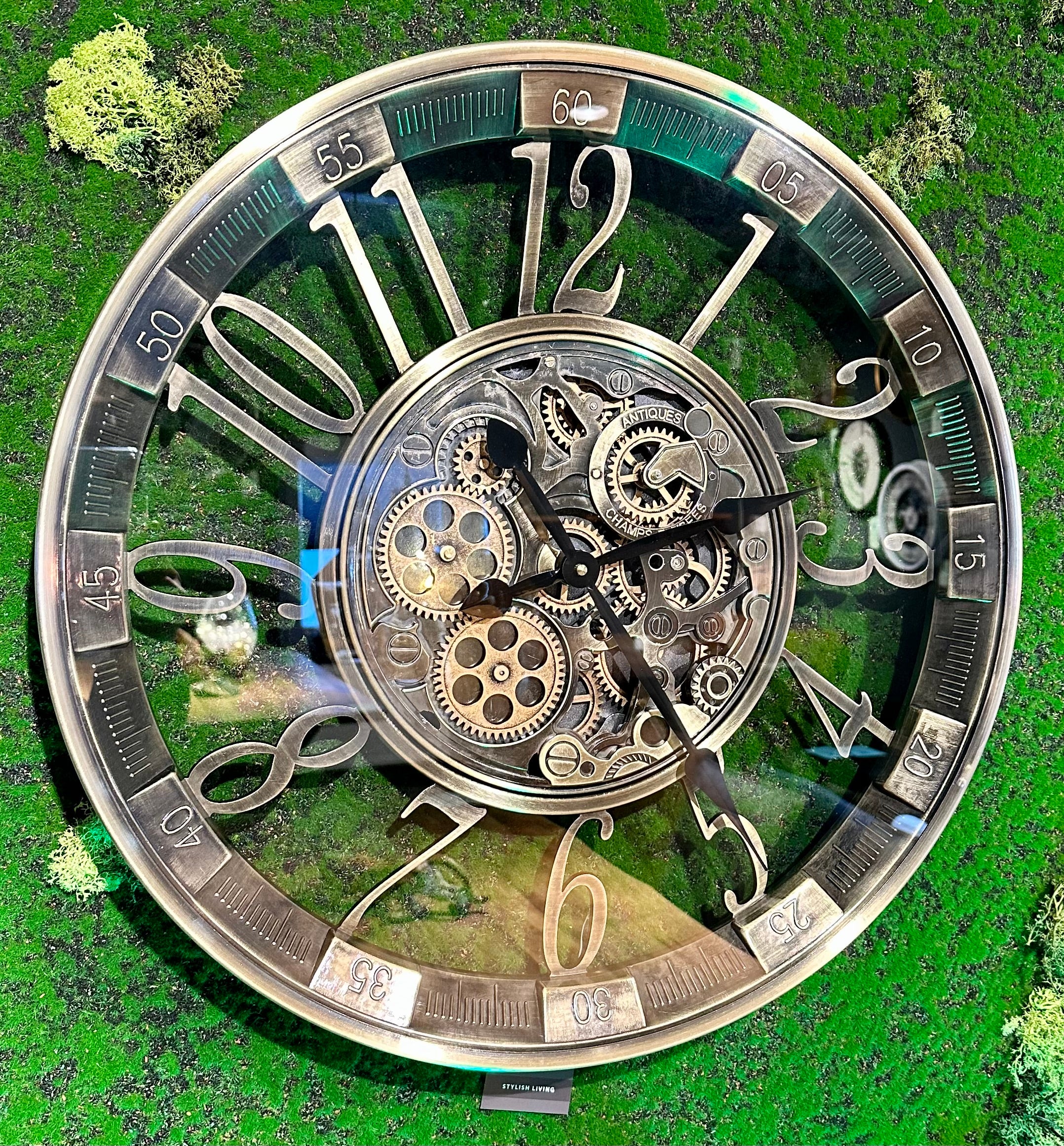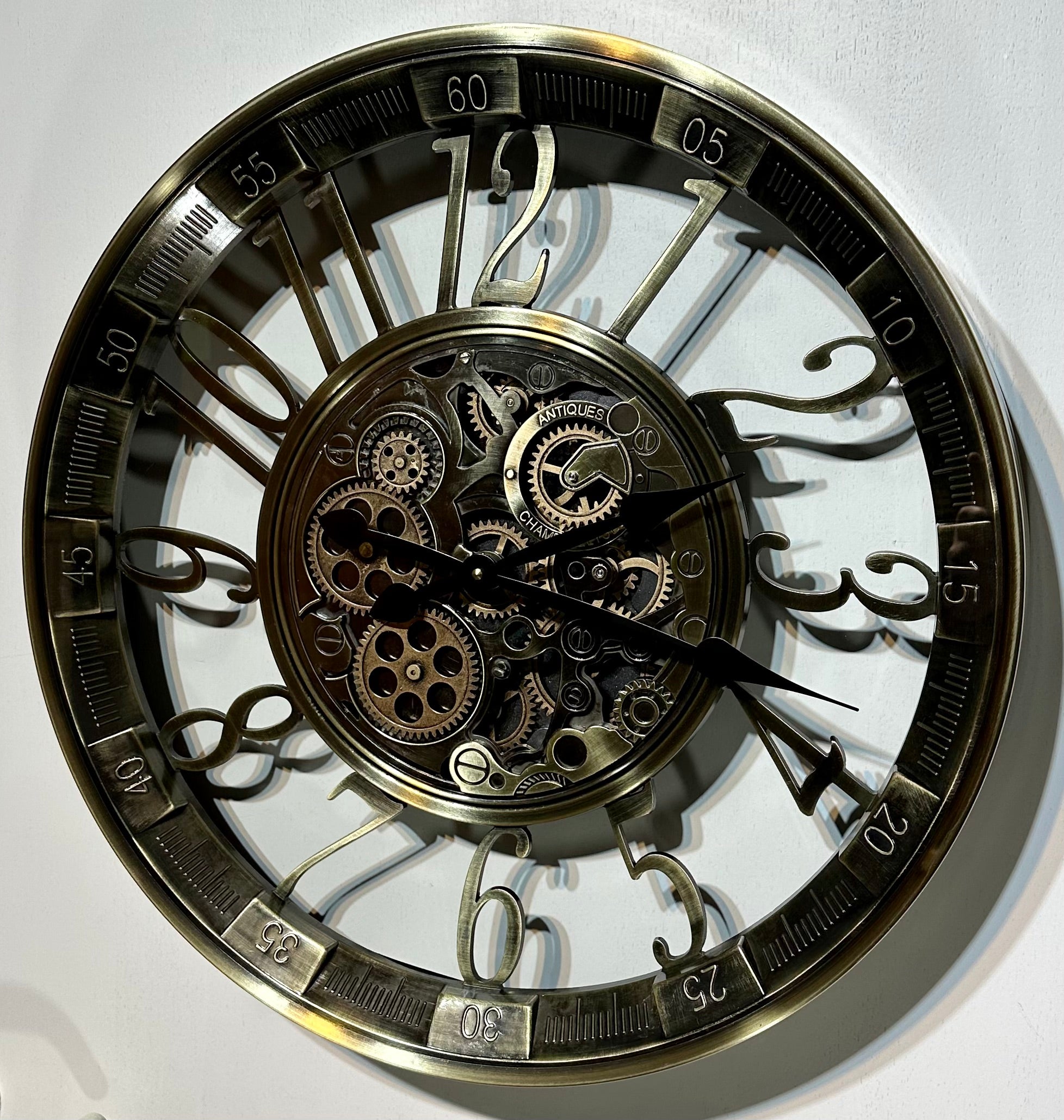 Die Uhr hat eine Aufschrift "Antiques" und "Champs Elysees" in der Nähe der Zahnrädchen.