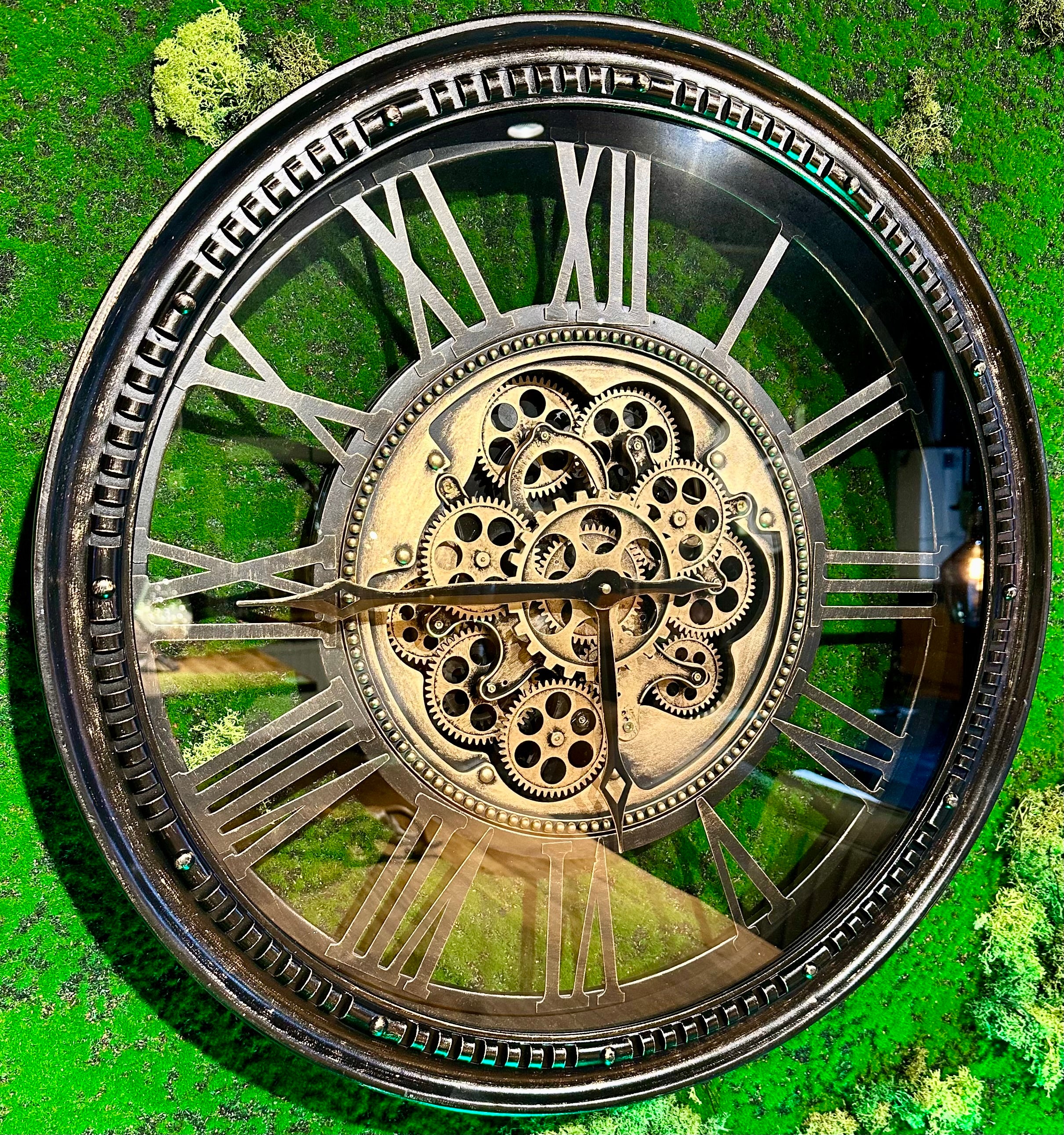 Wanduhr PRAG Zahnrad schwarz-gold Metall Zählwerk 63 cm