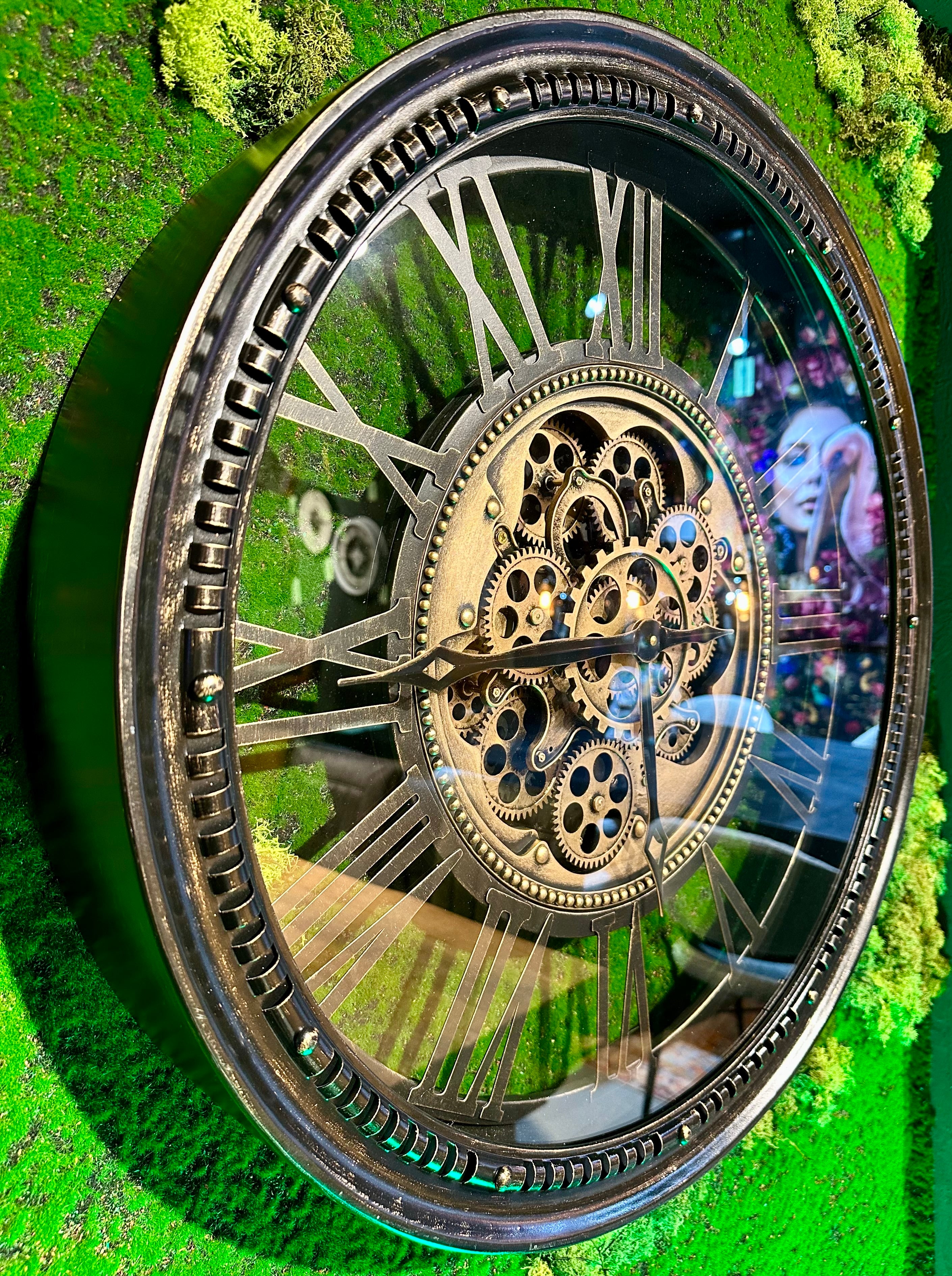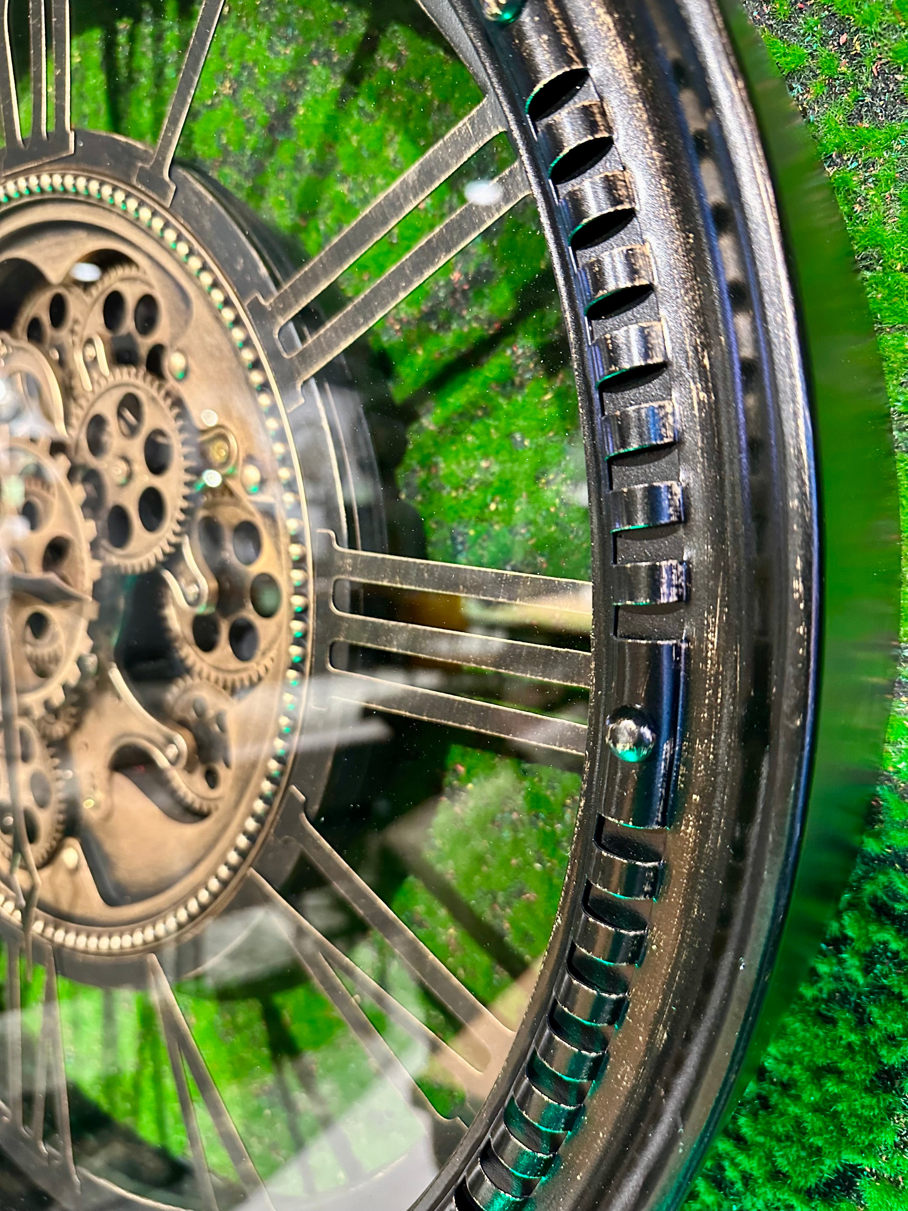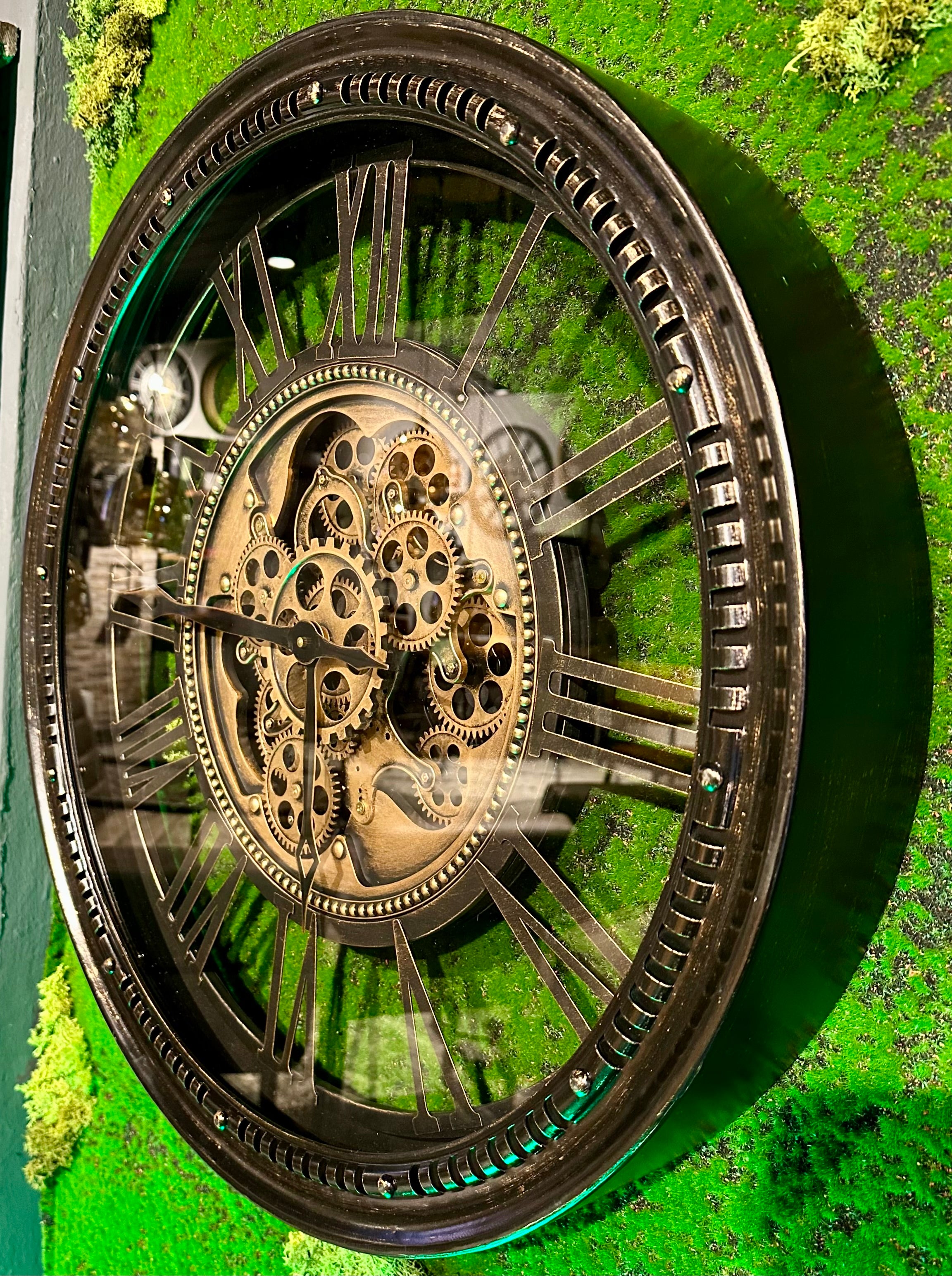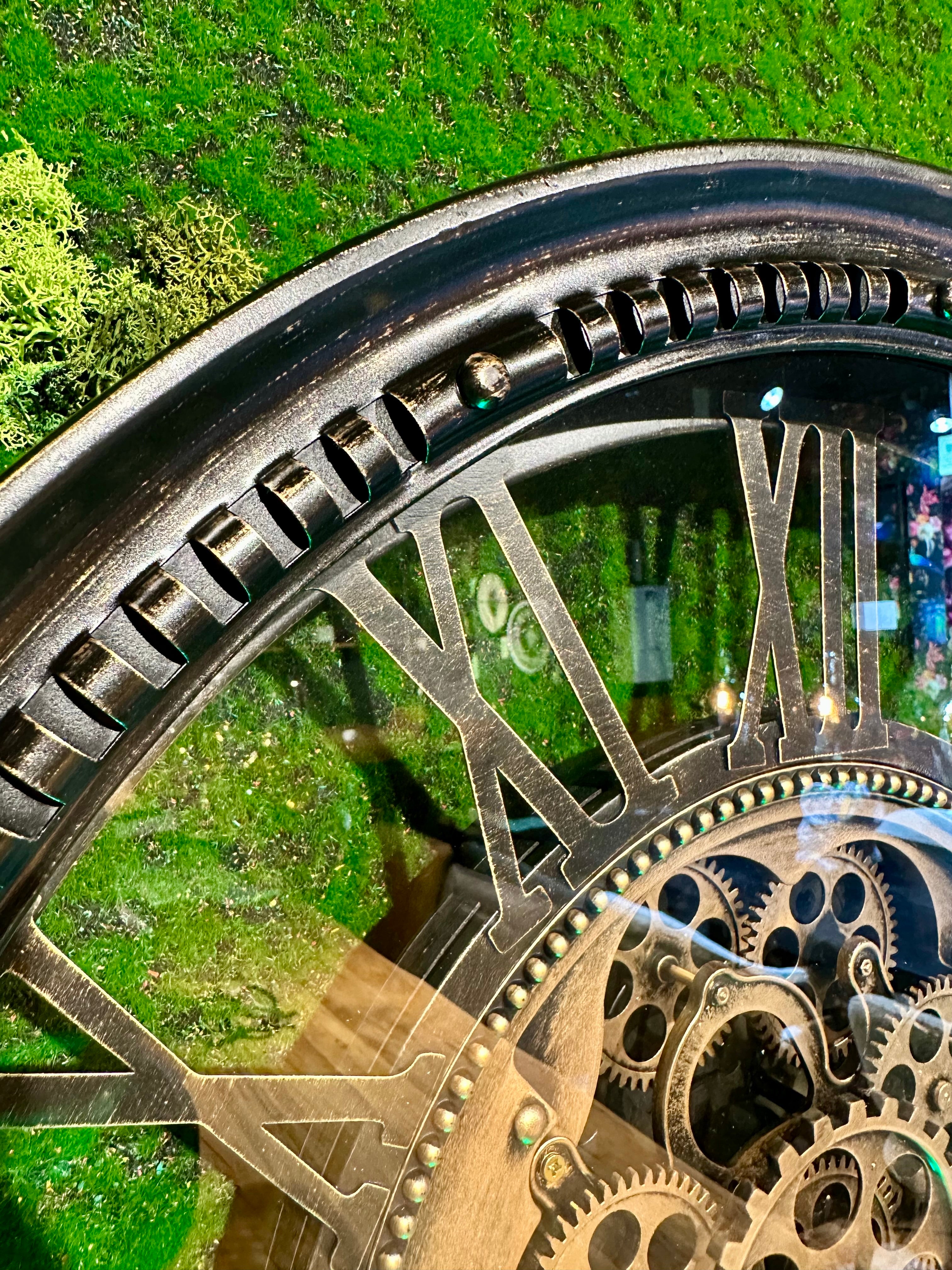 Eine exklusive und auffällige Wanduhr mit Animation (Zählwerk dreht sich) in antikschwarz-gold mit Metallrahmen, Zählwerk und Metallziffenblatt.